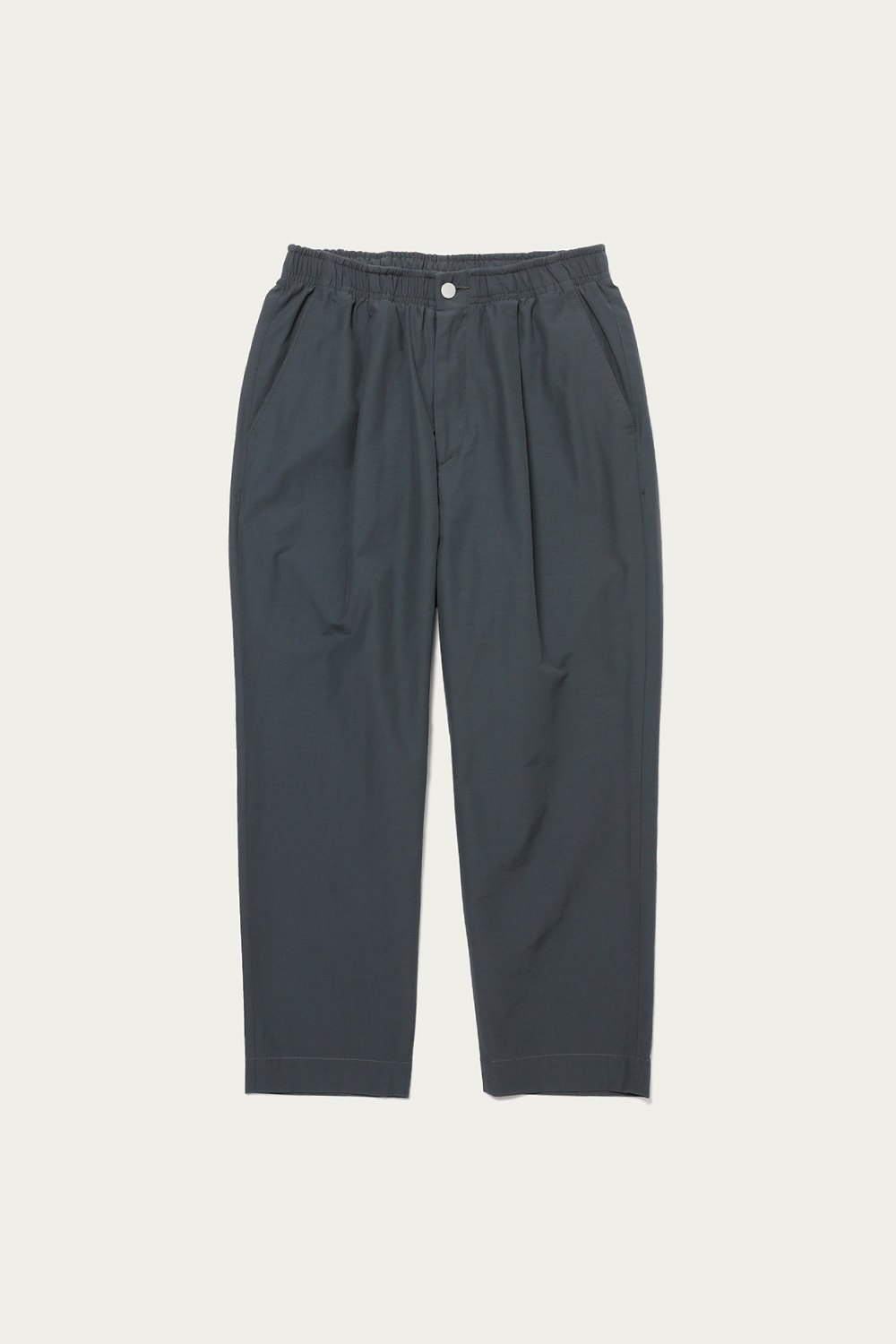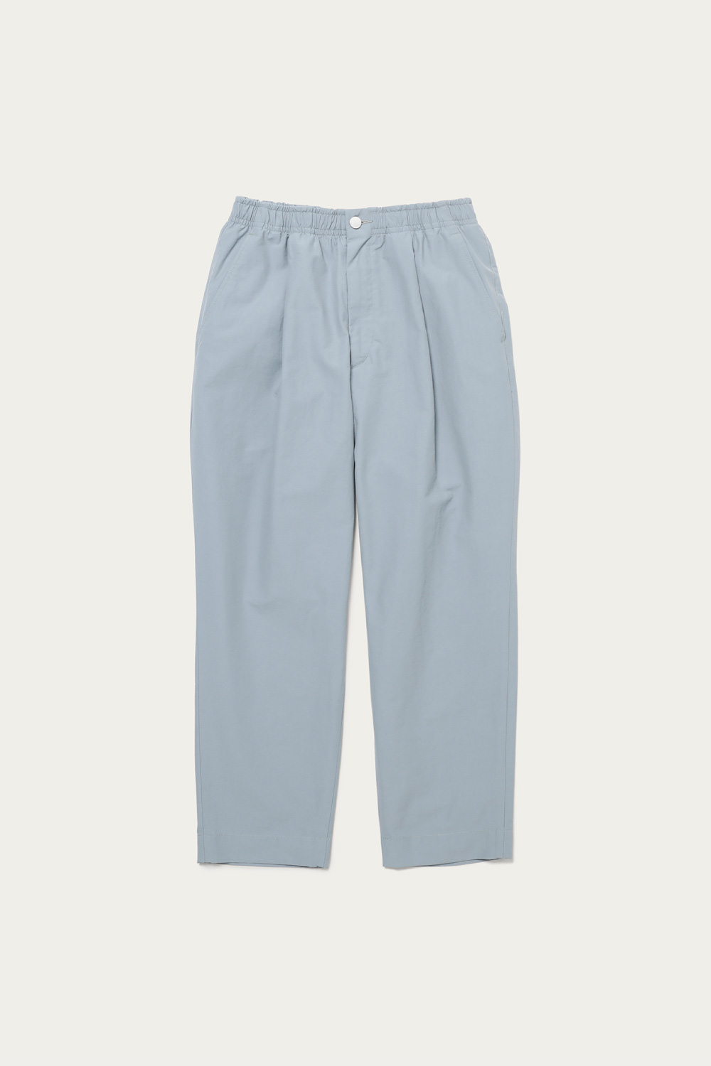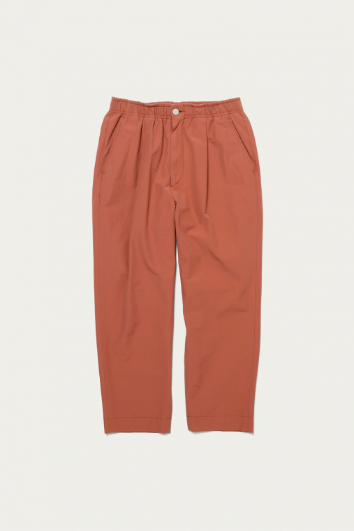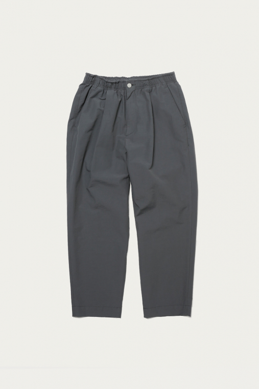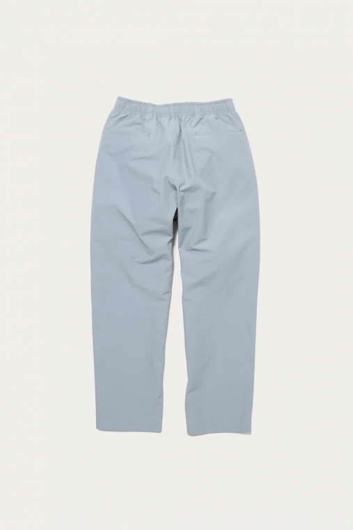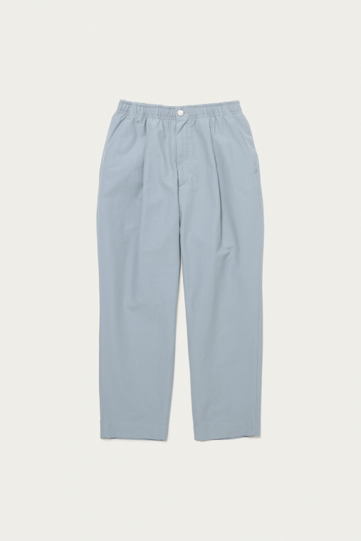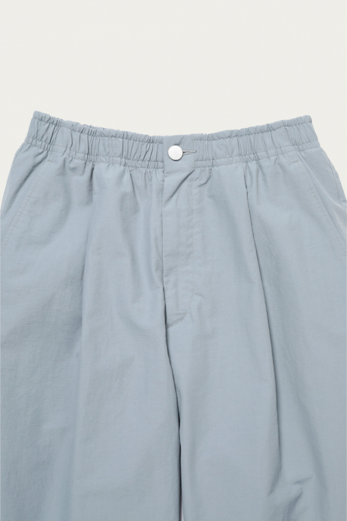 ブルーグレーを筆頭にありそうであまり無い、どこか曖昧なトーンで展開するイージーパンツ。素材は細かいシボ感とハリのあるコットンナイロンで、見た目も穿き心地もあくまで軽やかです。シルエットは太めのテーパードで、レングスはクッションが出過ぎないように設定しています。同素材でカバーオールもあるので、セットアップも楽しめます。