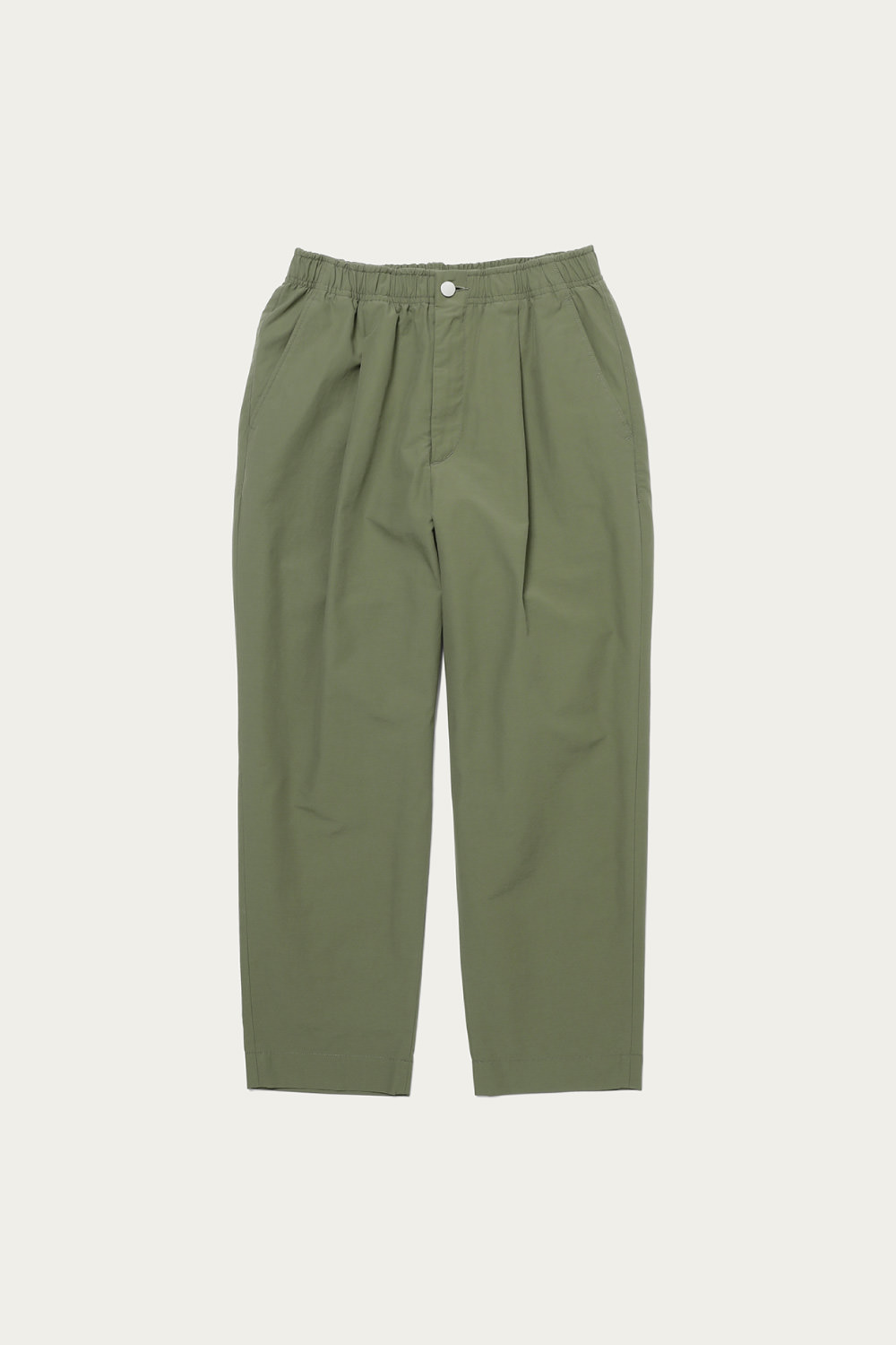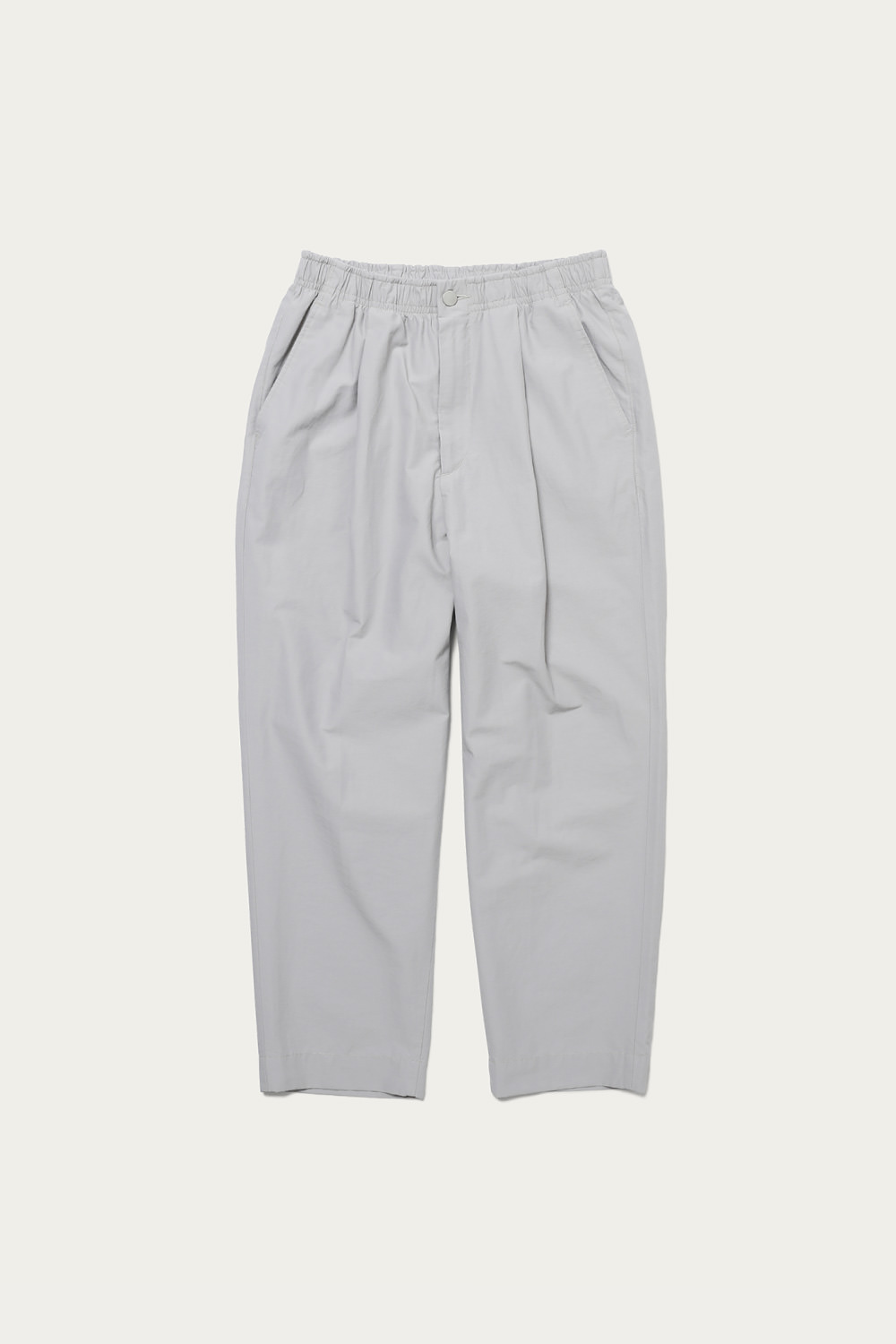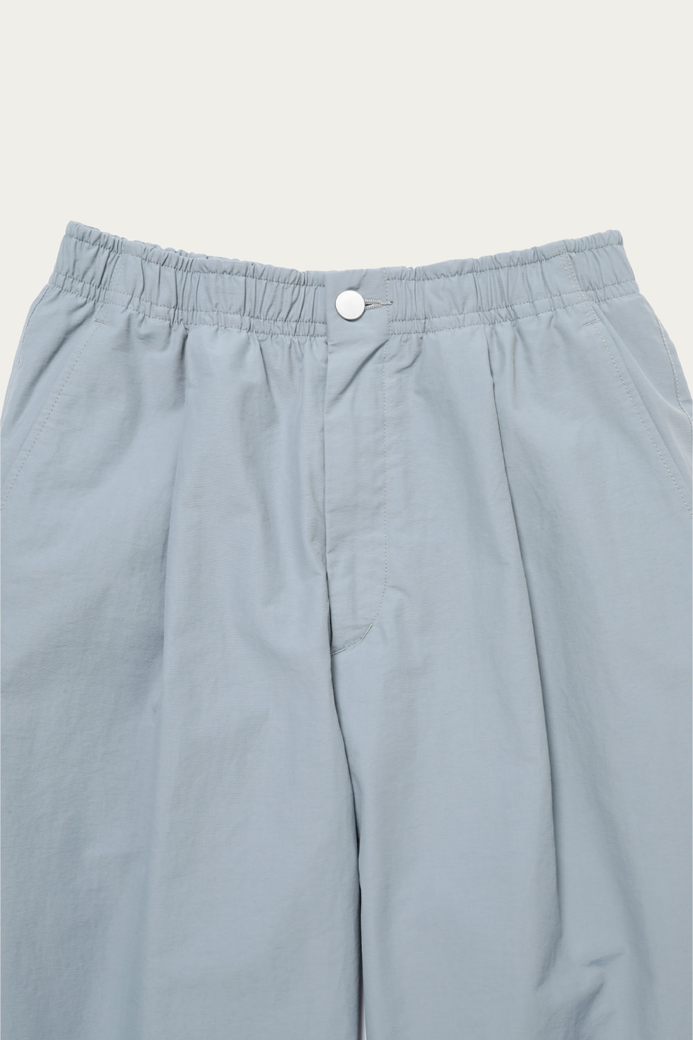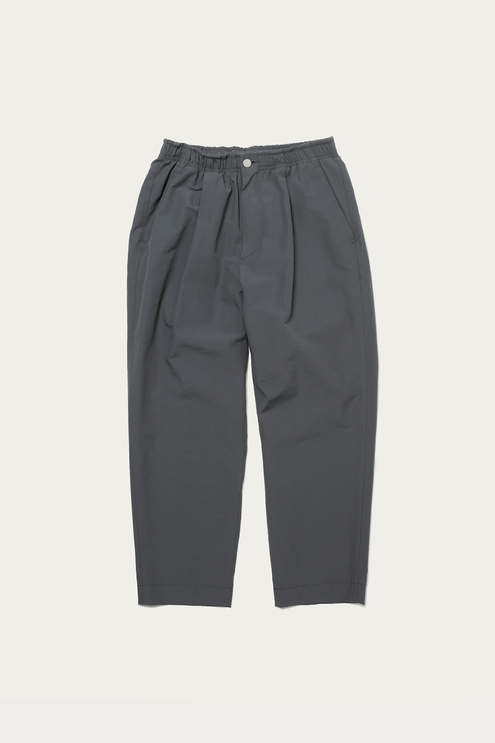 ブルーグレーを筆頭にありそうであまり無い、どこか曖昧なトーンで展開するイージーパンツ。素材は細かいシボ感とハリのあるコットンナイロンで、見た目も穿き心地もあくまで軽やかです。シルエットは太めのテーパードで、レングスはクッションが出過ぎないように設定しています。同素材でカバーオールもあるので、セットアップも楽しめます。