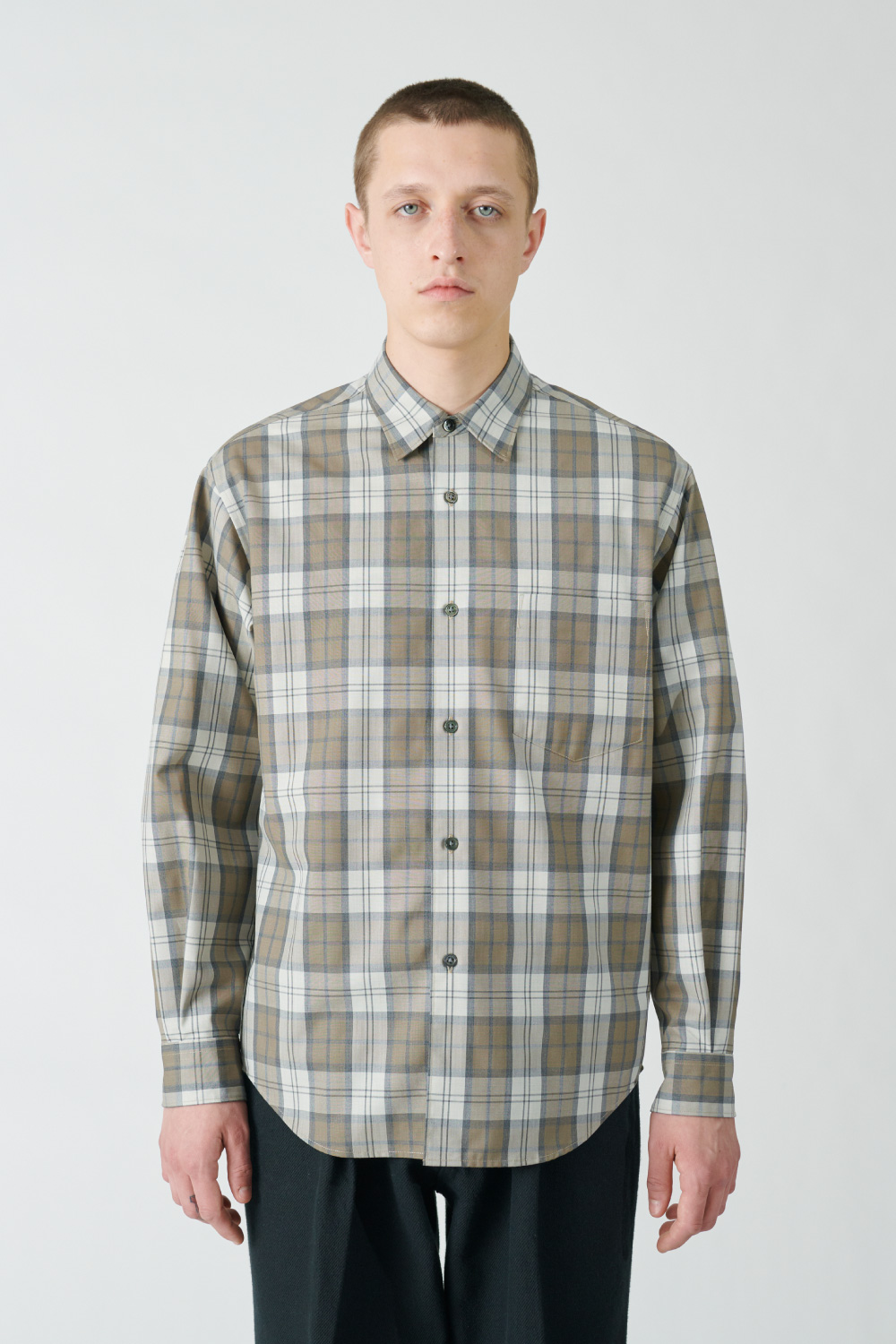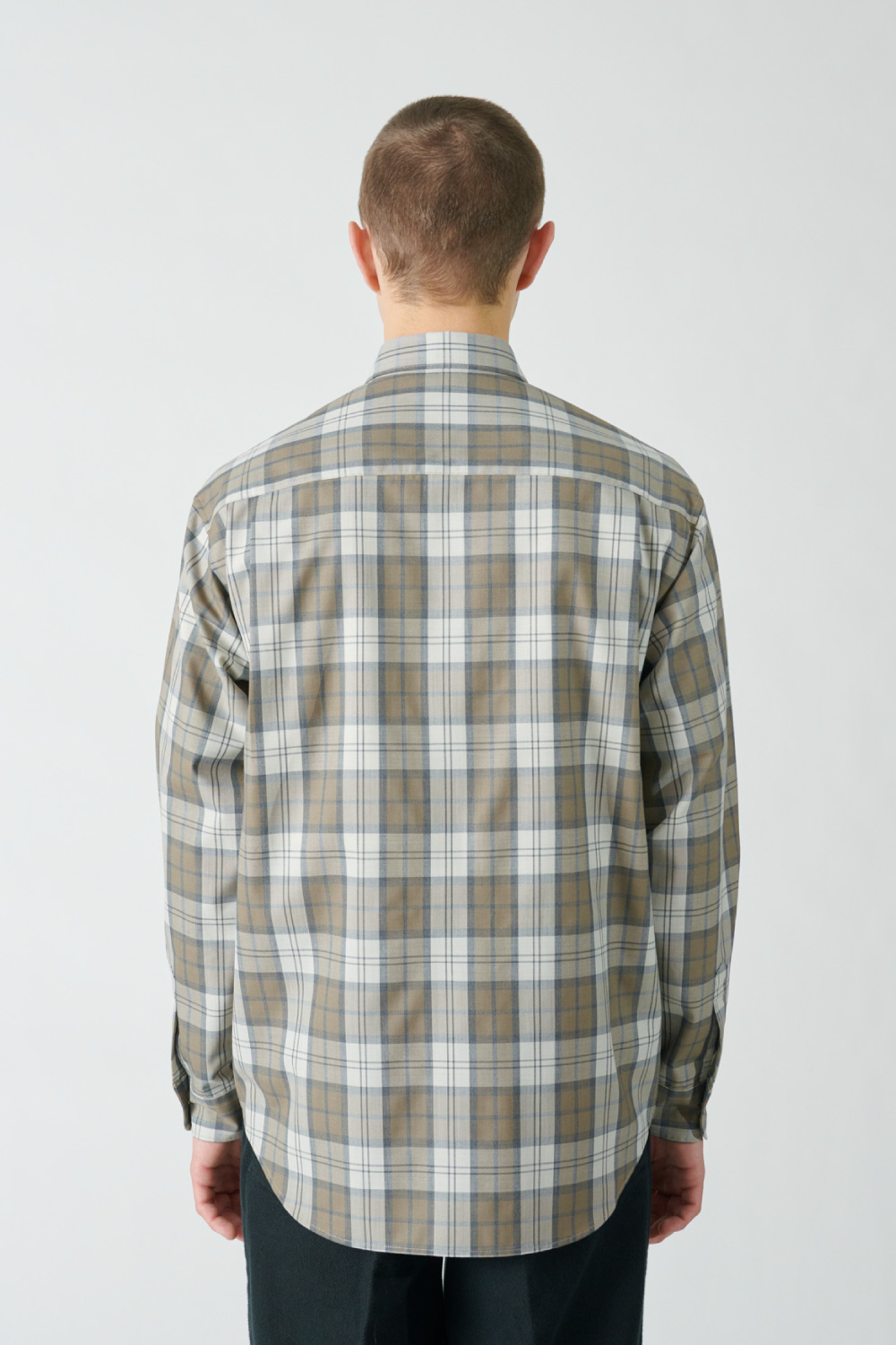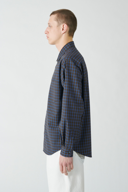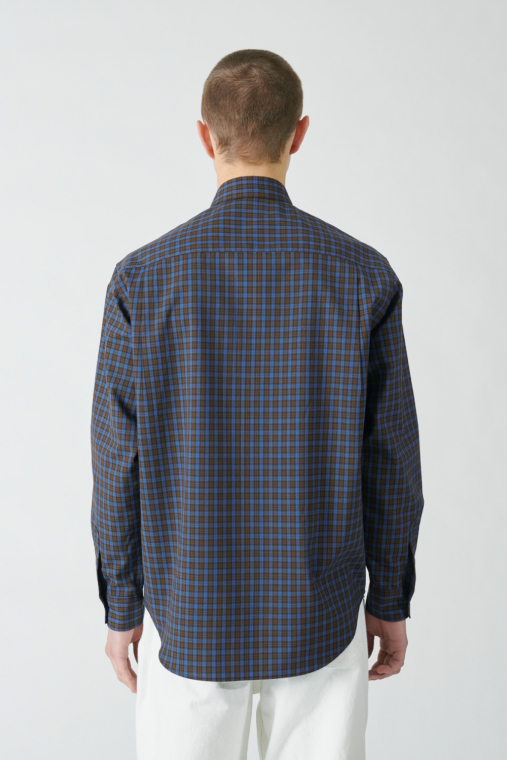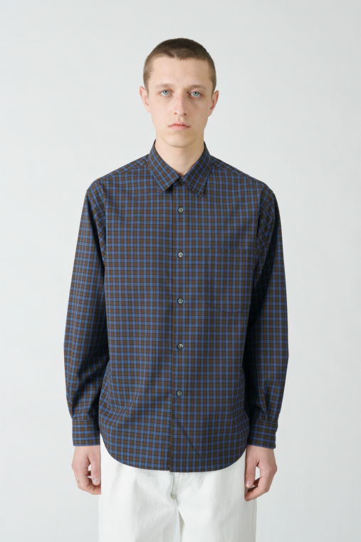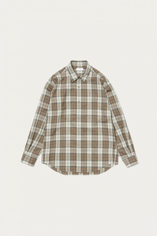 どこかレトロなトーンのチェック柄を採用したシャツは、ウールとポリエステルの糸を組み合わせたいわゆるテトロンウール素材を使った軽やかな仕立て。レイヤードのアクセントとしてちらりと柄を覗かせたり、シンプルに1枚で着るのも春らしくて素敵です。クセのないシルエットは大きめサイズを選んでラフに着ても自然に映えます。