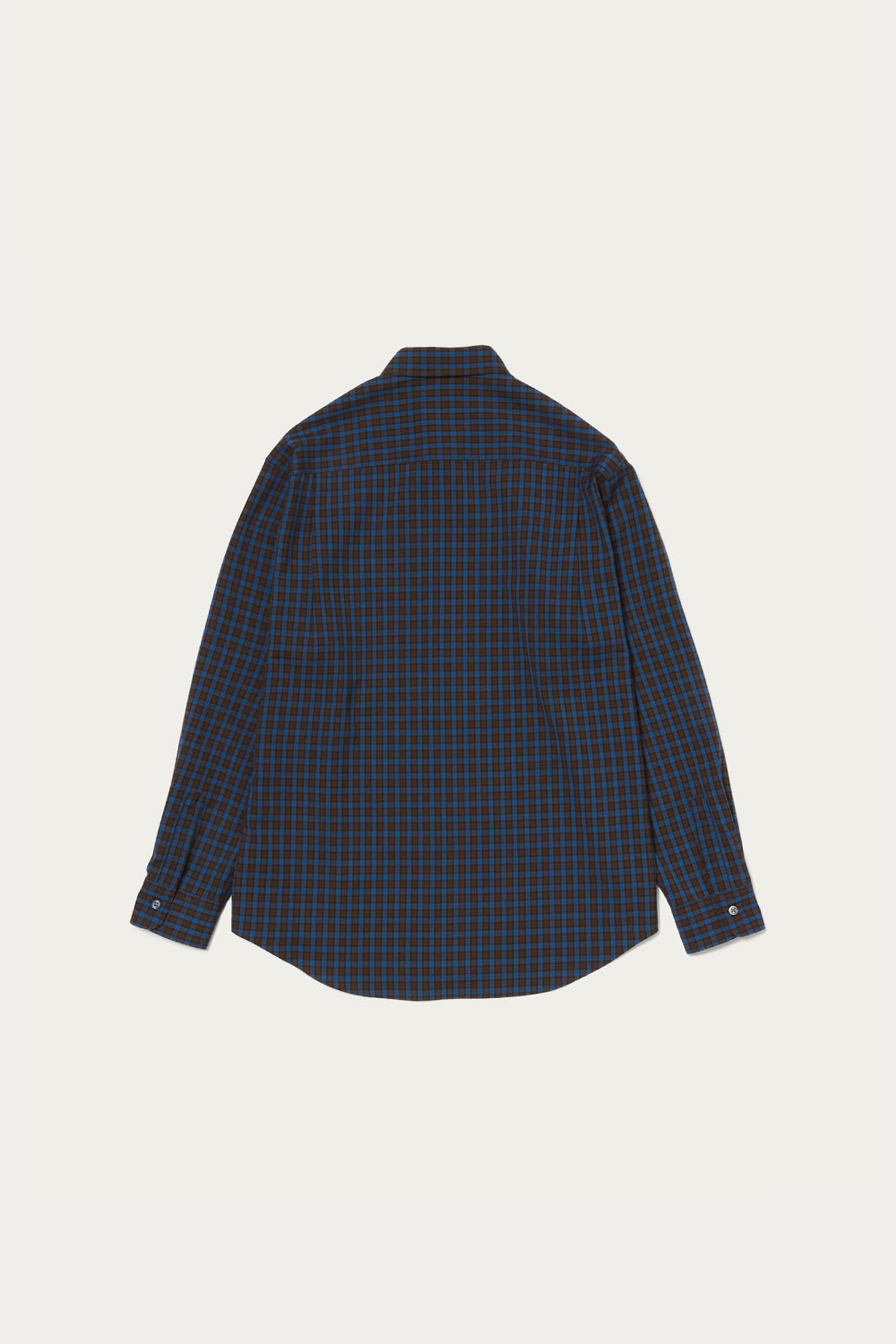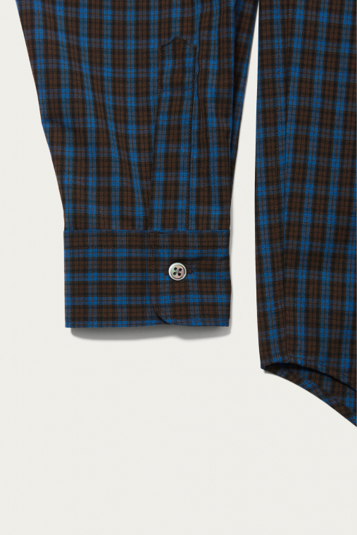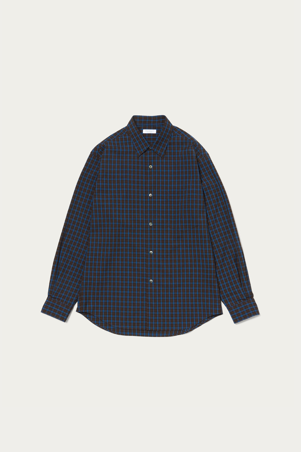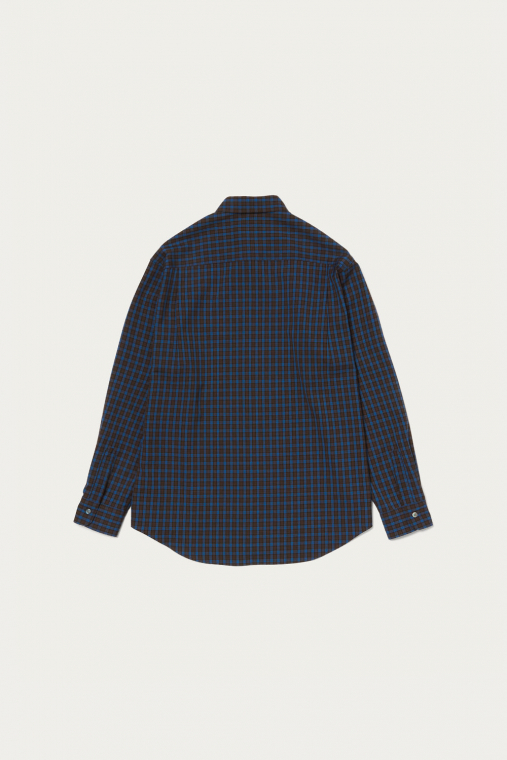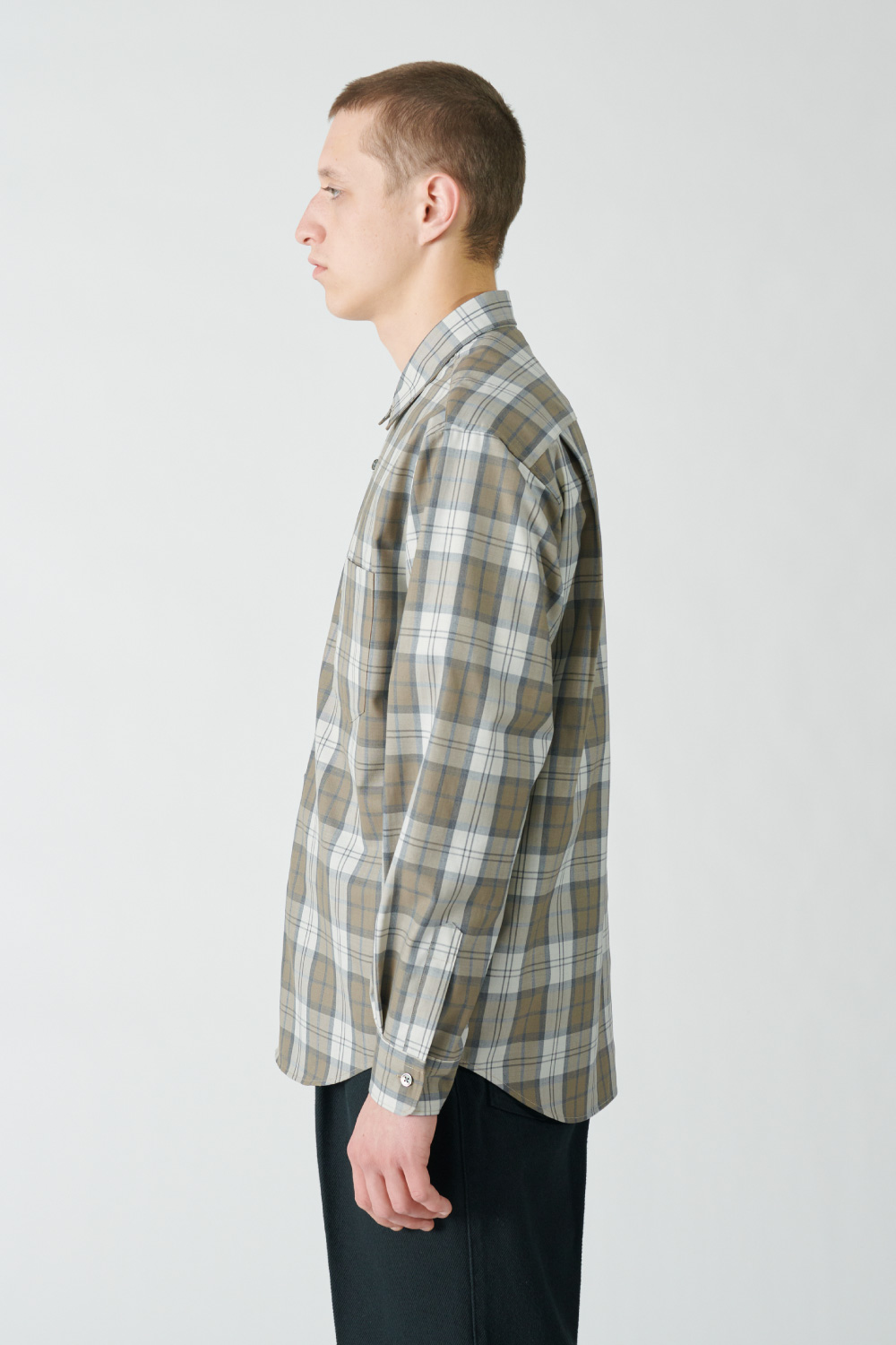 どこかレトロなトーンのチェック柄を採用したシャツは、ウールとポリエステルの糸を組み合わせたいわゆるテトロンウール素材を使った軽やかな仕立て。レイヤードのアクセントとしてちらりと柄を覗かせたり、シンプルに1枚で着るのも春らしくて素敵です。クセのないシルエットは大きめサイズを選んでラフに着ても自然に映えます。