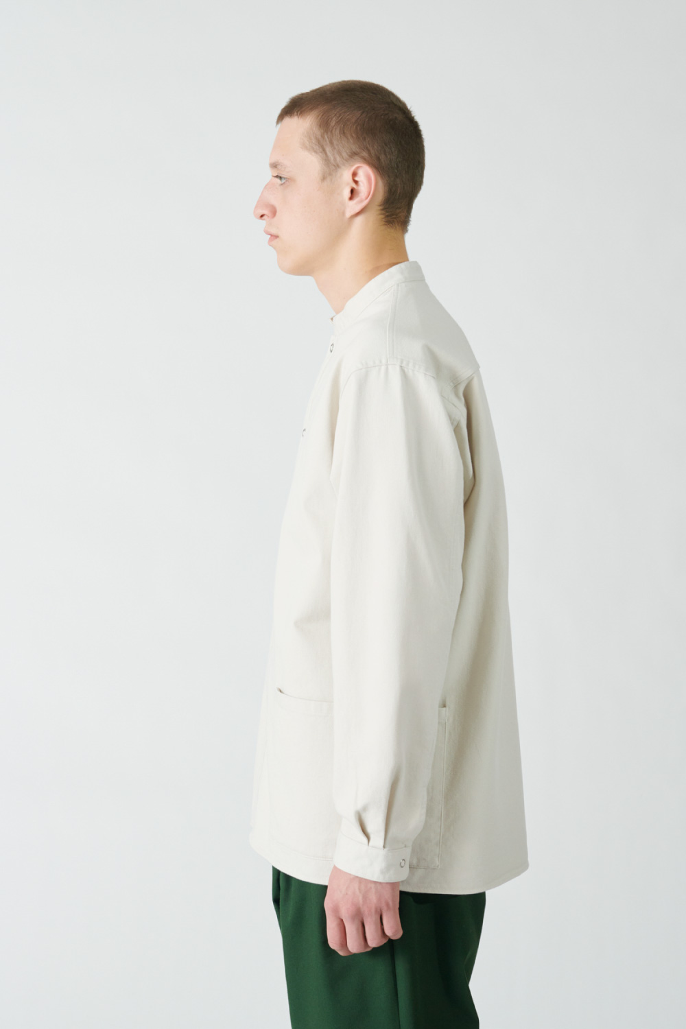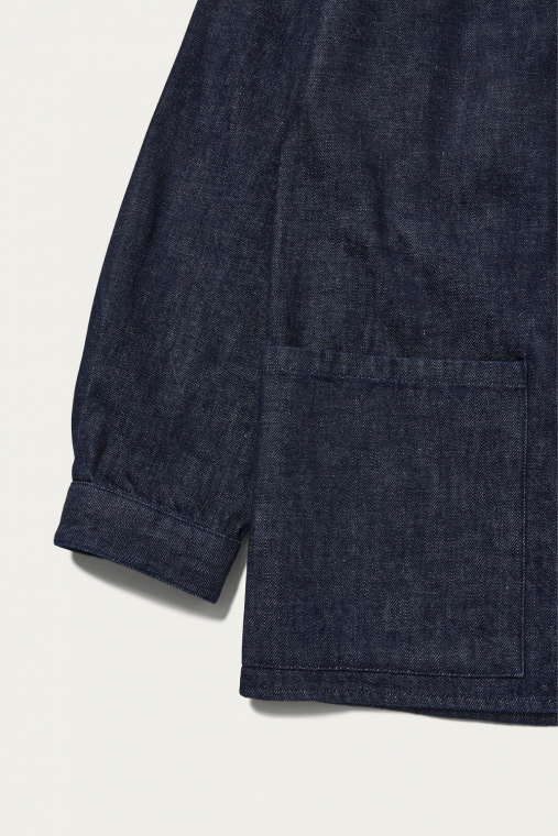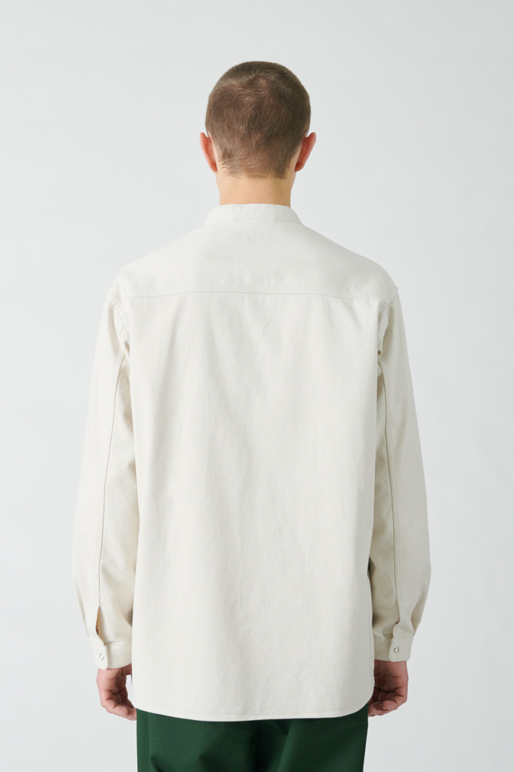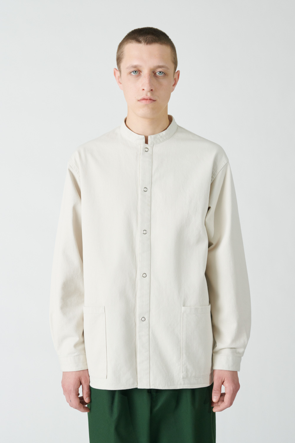 カバーオールよりは軽やかで、通常のシャツよりはしっかりとしたつくりの1着は、ガーデニングシャツから着想を得たデザイン。ワーク由来のウェアらしい朴訥とした表情の中にも、開閉しやすいリングのドットボタンがさりげなく主張しています。フロントポケットが脇をまたいで背中近くまで及ぶ、シンプルでもヒネリの利いた設計です。