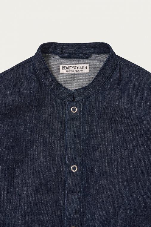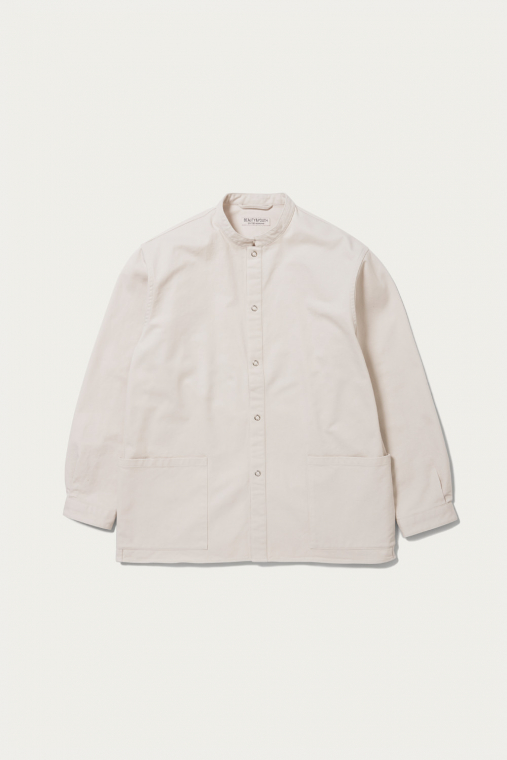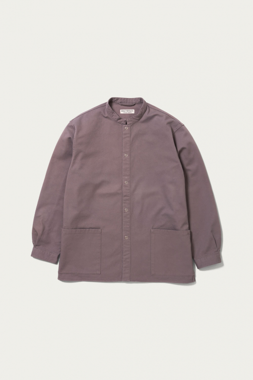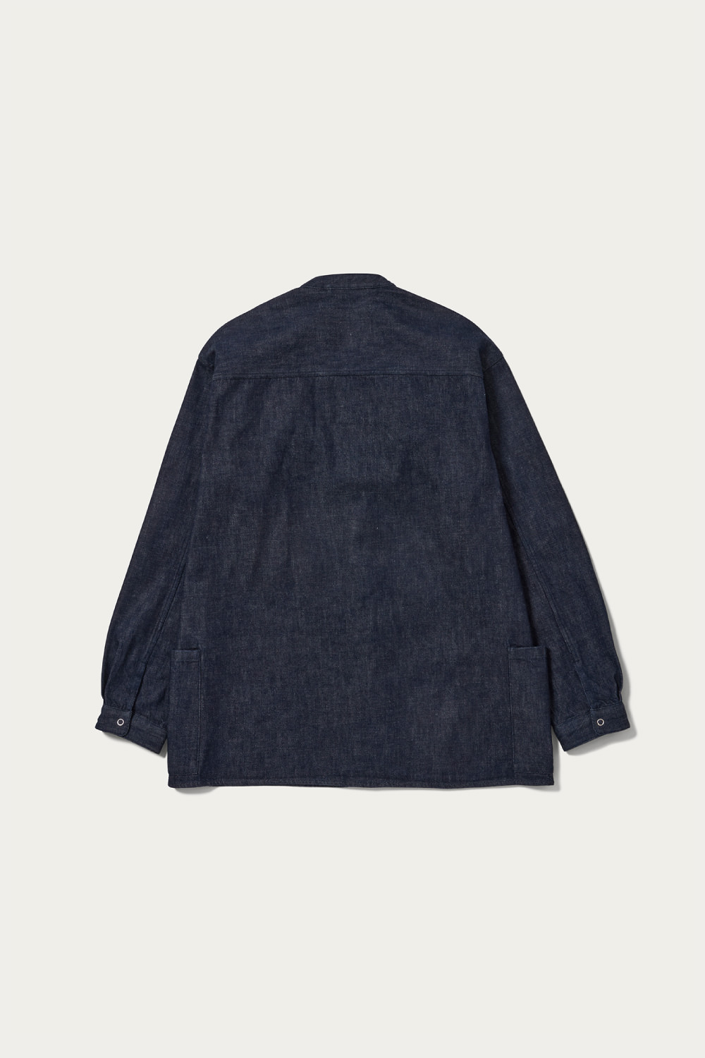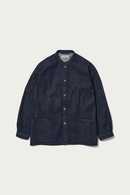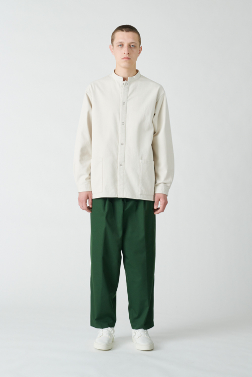 カバーオールよりは軽やかで、通常のシャツよりはしっかりとしたつくりの1着は、ガーデニングシャツから着想を得たデザイン。ワーク由来のウェアらしい朴訥とした表情の中にも、開閉しやすいリングのドットボタンがさりげなく主張しています。フロントポケットが脇をまたいで背中近くまで及ぶ、シンプルでもヒネリの利いた設計です。