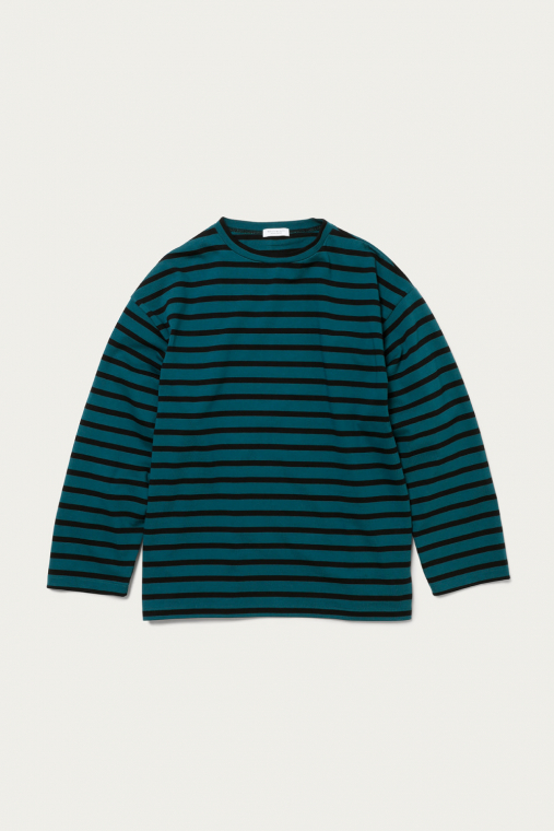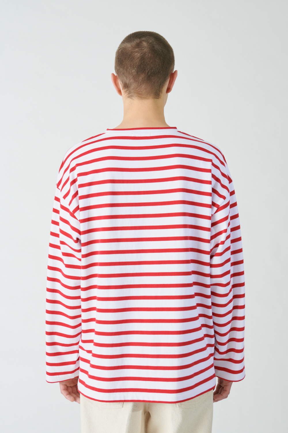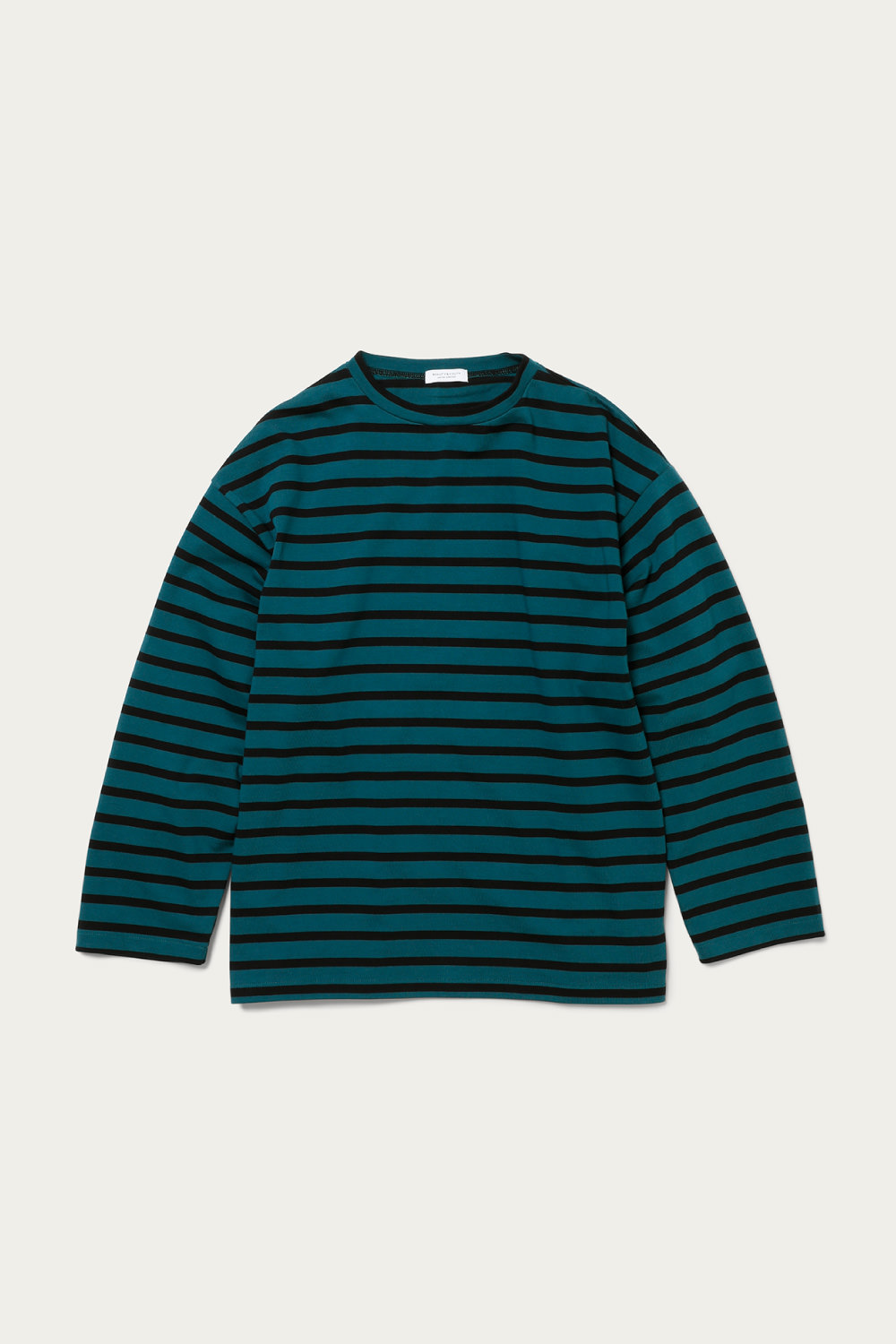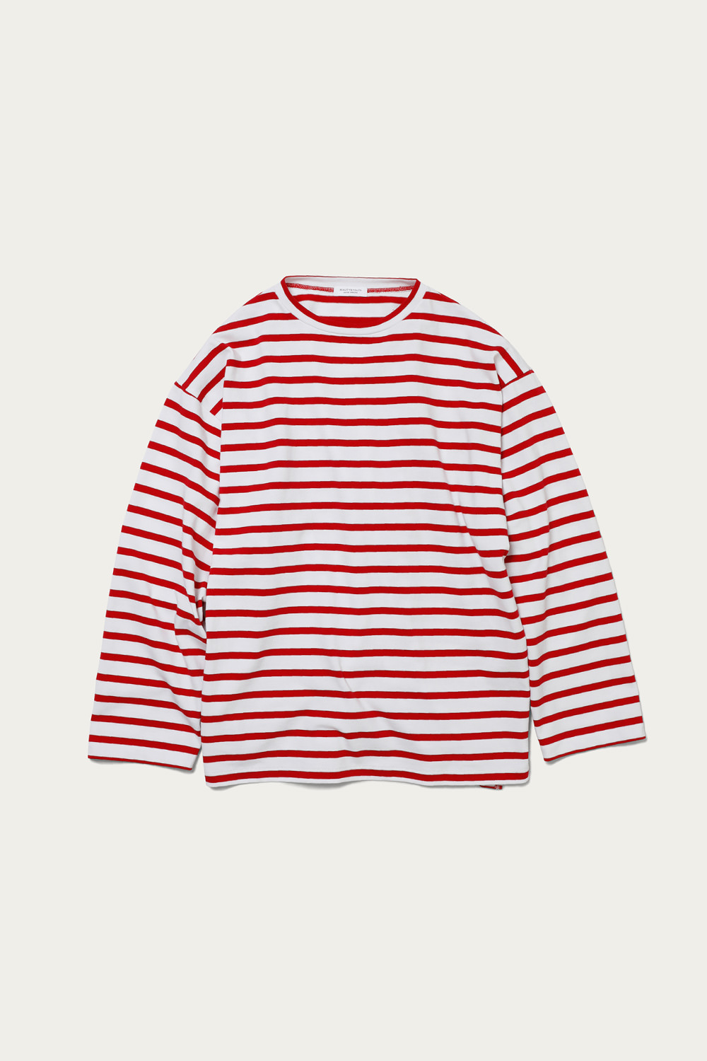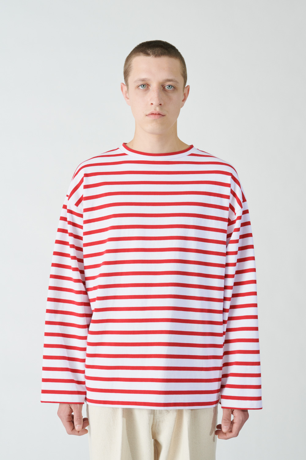 フレンチシックの象徴たるバスクシャツを、現代的なルーズシルエットにアレンジしたモデル。従来のゴワゴワとしたものとは違い、厚手でも柔らかく、肌馴染みの良いコットンファブリック製。首元はボートネックよりもクルーネックに近い形状になっており、レトロさと品の良さだけを残しモダンにブラッシュアップ。