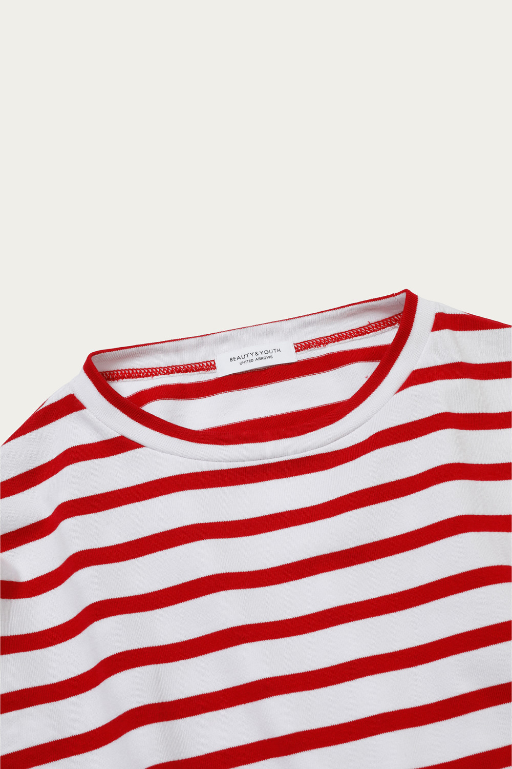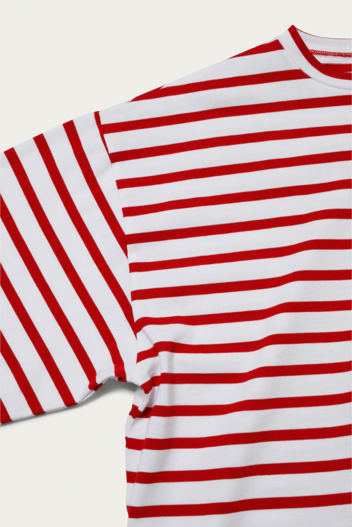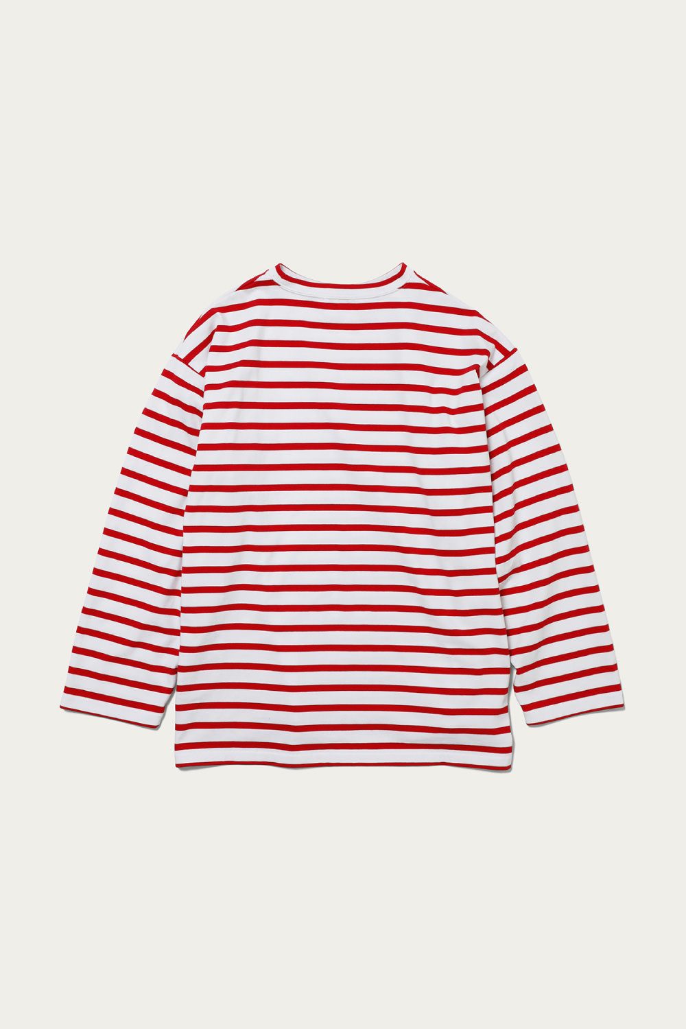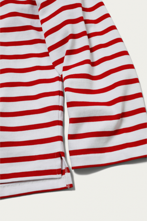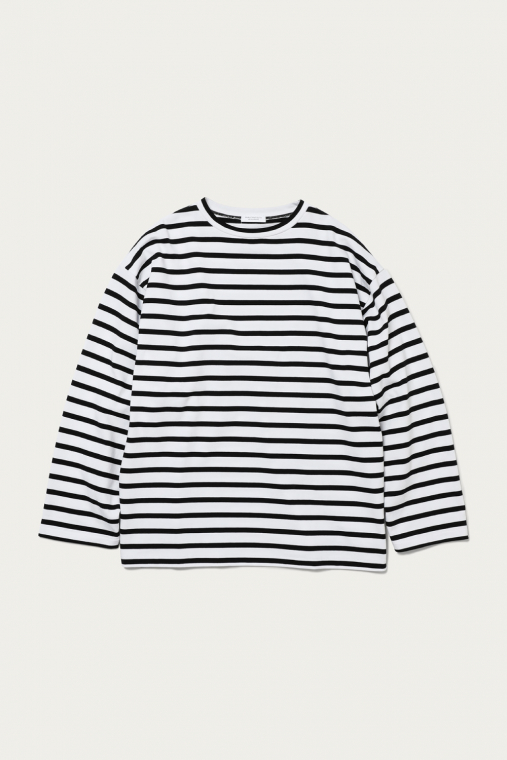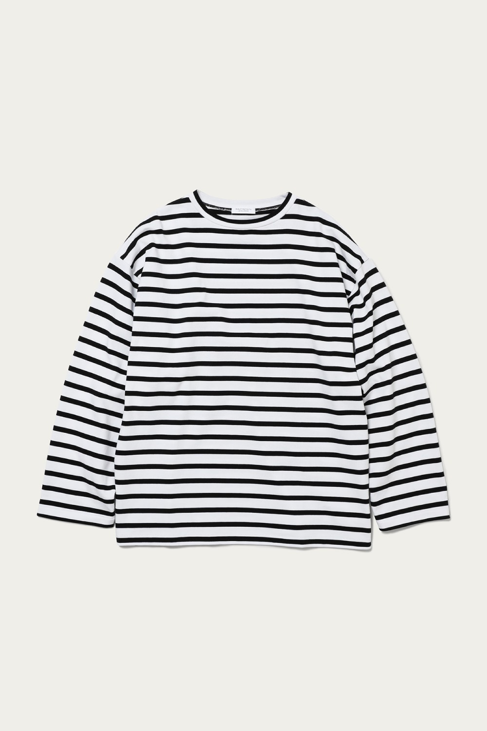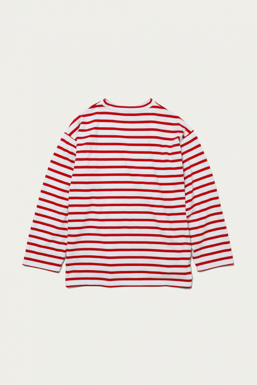 フレンチシックの象徴たるバスクシャツを、現代的なルーズシルエットにアレンジしたモデル。従来のゴワゴワとしたものとは違い、厚手でも柔らかく、肌馴染みの良いコットンファブリック製。首元はボートネックよりもクルーネックに近い形状になっており、レトロさと品の良さだけを残しモダンにブラッシュアップ。