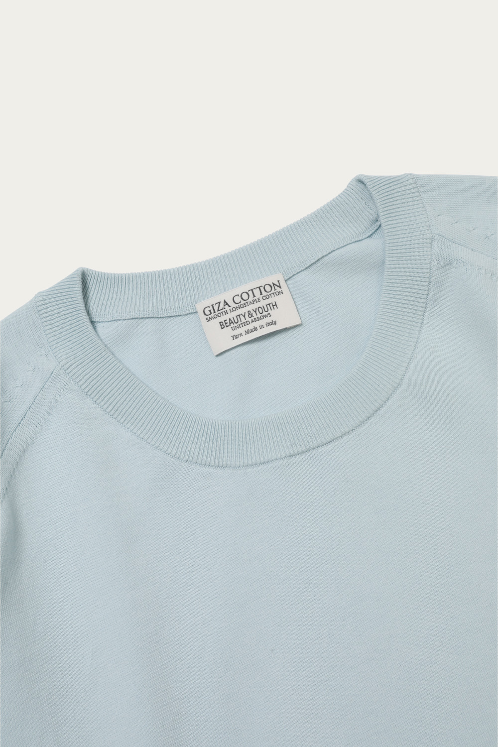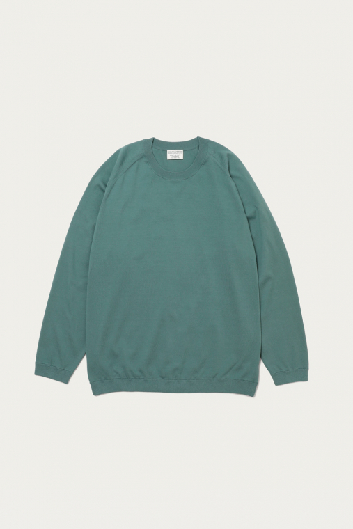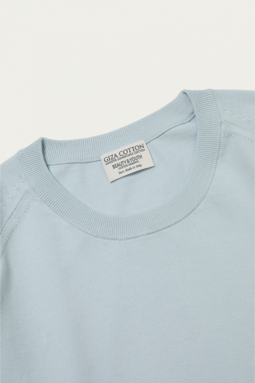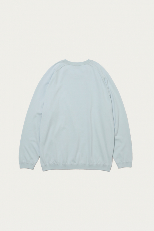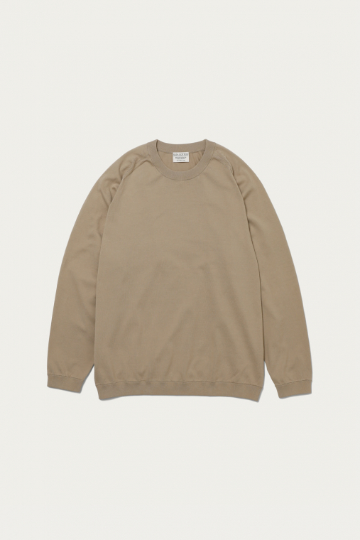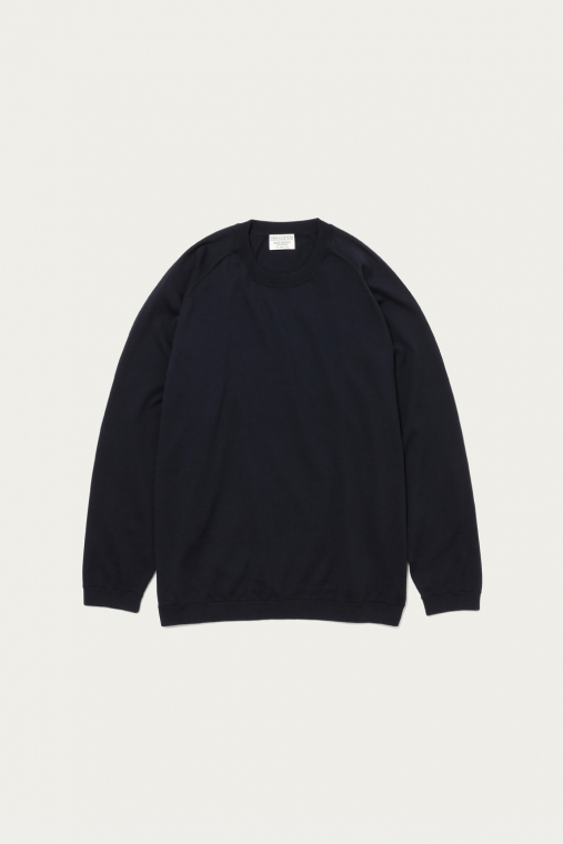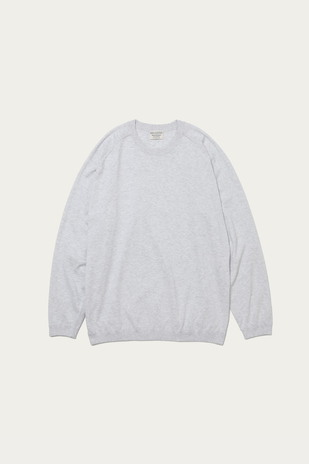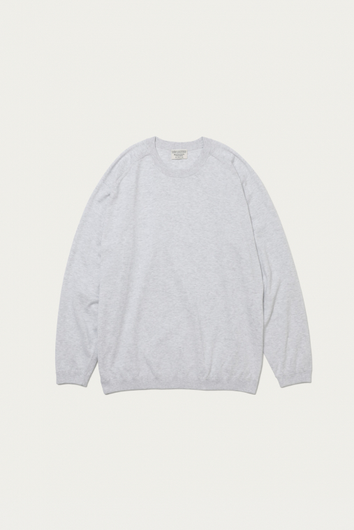 〈BEAUTY&YOUTH〉きってのロングセラーのひとつが、ギザコットンを使ったファインゲージのクルーネックニット。シンプルなルックスはそのままに、今季はシルエットを微調整することでよりモダンに仕上げています。身幅も広めで着丈も長いルーズな形ですが、イタリアで紡績された上質なコットンの質感が品格を添えてくれます。