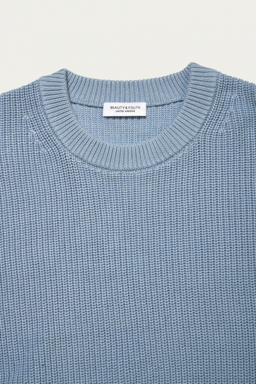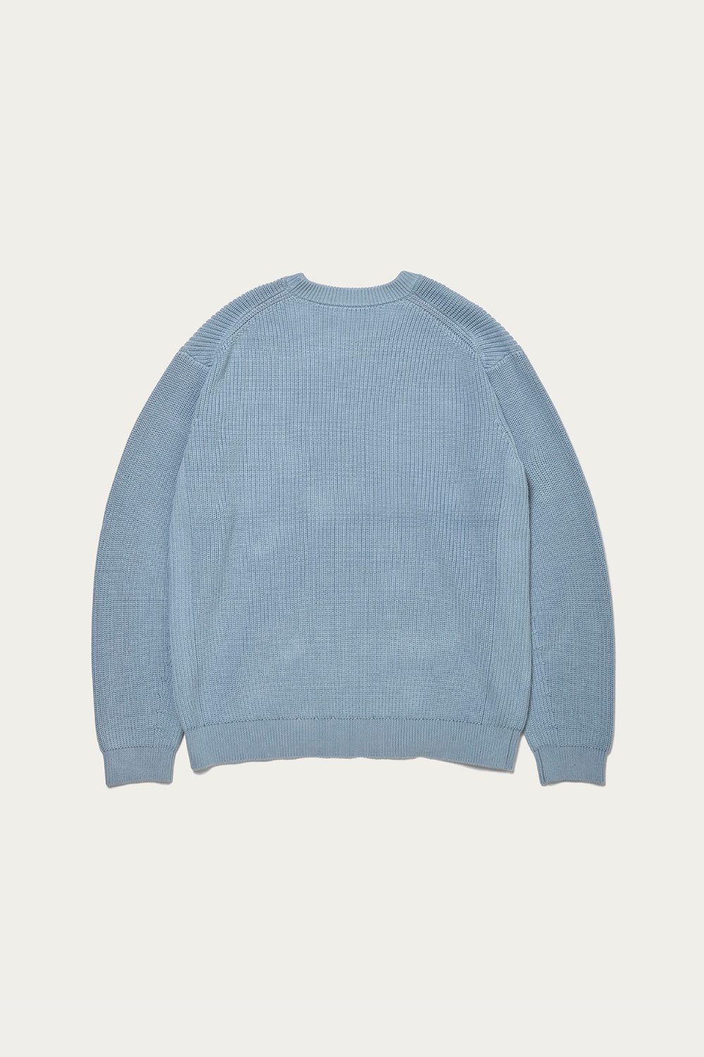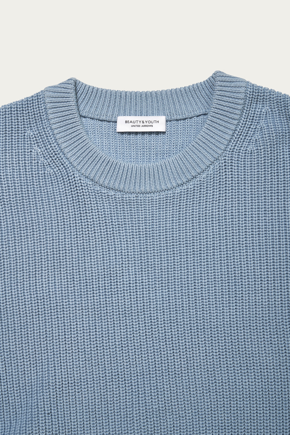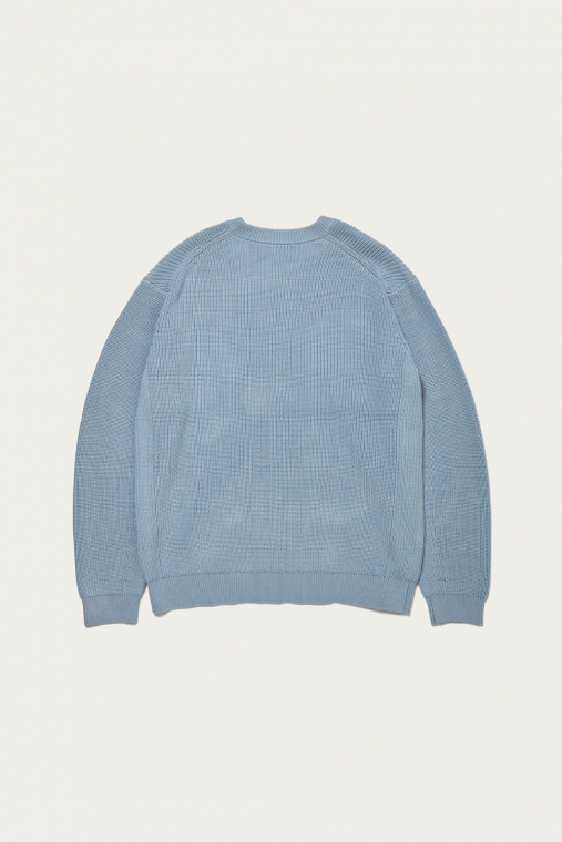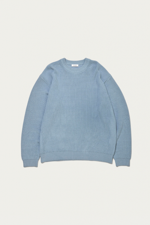 ミドルゲージのあぜ編みのコットンニットは、偶然覗いた古着屋で見かけるようなスタンダードなアイテム。そんな定番を、繊細でやさしい色合いでアップデートしました。生地自体の厚みも相まって、着ると適度なルーズさが生まれるのでこなれ感と今っぽさを醸してくれます。ガス焼きによって毛羽立ちを抑えた、クリーンな質感です。