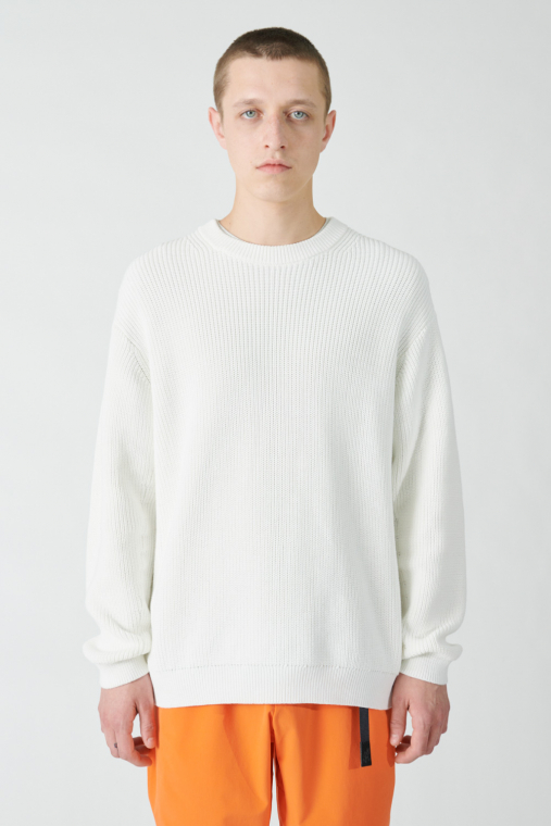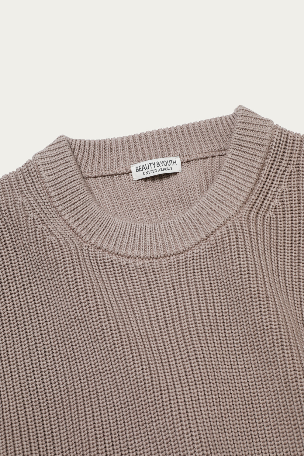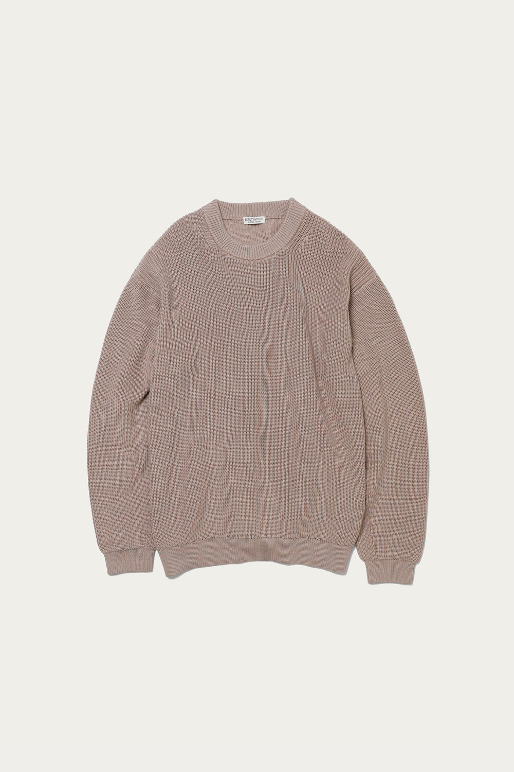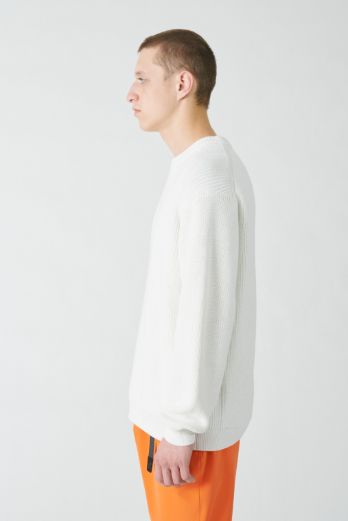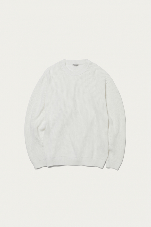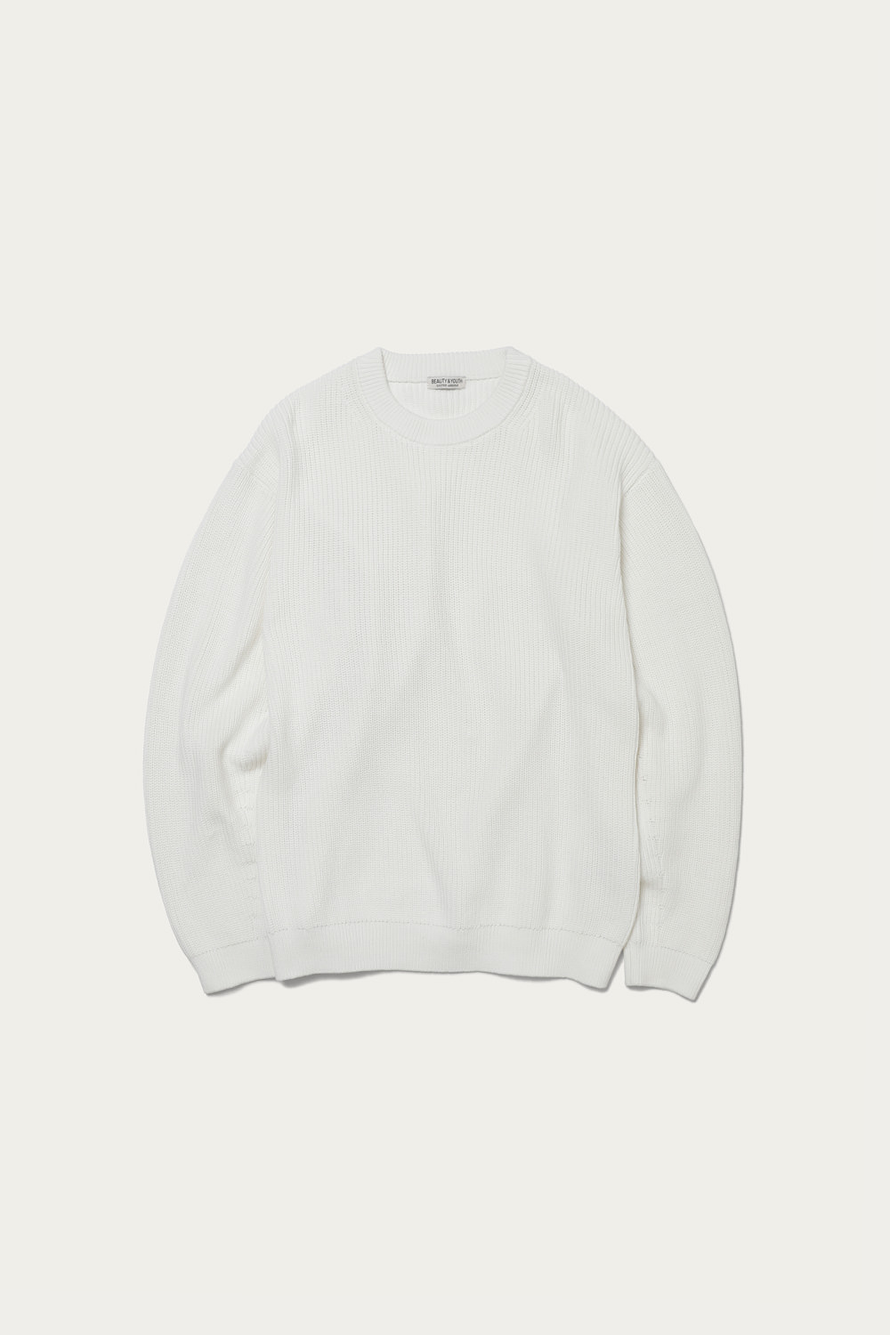 トラディショナルなミドルゲージのあぜ編みのコットンニット。今季の〈BEAUTY&YOUTH〉のキーカラー、ホワイトとナチュラルはどちらも品よく着られる春らしい色合いです。ガス焼きによって毛羽立ちを抑えたクリーンな質感なので、ざっくりと大き目を選んで取り入れても、野暮ったく見える心配がありません。