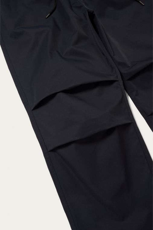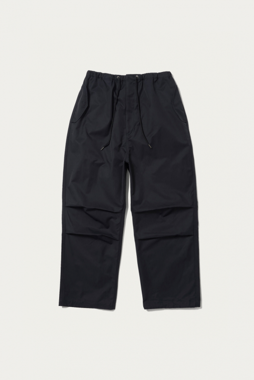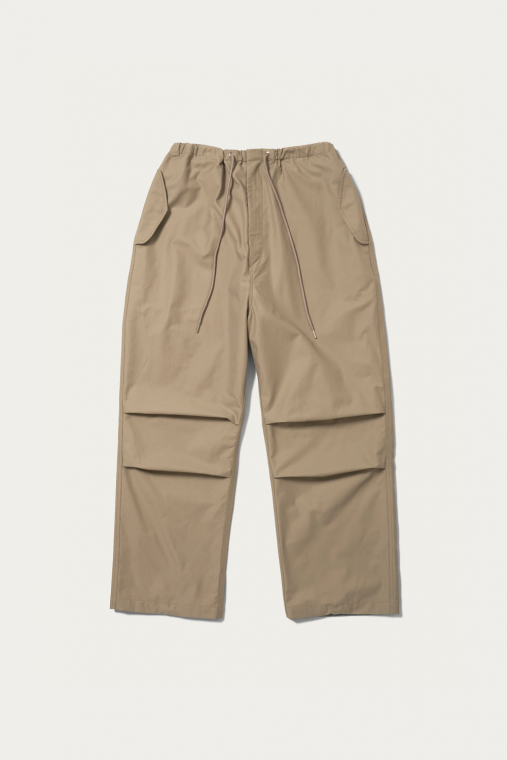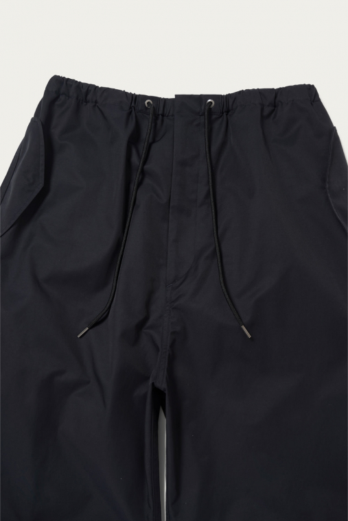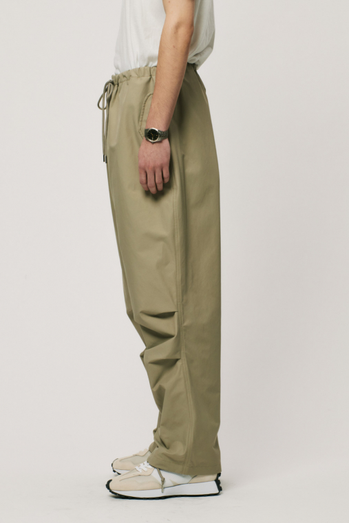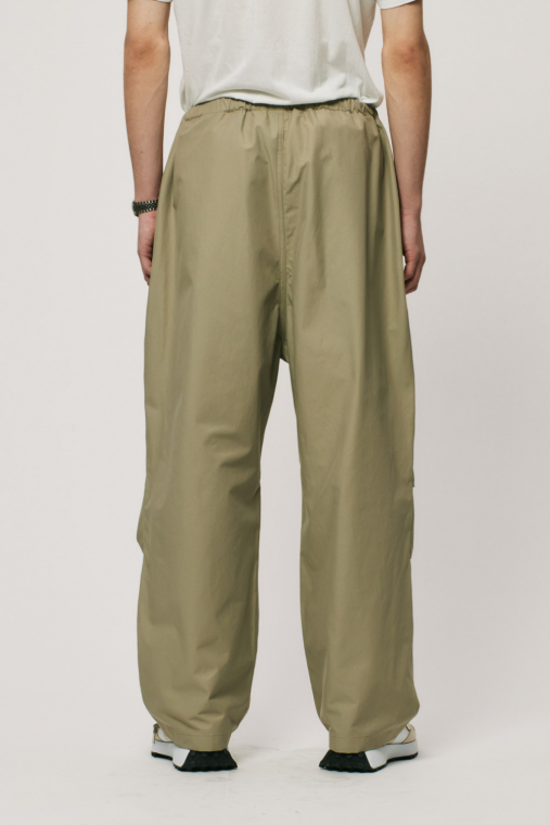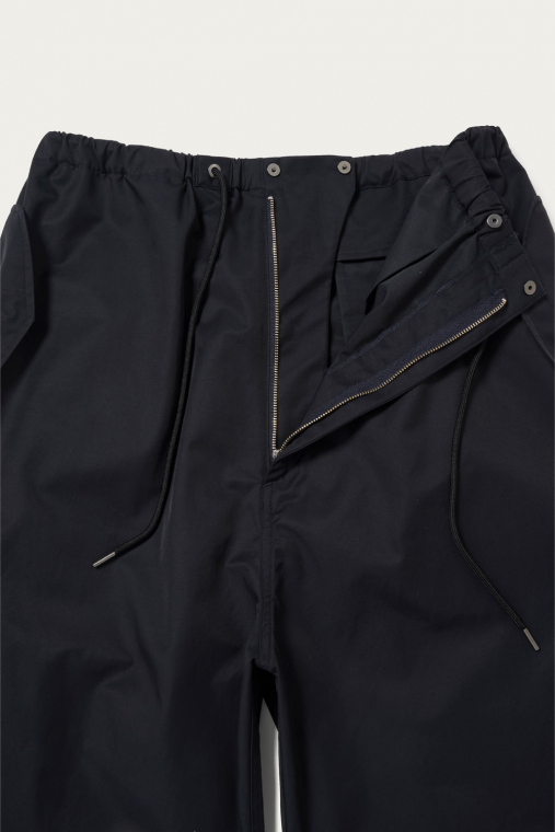 OLMETEX社のコットンナイロンツイルを使用したオーバーパンツ。高級感のある生地やボタンなどのディテールも相まってモード感漂う仕上がりに。裾のドローコードを絞ってスウェットパンツ感覚でスニーカーとの合わせがおすすめです。