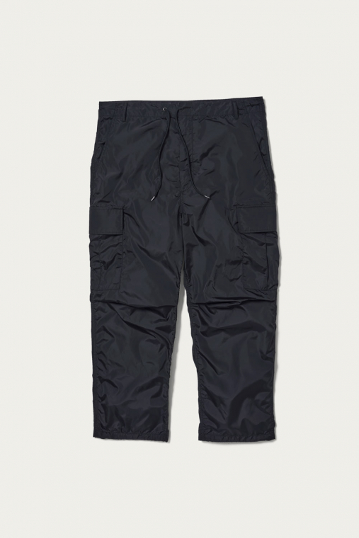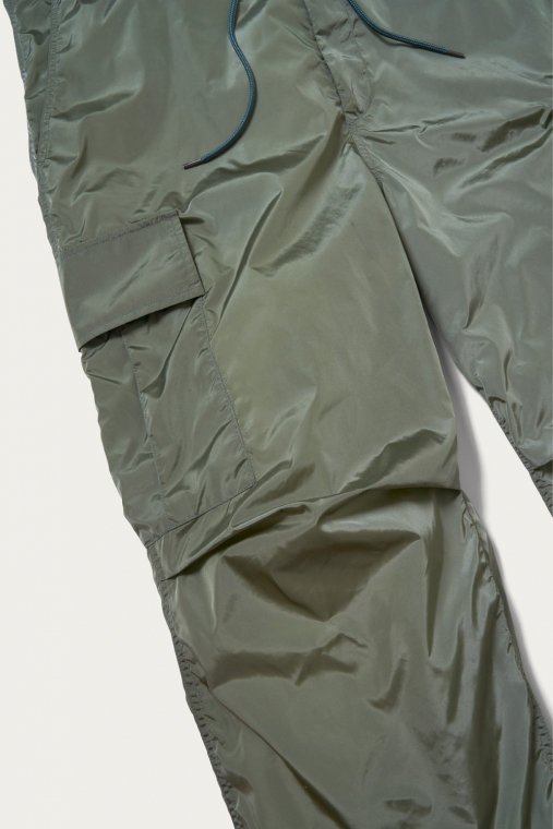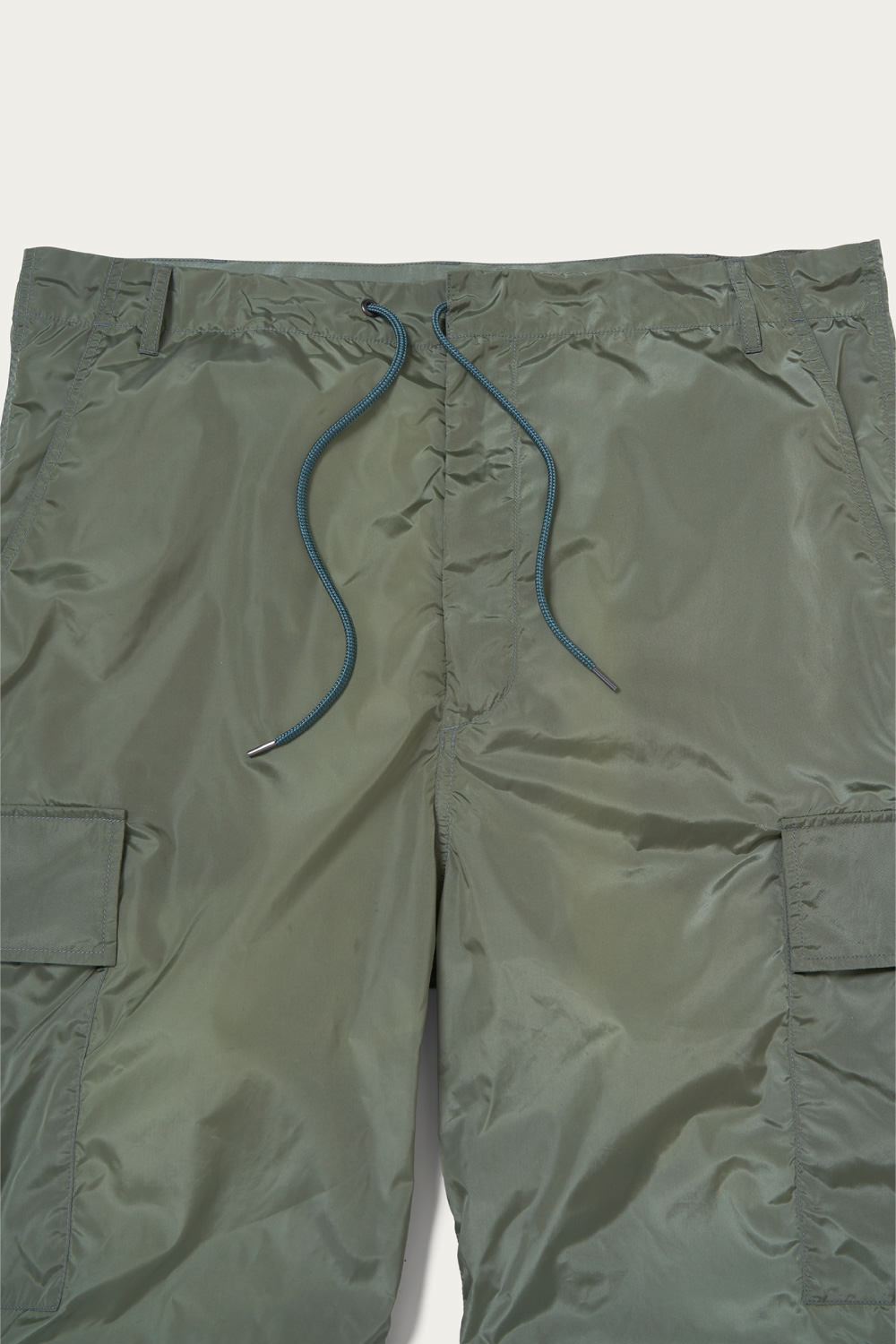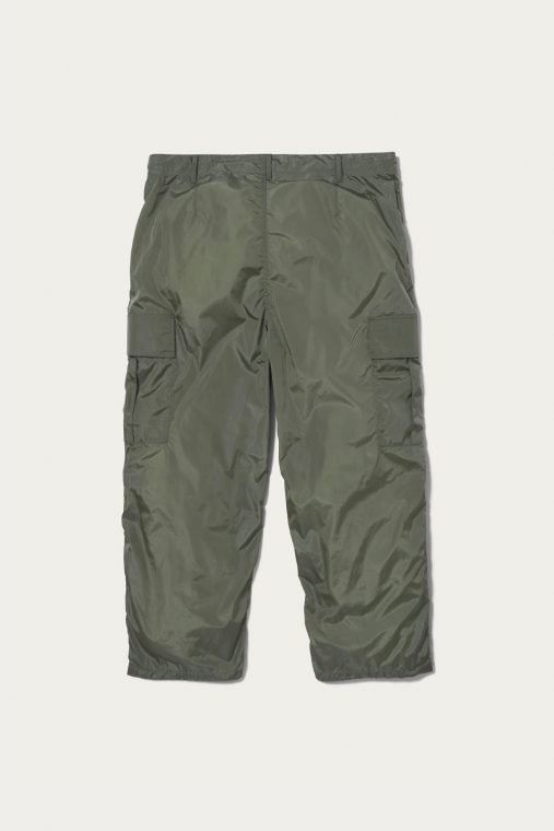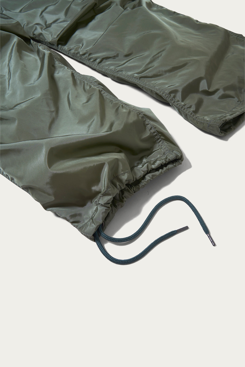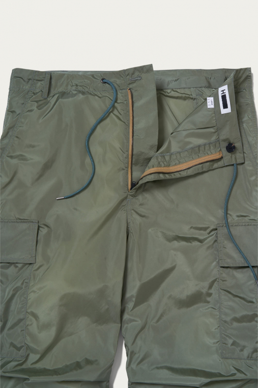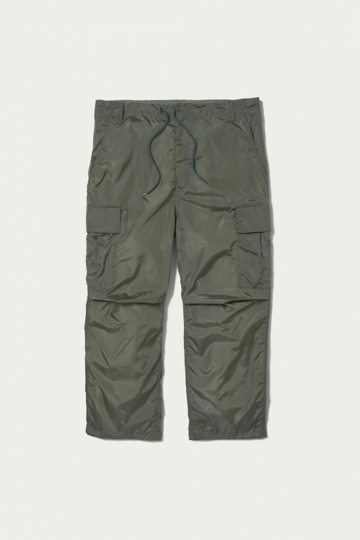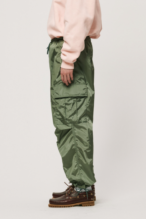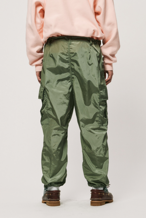 OLMETEX社の高級感のあるナイロンタフタを使用したファティーグパンツ。ラグジュアリーな生地感とオーバーサイズシルエットにより、本来6ポケットパンツが持つミリタリー感を払拭した上がりになっています。