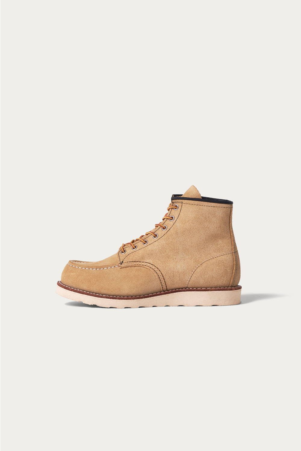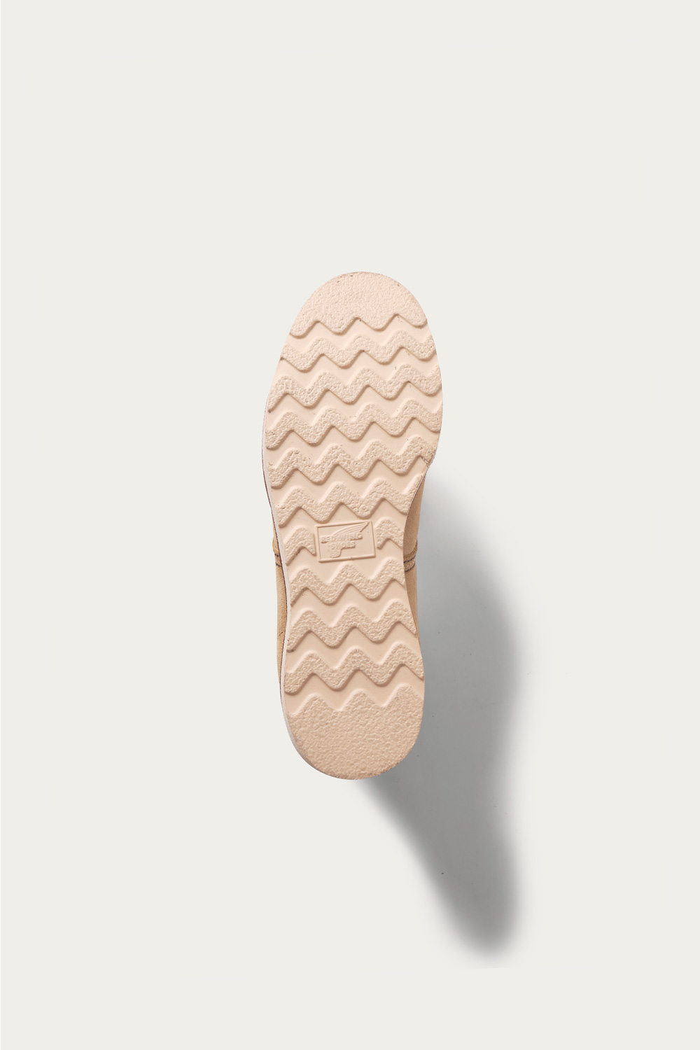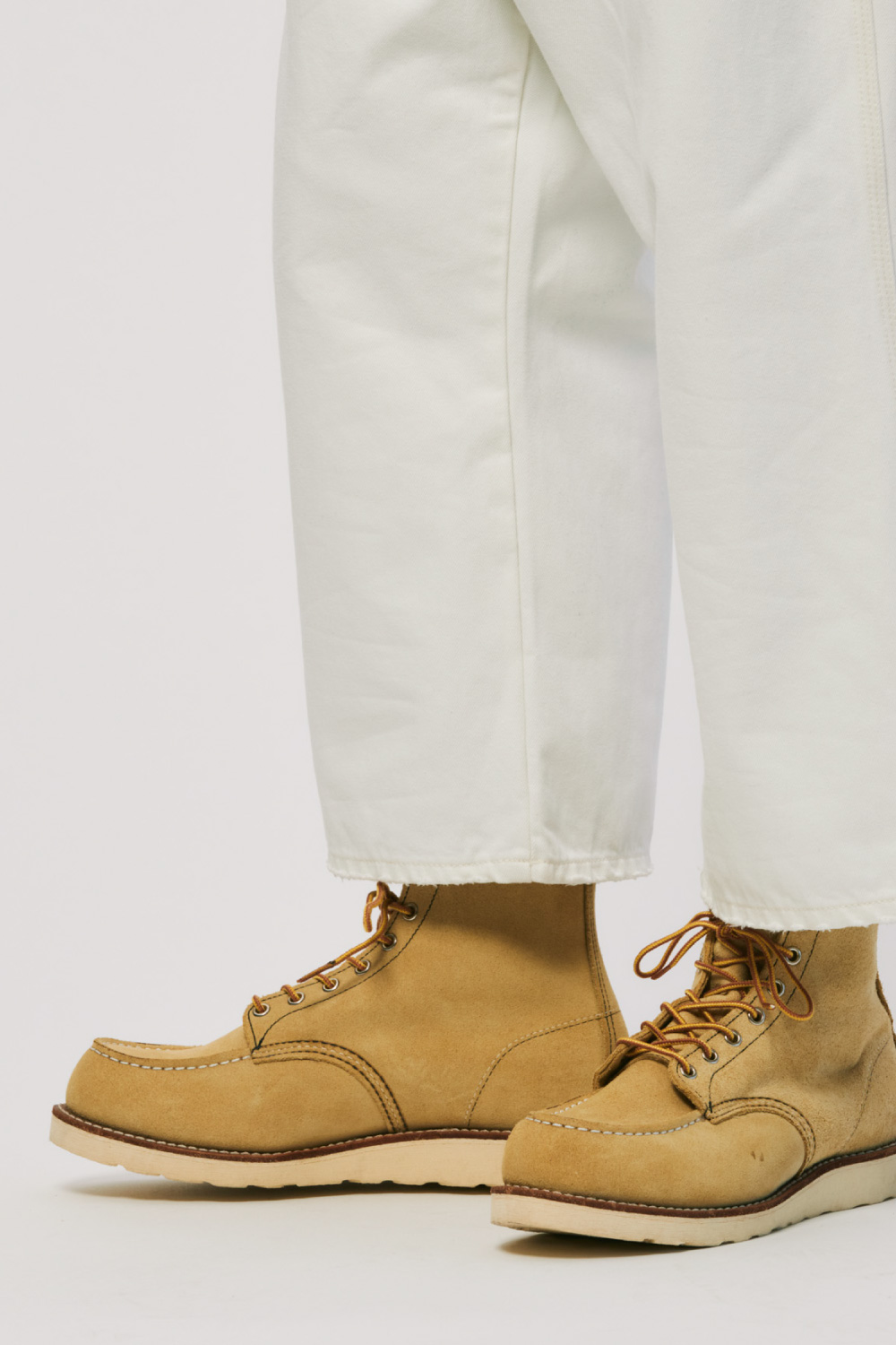〈RED WING〉の「8173」は、モカシンタイプのつま先とクッション性に富むトラクショントレッド・ソール、微起毛感のあるベージュのラフアウトレザーを組み合わせた6インチブーツ。1989 年の誕生以来、歩きやすさと上品な表情を兼ね備えたモデルとしてロングセラーを誇っており、一足は持っておきたい永遠の定番と言えます。