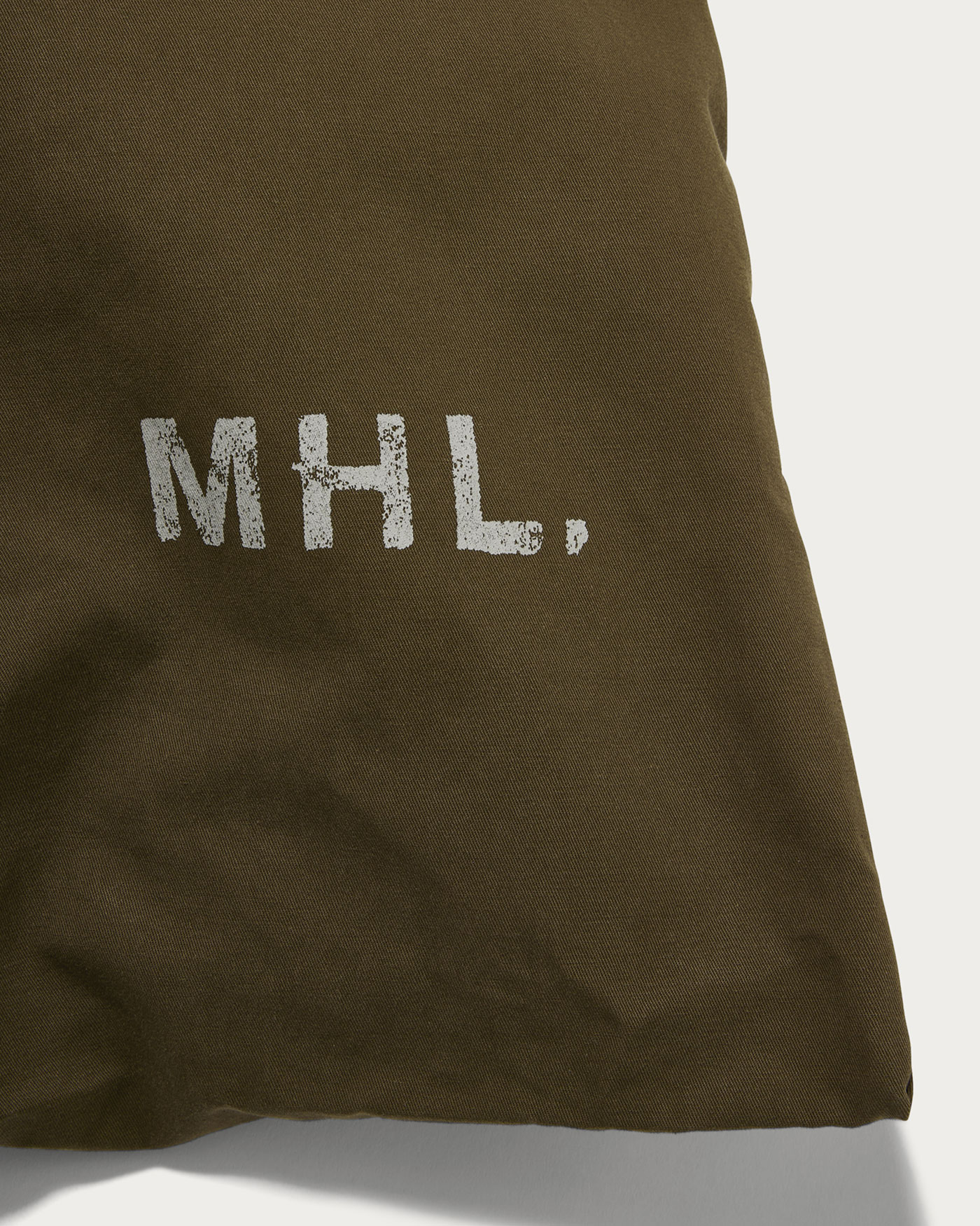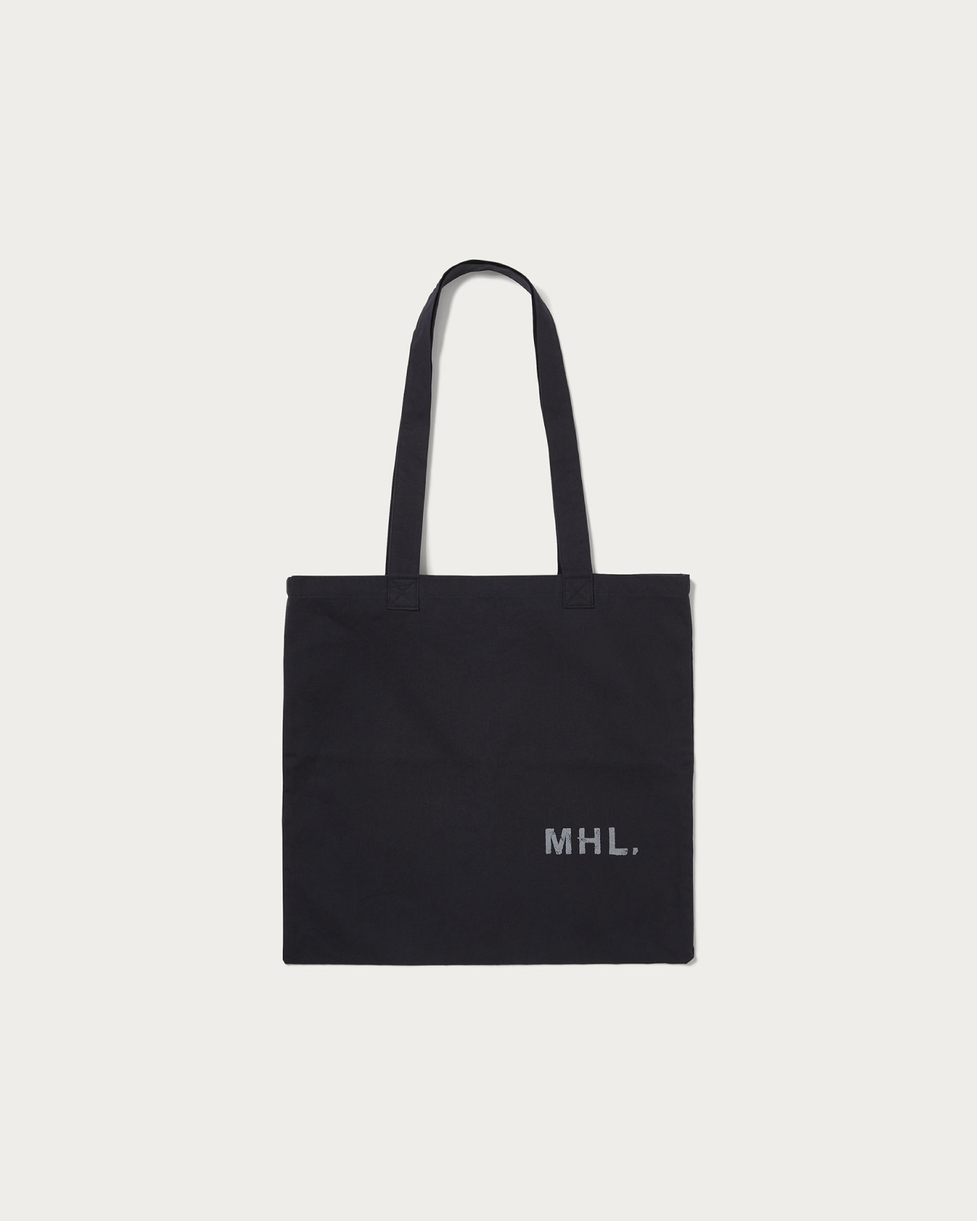 〈MHL.〉のキーカラー、ブルーグレーをロゴに用いた別注トートバッグ。ネイビーとブラウンの2色を作製。他、カットソー、シャツ、ポーチ、ソックスのラインナップで〈MHL.〉の世界観が詰まったカプセルコレクションを展開しています。