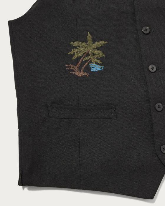 ポリエステル/コットンのホップサック素材を使用したジレ。腰ポケット上に入ったパームツリーの刺繍がアクセント。