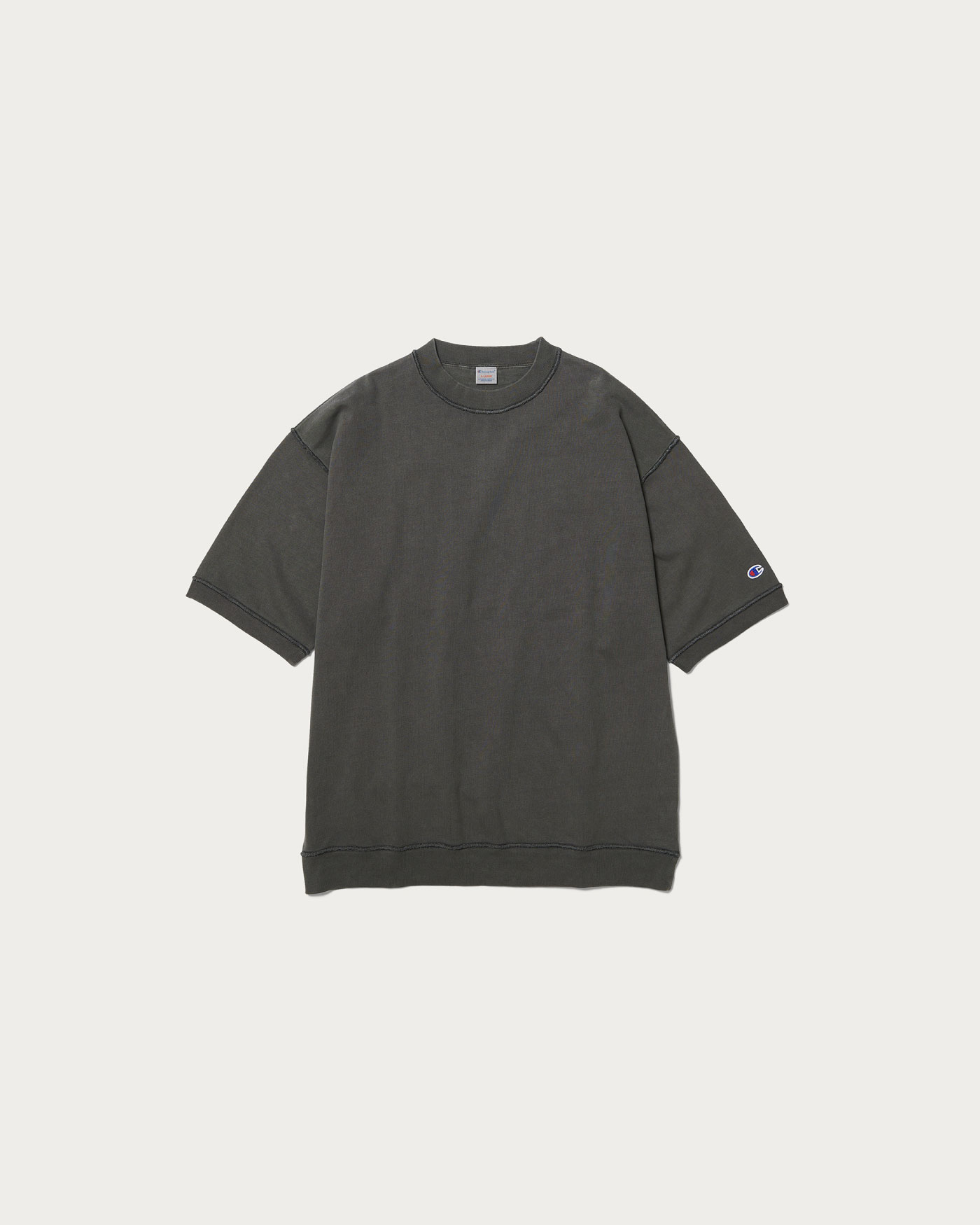 〈Champion〉との別注アイテムです。肉厚な天竺を使用し、ピグメント加工による退色感がポイントのオーバーサイズのスウェット型Tシャツ。