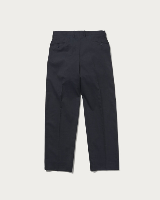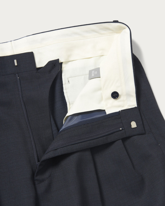 一見クラシックなドレス顔のピンヘッド生地ながら、ウールとコーデュラナイロンの混紡糸と再生ポリエステルを使用。耐久性に優れ品質基準を大きく上回る。シルエットは単品でもスタイリッシュに見えるトラウザーデザインで今シーズンは少しカジュアルな要素を取り入れるためサイドに飾りステッチを追加しています。