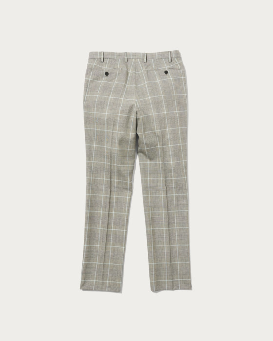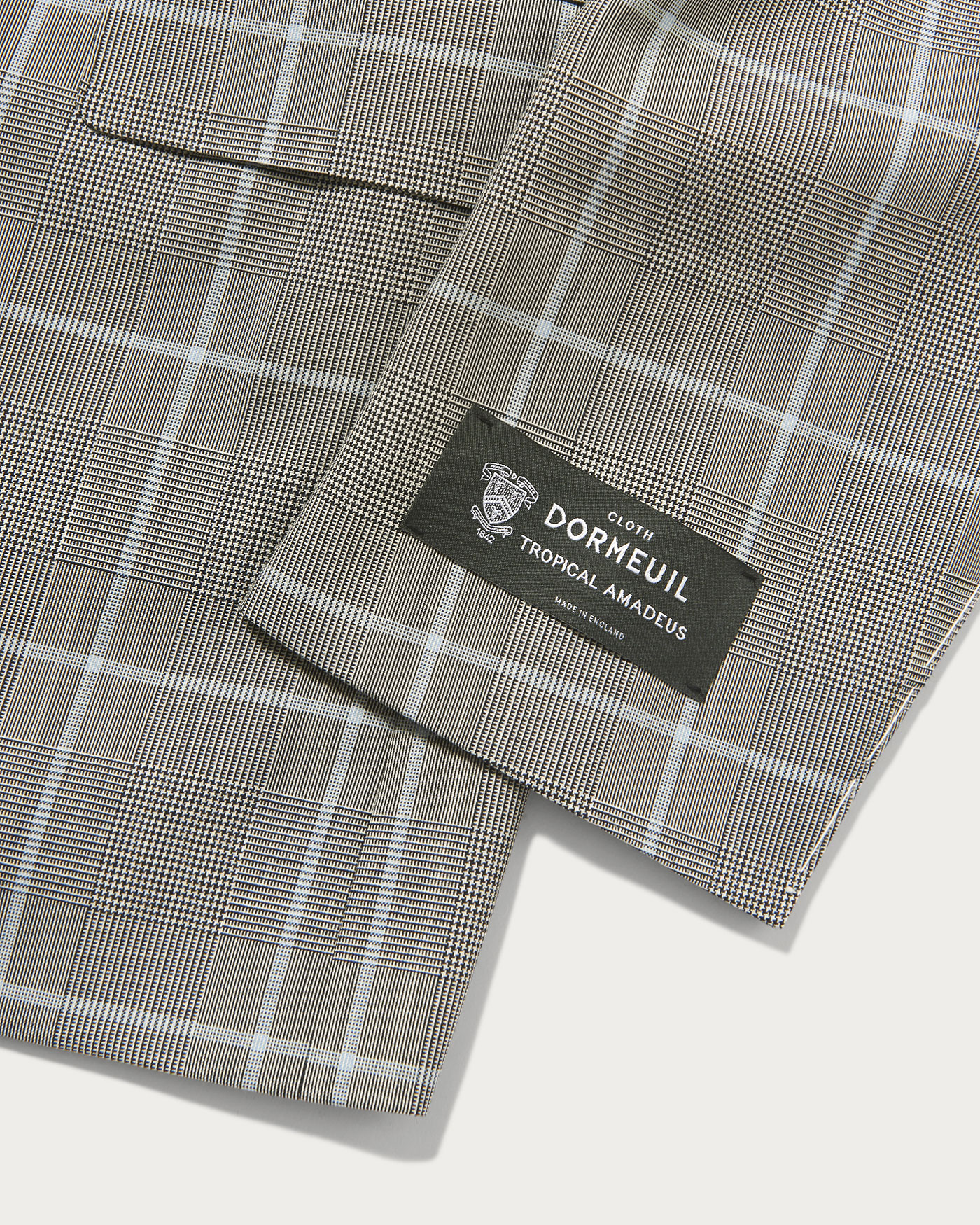 ドーメル社の春夏シーズンの定番生地「トロピカル アマデウス」で仕立てたスーツ。なめらかな質感と華やかさや艶やかさがあり、暑い時期でもさらっとしたした肌触りで着心地がいいのが特徴です。淡い色めのグレンプレイド柄に薄いブルーのペーンをのせた、清涼感のある色柄となっています。形は「レギュラー」モデルで、肩パットをなくしたナチュラルなショルダーラインや、程よくシェイプされた胴回りなどコンフォートなデザインとなっています。