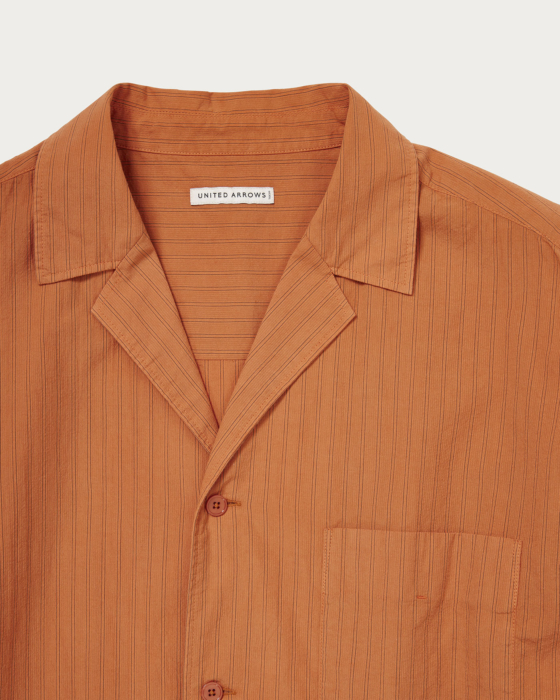 シャリ感が特徴のボイルストライプ素材を使用したオープンカラーシャツ。ストライプのシャツ地を製品染めすることでラスティックな風合いにしています。肌離れが良いドライなタッチも特徴です。