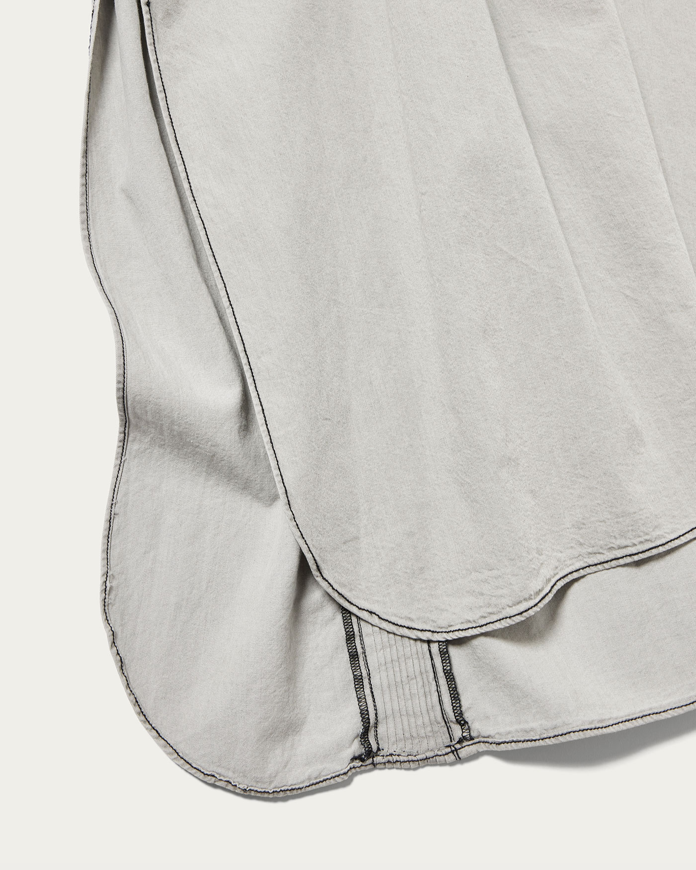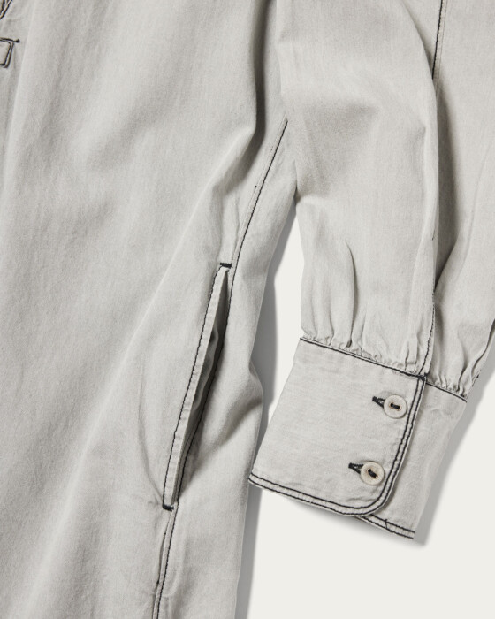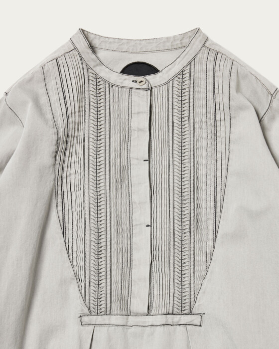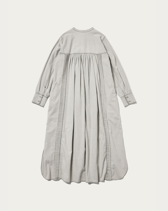 1stシーズンから定番で展開している"Trinity"。胸回りの生地を切り替えたメンズのフォーマルなブザムシャツを、女性の日常に組み入れたシリーズです。前面と背面に手仕事による細やかなピンタックを施し、春夏らしい淡いデニムカラーで仕上げました。ゆったりとしたシルエットながら、バンドカラーを採用することで清潔感と気品を感じられるワンピースです。