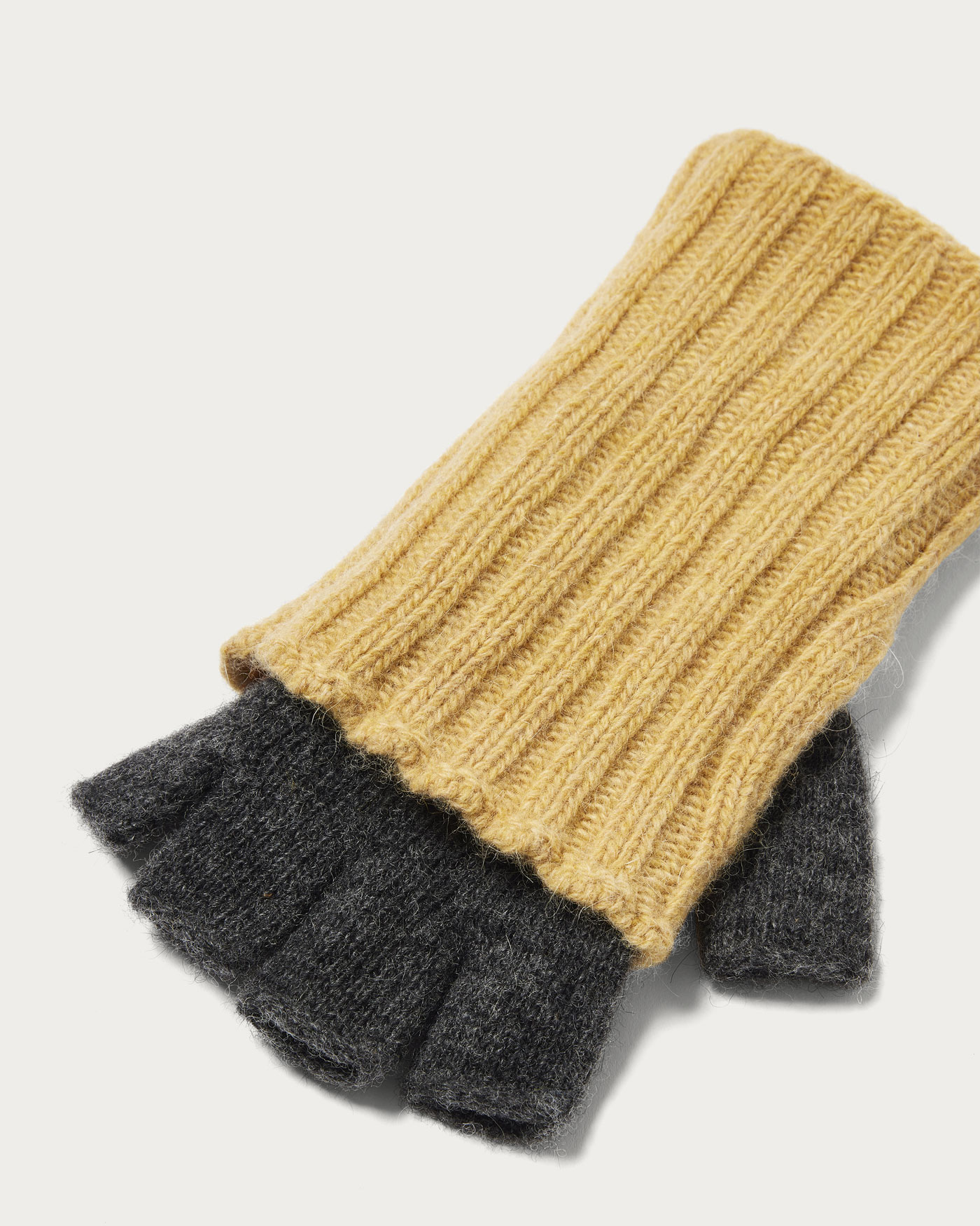 ツートーンの穏やかなコントラストが目を引くフィンガーレスグローブ。折り返し部分を伸ばすと手首を覆うアームウォーマーに。冬のギフトにもおすすめなアイテムです。