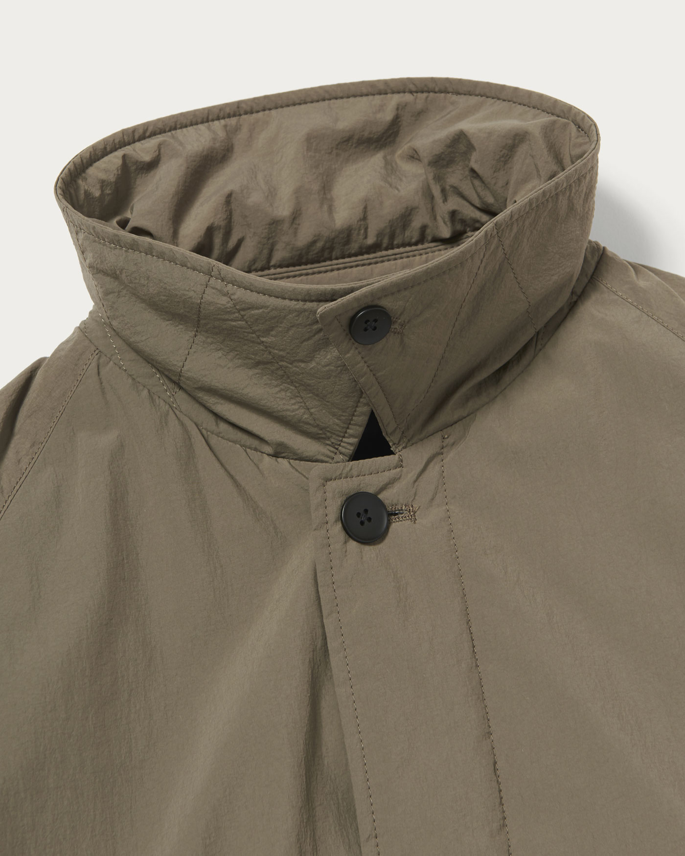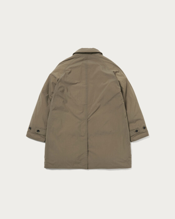 「ADVANCED DOWN SYSTEM(ADS)」を使用し、撥水機能を付与したワッシャーナイロンを採用したバルマカーンコート。中綿感覚の薄手ながらもダウンを封入しているため軽くふんわりした着心地。ADSは表から見えない中側の構造を指し、ダウンそのもののポテンシャルを、空気の循環が行き渡ることで向上させています。リラックスしたフォルムの膝上丈Aラインシルエットです。