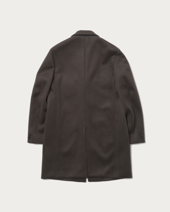 スーパー120s別注メルトンを使用したチェスターコート。原毛が長いスーパー120sを使用し、滑らかさと上品なツヤの高級感のある生地が最大の特徴。今シーズンは新色としてオリーブとミニチェックを展開いたします。ややアームホールにゆとりを持たせ、重ね着等によるごわつきも軽減しました。
