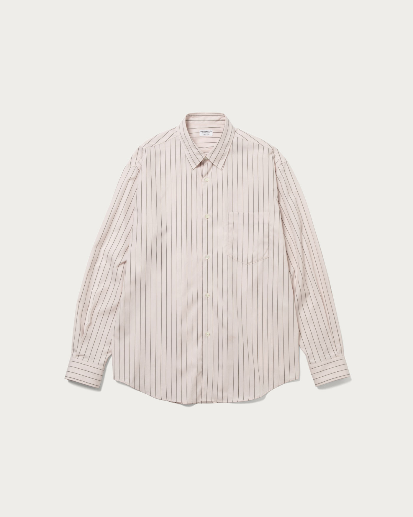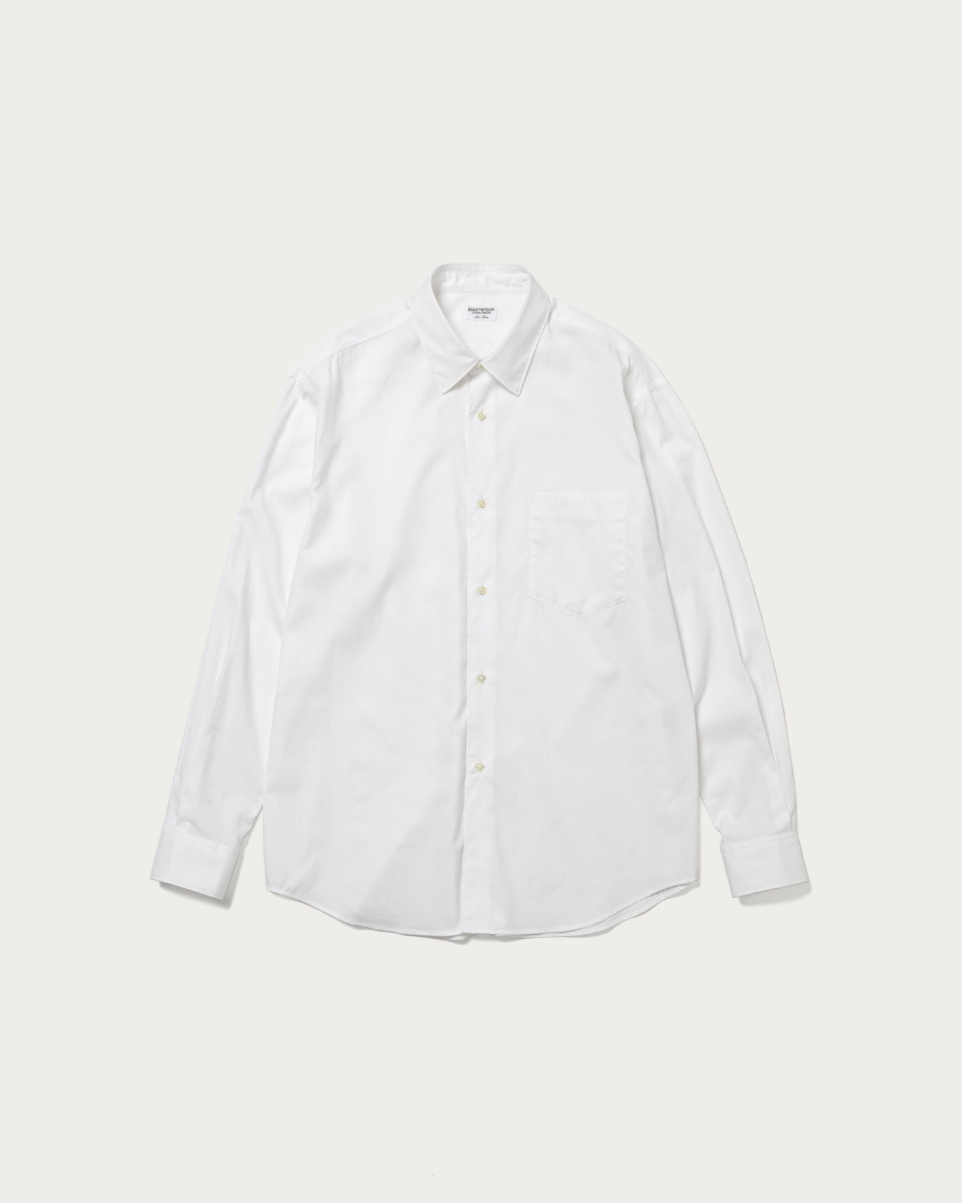 スイスの老舗紡績メーカー、スプーリー社によるオーガニック100%のギザコットンを使用したブロードシャツ。身幅に対しネック寸法を狭く設定することで、第一ボタンを開けた際の品の良さを演出しています。