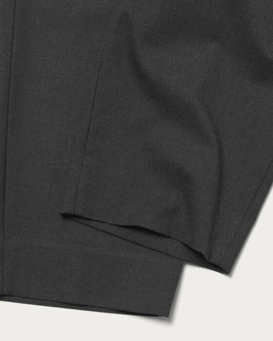 ウエストアジャストタブを調整し着用するデザインスラックス。ウエストアジャストタブにある中央釦(真ん中)で表記通りのウエストサイズになります。ウエストを絞ることにより脇に出来るタックがフワッとしたシルエットを生みます。やや厚手でシルエットが出やすいテトロンレーヨンツイル生地を採用しております。