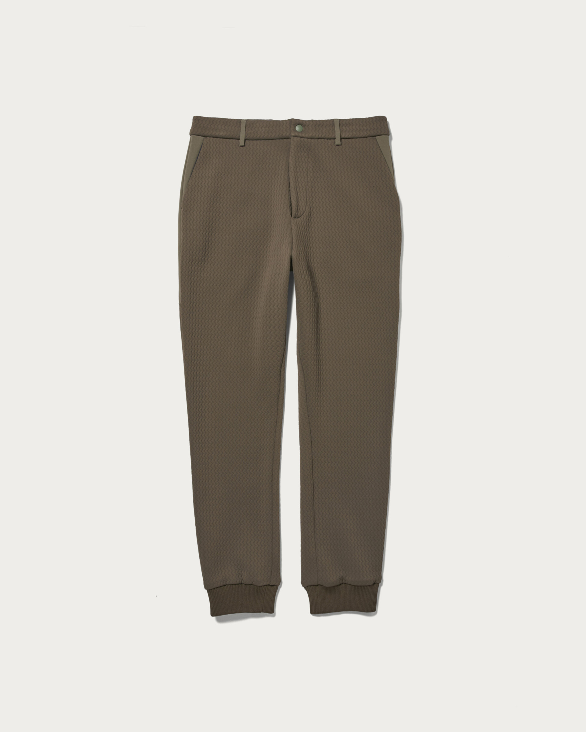 ポリエステルのジャージ素材を使用した細身のジャガーパンツ。シンプルながらも凹凸感のある立体的で表情のあるデザインがポイント。ヒップ周りに別生地を貼り合わせています。同素材のブルゾンをあわせセットアップとして着用いただけます。