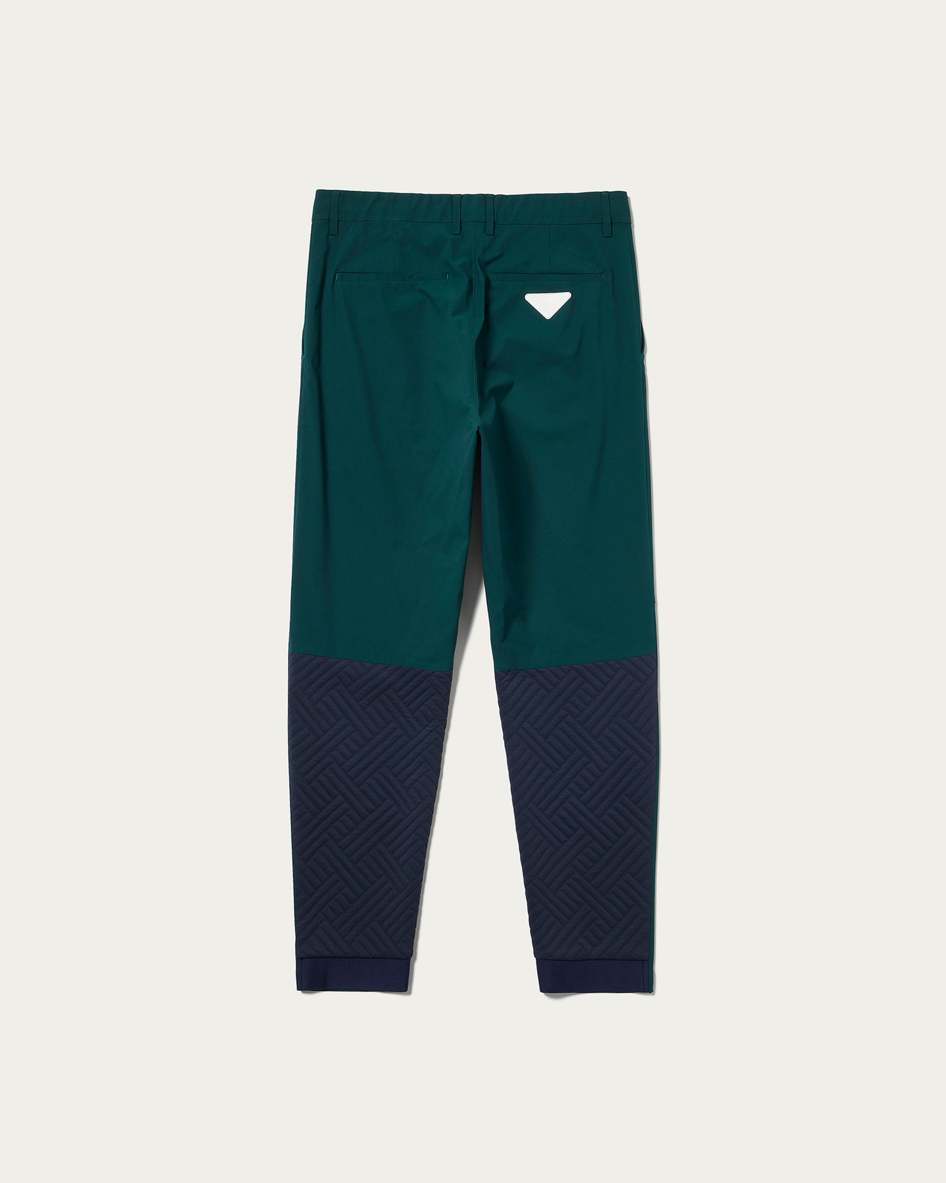 ハリのあるポリエステル素材とソフトな素材を組み合わせデザインしたスリムテーパードパンツ。同素材のジャケットをあわせセットアップとして着用いただけます。