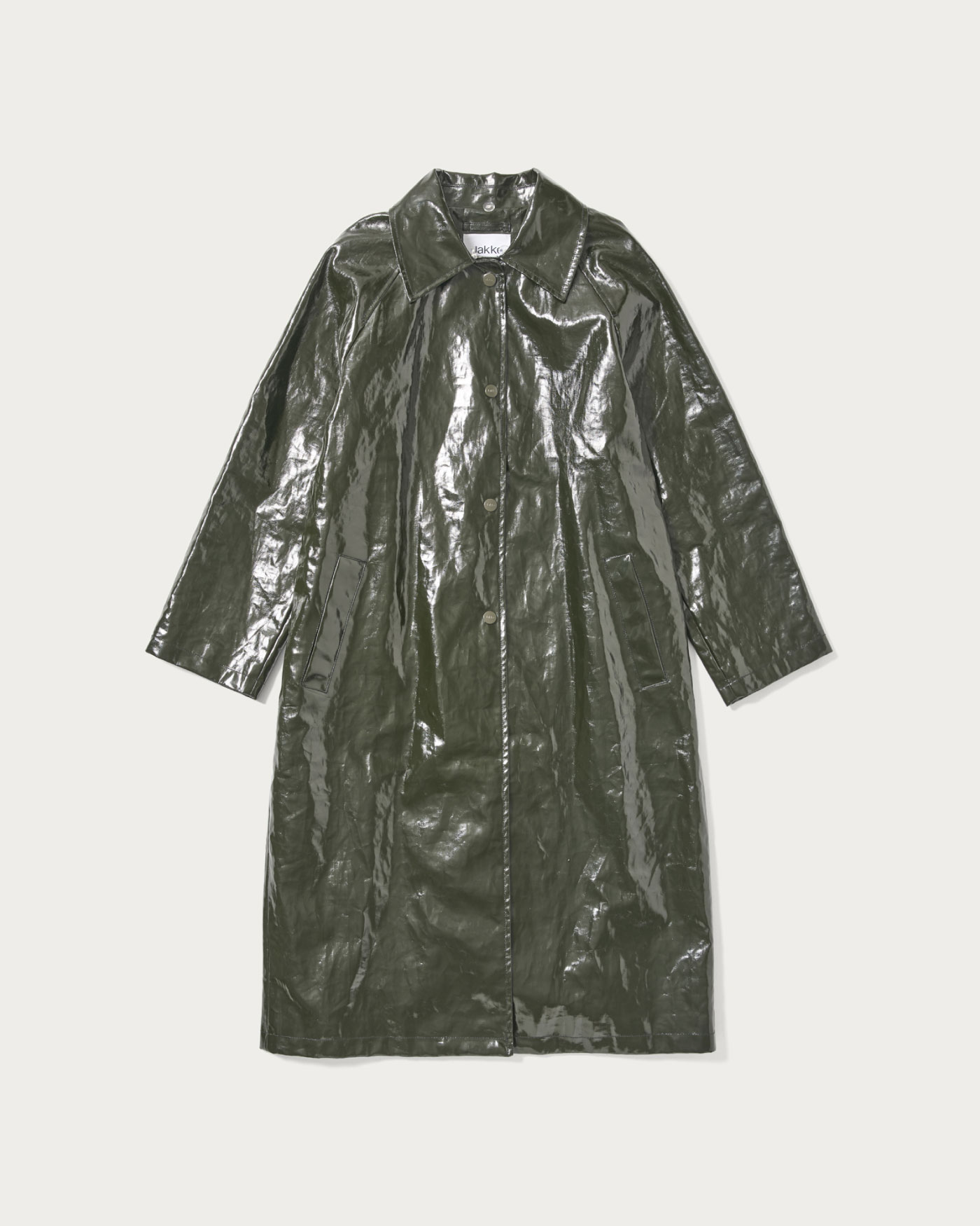 襟元がファーライク仕様で、エナメル素材のレインコート。取り外しができるファーライクのカラーは、その日の気分でアレンジを楽しむことが可能。雨の日のはもちろん、デイリー使いでも活躍を叶える洗練されたデザインです。