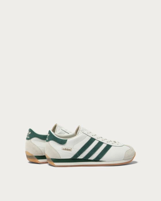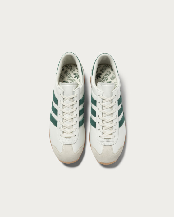 アイコニックなスリーストライプスとヒール部分を温かみのあるスエードに変更した別注モデル。インラインとは異なるカウレザーをアッパーに採用。オリジナルの雰囲気は残しつつ、シュータンのロゴは外して、シックなグリーンカラーとやや明るめのガムソールでクリーンな印象に仕上げました。