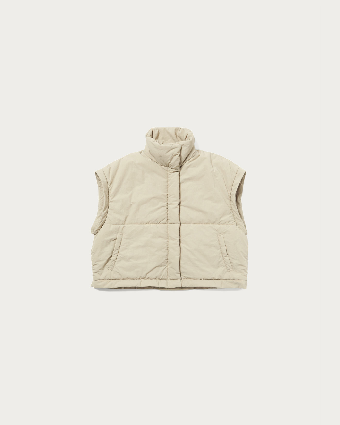 袖と裾部分が着脱可能でさまざまな着こなし方が楽しめるマルチウェイデザインのアウター。薄手の合繊素材に中綿入りの仕様なので軽さも嬉しいポイント。袖部分だけを外してロングジレに、裾部分だけを外してショートアウターに、袖と裾を外してパデッドベストにと、一枚でいろいろな着こなしができるので長い期間着回しできる万能アイテムです。