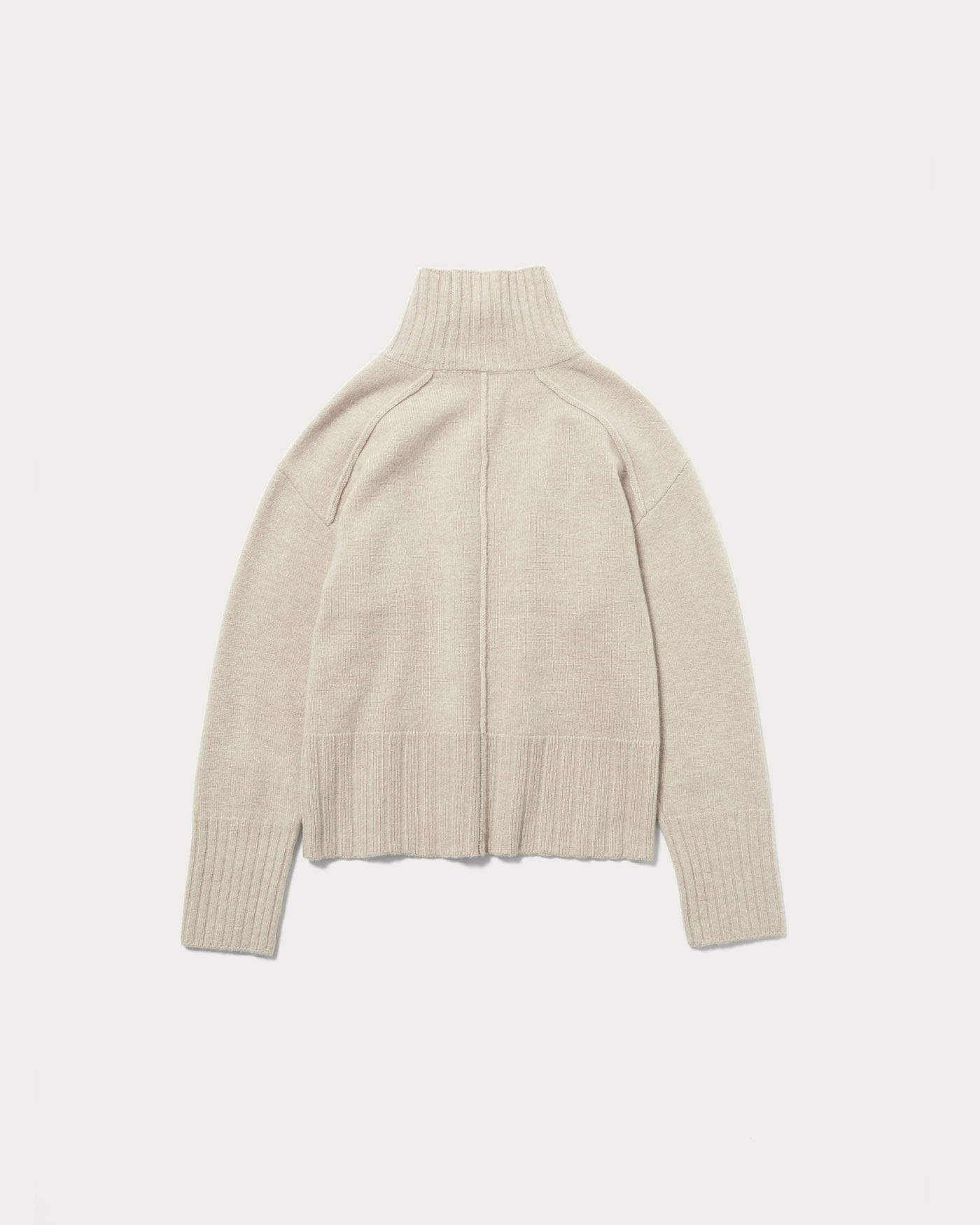 ボクシーシルエットのハイネックニット。太めに効かせたリブと袖口のボタンデザインがベーシック過ぎないポイントに。さまざまな着こなしで活躍する、冬に1枚あると便利なアイテムです。ミドルゲージの天竺編みでソフトな風合いを生かしつつシンプルになり過ぎず、程よくカジュアルにも着回せる印象に仕上げています。ライトトーンのカラー展開は、冬でもクリーンな印象の着こなしが楽しめます。