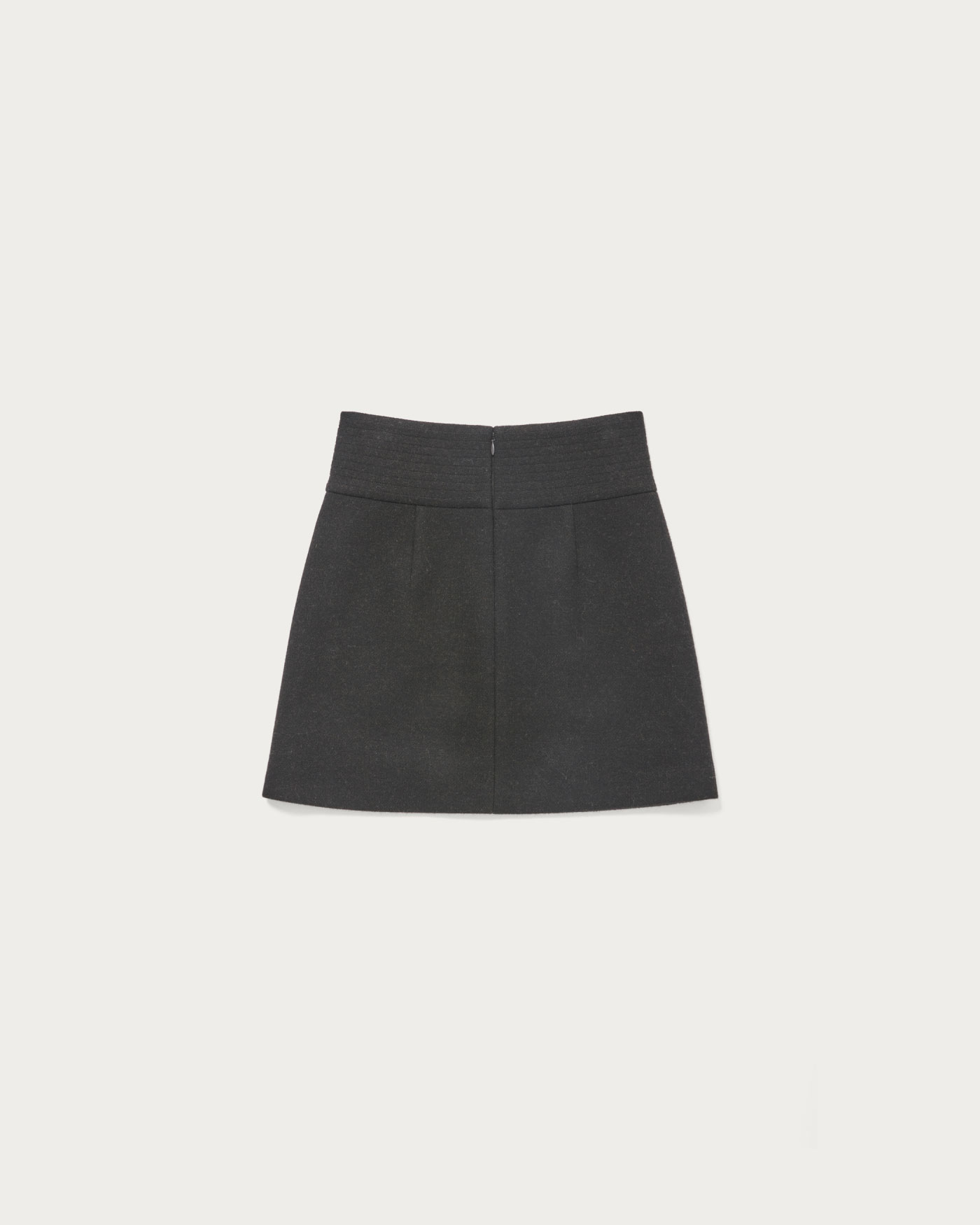 ボンディング素材の特徴を活かしたミニマルなデザインのミニスカート。やや台形のシルエットで甘すぎない印象。太巾のベルトにステッチを効かせてモード感をプラスしました。ツイードとスポンジッシュな素材をボンディング加工で張り合わせた独特な反発感がモードな印象に見せてくれます。安心感のある厚さのしっかりした肉感。