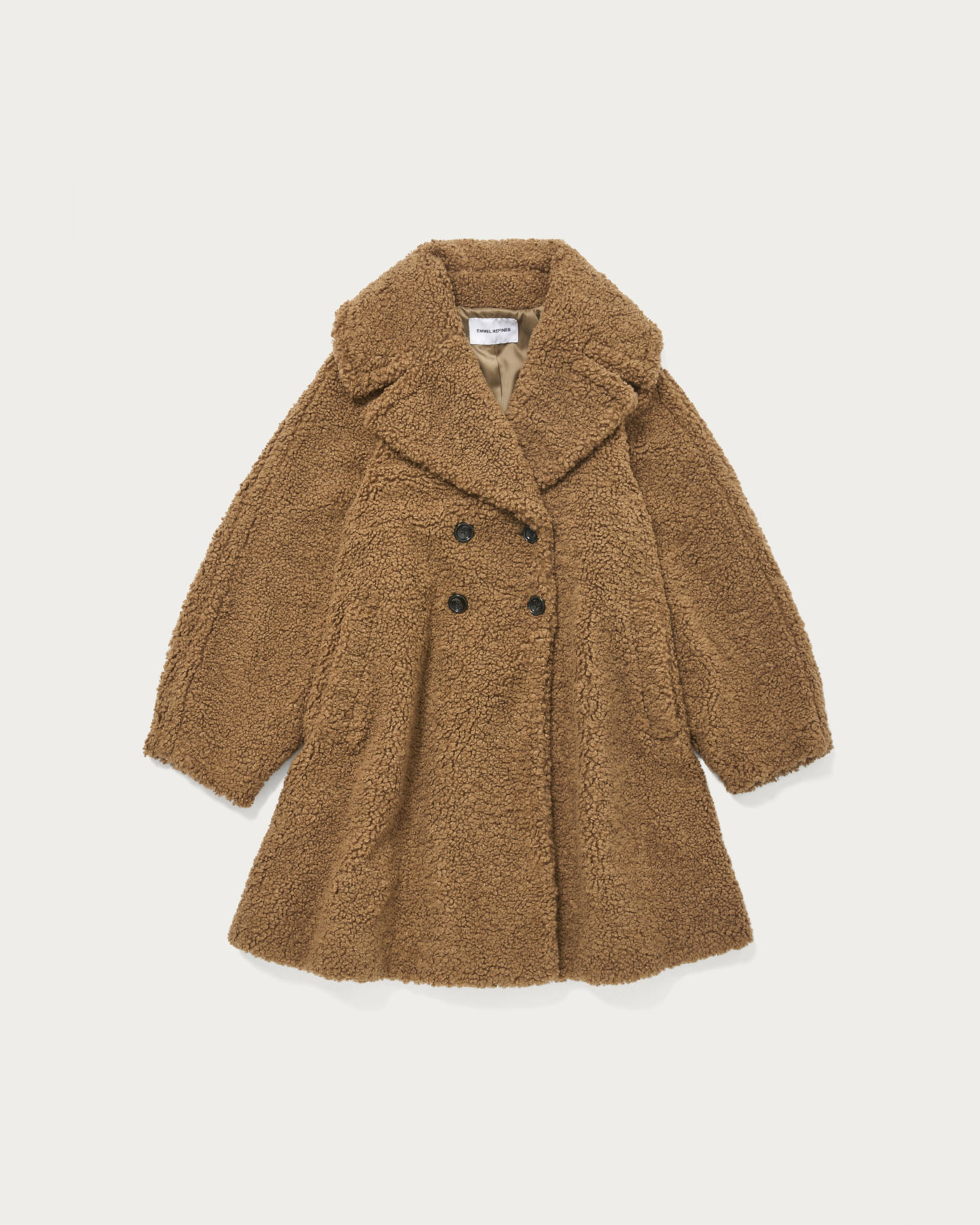 トレンドのくるくるとしたボア素材でお作りしたコート。大きめのカラーとダブルのフロントでカジュアルに着られるデザインで仕上げています。ボリュームのある袖やフレアに広がる裾など、どこから見てもかわいい一枚。太めのステッチ使いで、ボアの表情がでているのもこだわりのポイントです。