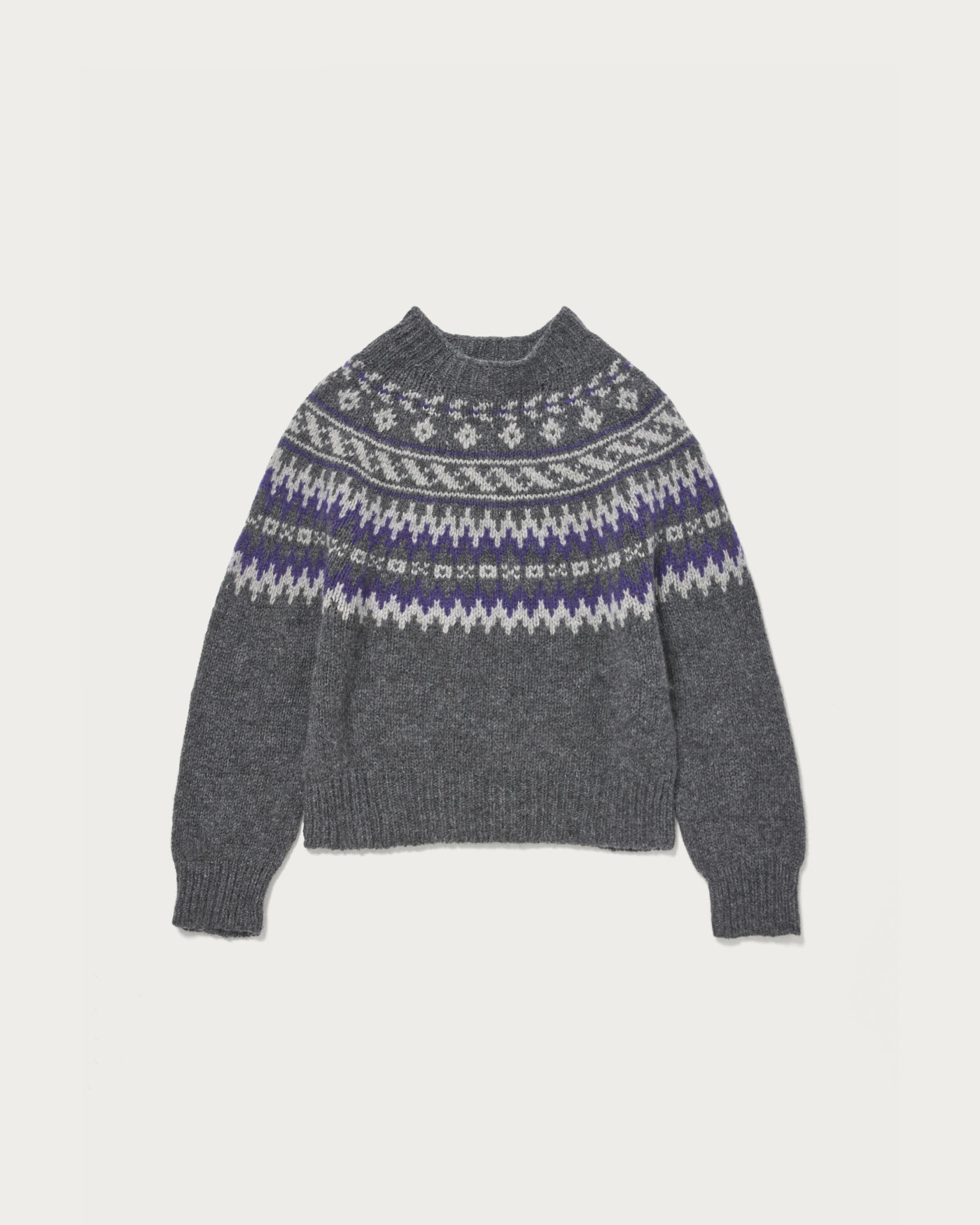 〈Harley of Scotland〉より、ノルディック柄が目を惹く別注ニットが登場。メンズ用のオーバーサイズのシルエットを着やすいように着丈を短くお作りしました。今シーズンはベーシックなカラーにアクセントに洗練されたカラーが入ることでほっこりしすぎず着用いただけます。