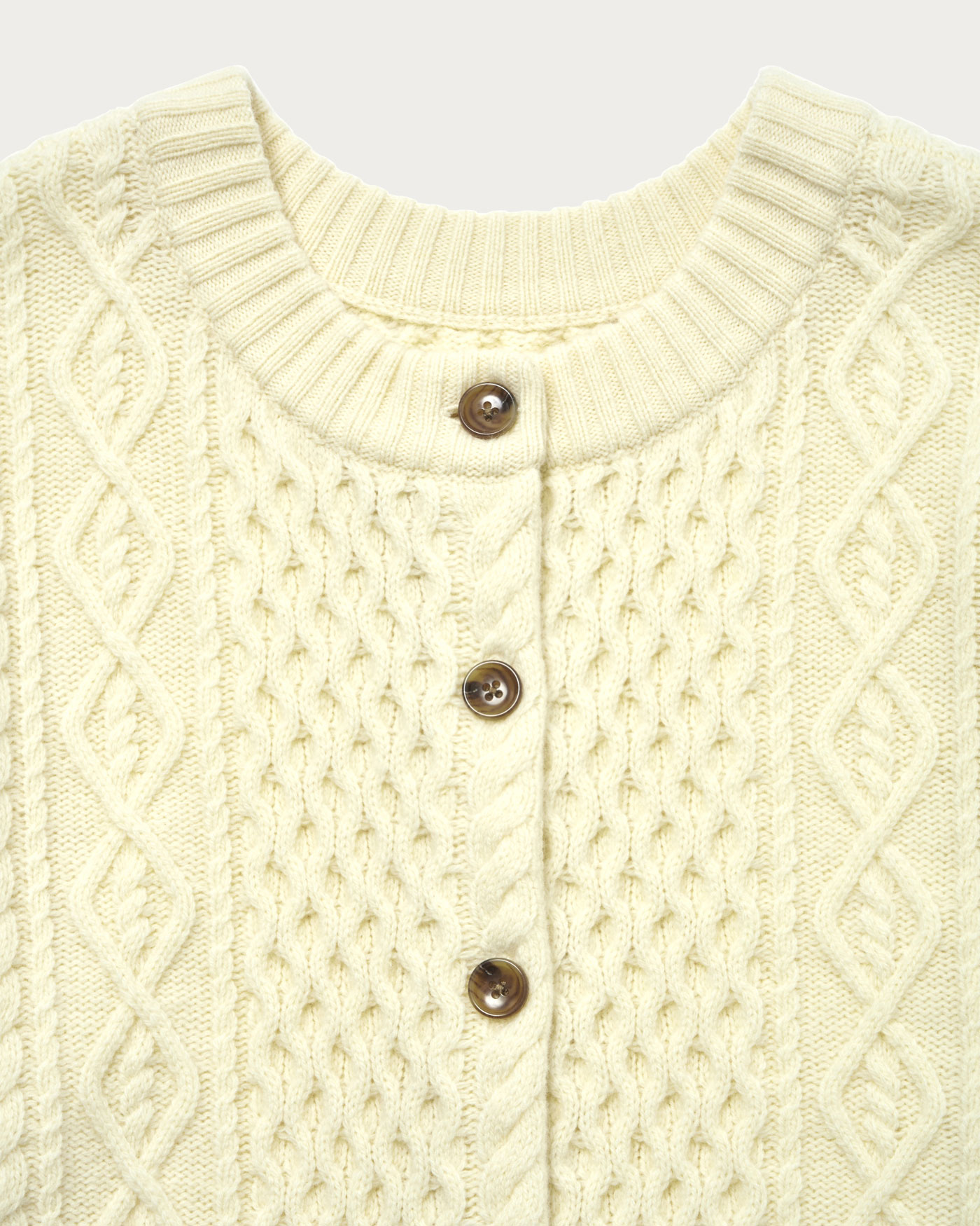 コーディネートの主役になるアラン編みのニットカーディガン。ふわりとした袖のボリュームデザインとコンパクトな着丈のバランスにこだわってお作りしました。気分によって違った着こなしを楽しめる前後2WAY仕様も嬉しいポイント。シンプルなボトムスを合わせるだけでコーディネートが決まります。