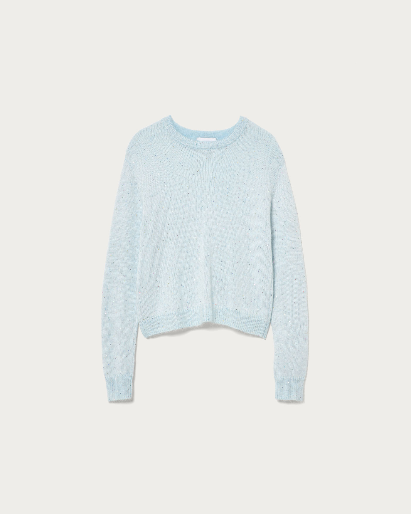 アルパカ混のあたたかみのあるニットに、細かくカラフルなスパンコールを施したプルオーバーニット。ほどよく毛足感のある柔らかな印象に仕上げました。ボトムスとのバランスが取りやすいよう、程よく短めの着丈に。華やかにも、カジュアルにも着られる一着です。