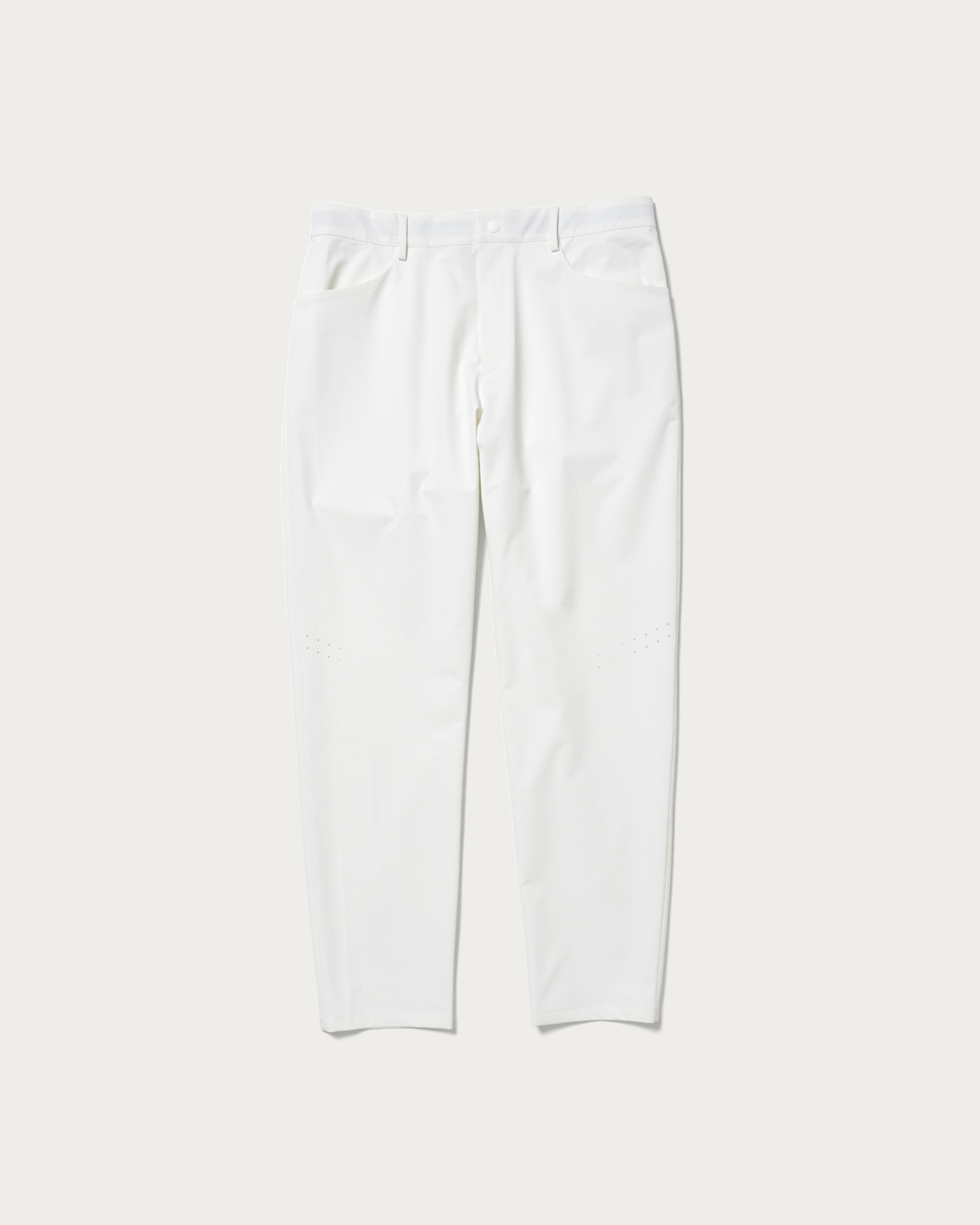 軽量で透けにくいポリエステル素材を使用した細身シルエットのノープリーツパンツ。膝周りにはパンチングデザインが施されており、通気性を意識したデザインが特徴的です。