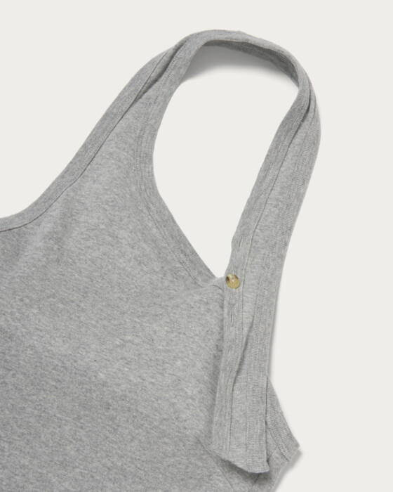 スポーティームード漂うホルターネックタンクトップ。ネック部分はボタンで長さの調整が可能かつ、パット付きのため一枚で着用いただける機能性にも優れた一着です。