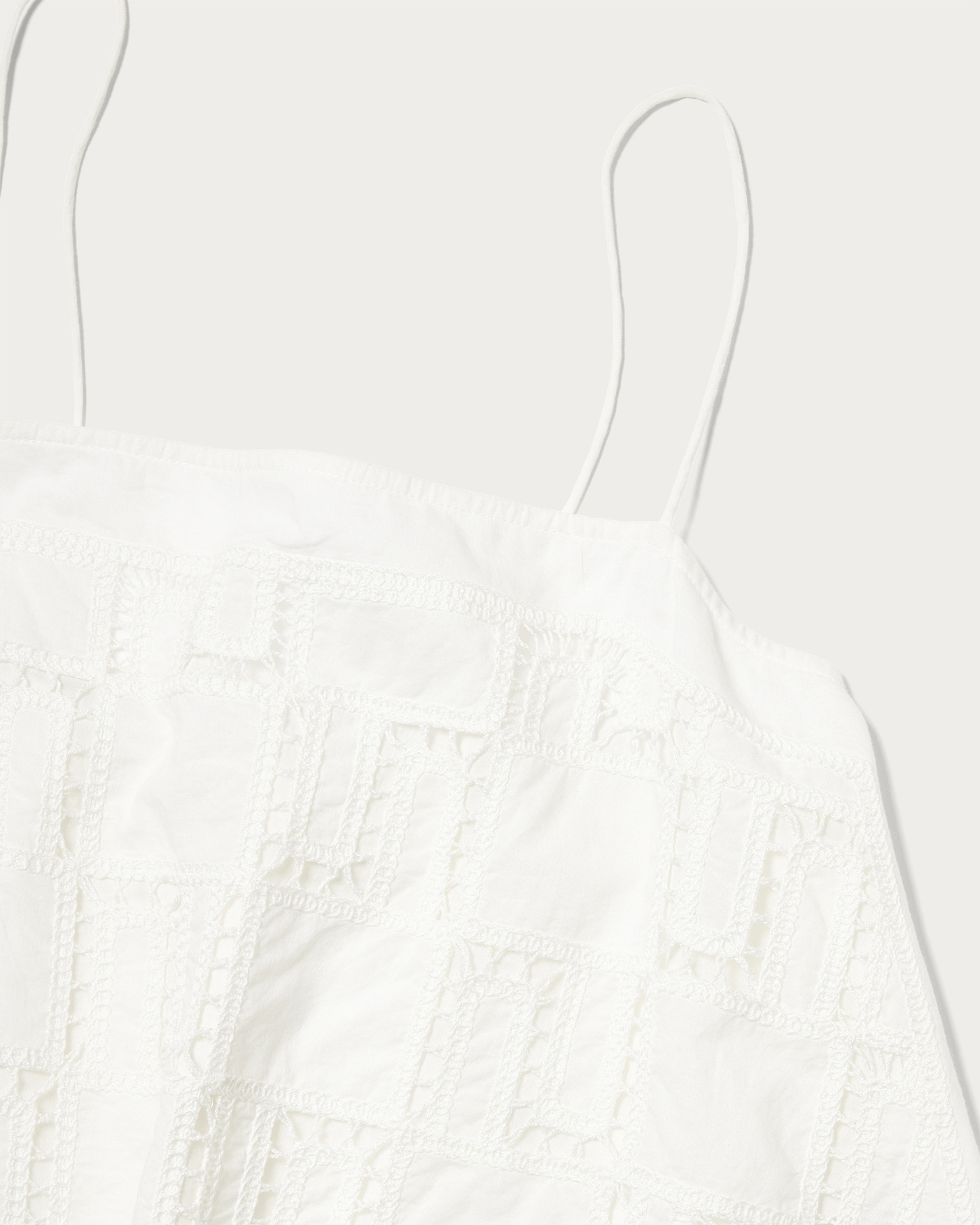 立体感のあるシフリー刺繍が目を惹くキャミソールは、大胆な刺繍柄を全面に活かした取り入れるだけで着映えする一着です。程よくフィットするバックゴムの仕様や後ろの紐の結び方で長さ調整可能なのもポイントです。