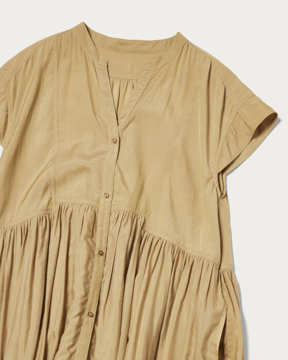 ふわりと揺れるギャザーが目を惹くワンピースは、ボタンを閉めてワンピースとしても開けてロングカーディガンのようにも羽織れる着回し力が魅力の一着。ボイル素材にたっぷりとギャザーを施し、軽やかに仕上げました。胸下の高めの切り替えや、コンパクトな肩周りのデザインですっきりとした印象に。肩回りをさりげなくカバーしてくれる袖丈も嬉しいポイントです。