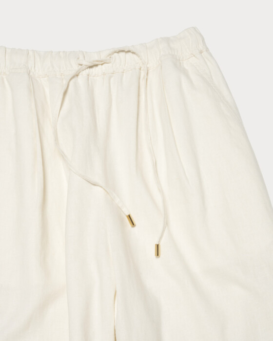 リネン×レーヨンの涼し気で軽やかな素材は、ドライタッチで快適な着心地が魅力。太すぎない絶妙なワイドストレートシルエットで、タック入りのデザインがウエスト周りをすっきりとした印象にしてくれます。ウエストゴム仕様なのも嬉しいポイント。