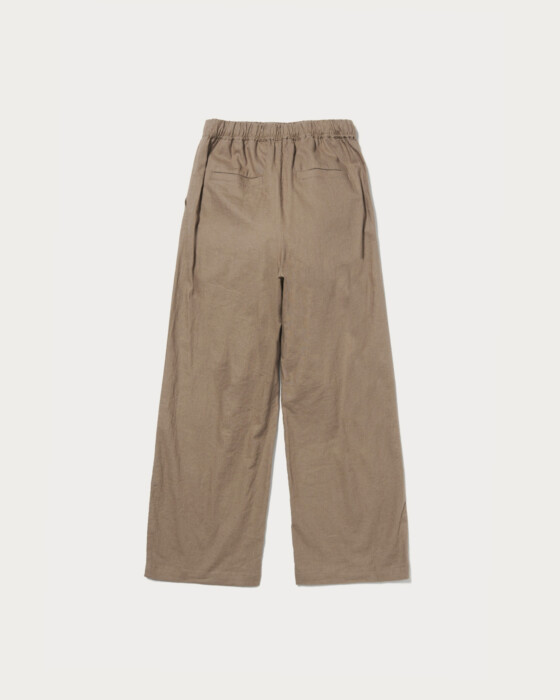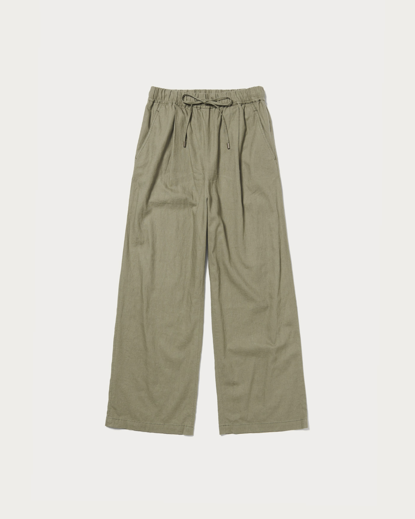 リネン×レーヨンの涼し気で軽やかな素材は、ドライタッチで快適な着心地が魅力。太すぎない絶妙なワイドストレートシルエットで、タック入りのデザインがウエスト周りをすっきりとした印象にしてくれます。ウエストゴム仕様なのも嬉しいポイント。