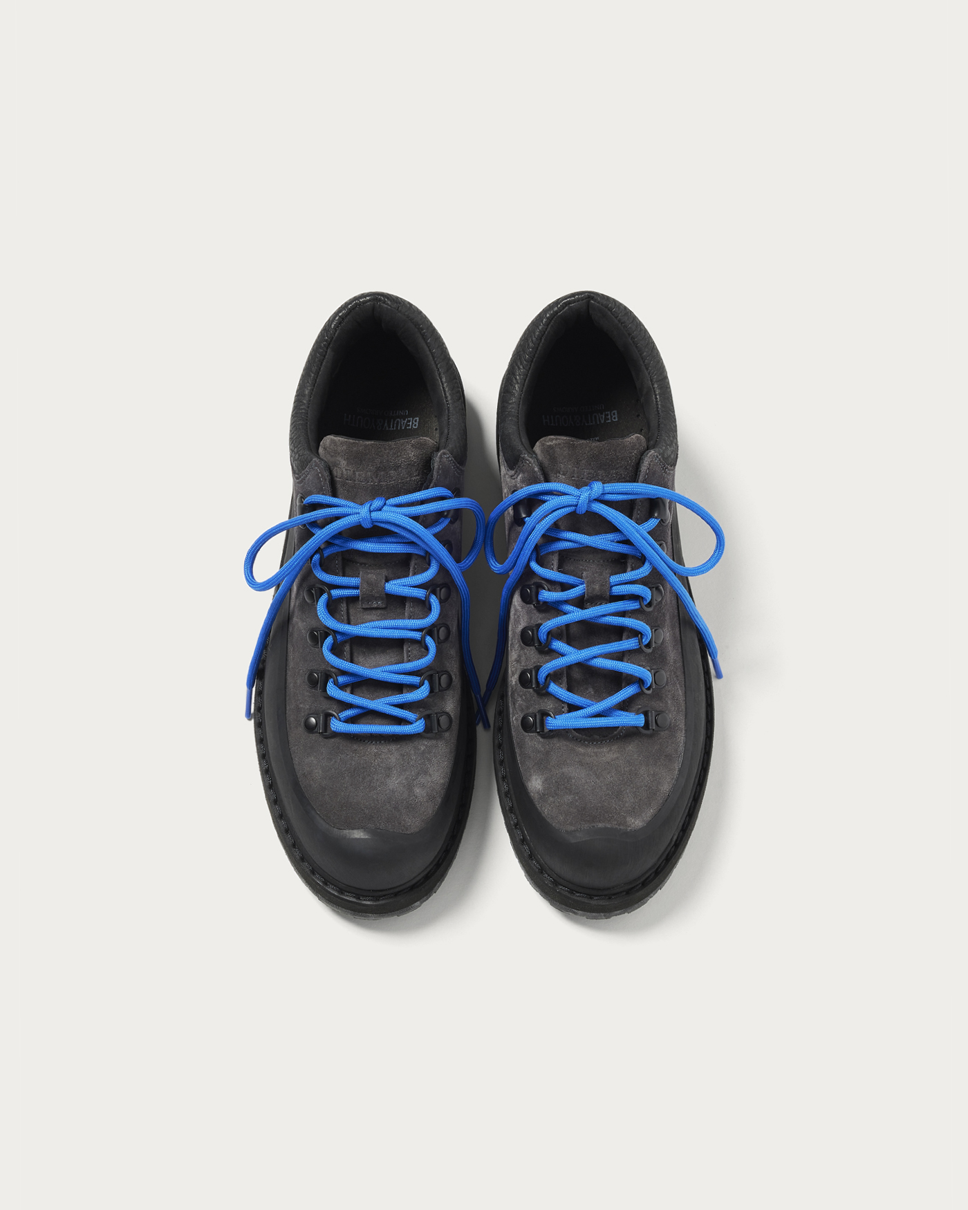 〈ディエッメ〉の定番モデルを〈ビューティー&ユース〉独自の視点で素材&カラー別注。ともにアッパーにはオイルを含んだスエードを採用し、履き口部分のは上質なペブルドヌバックを配することでテクスチャーとトーンのコントラストが増し、力強いフォルムに落ち着きのある印象をプラスしました。