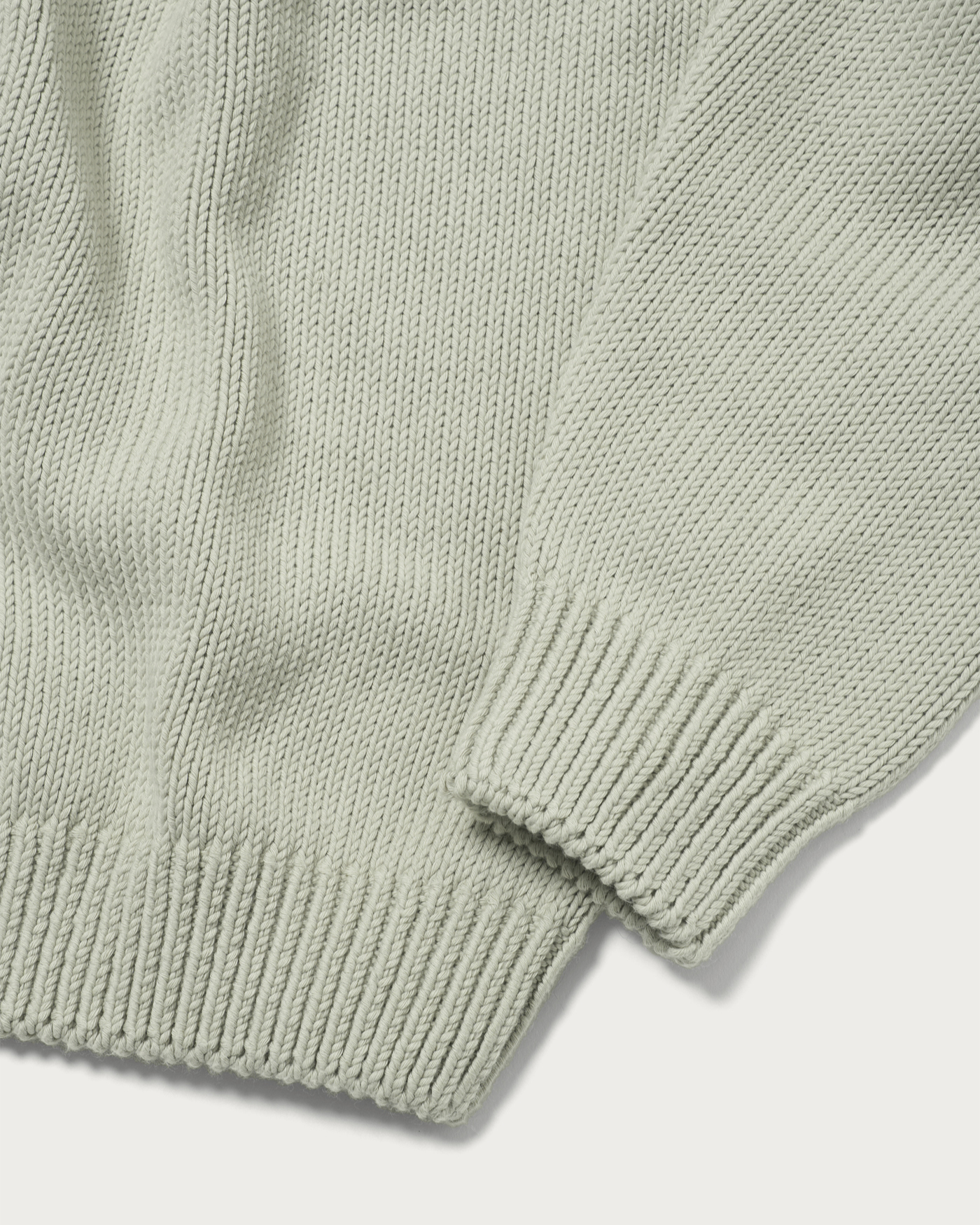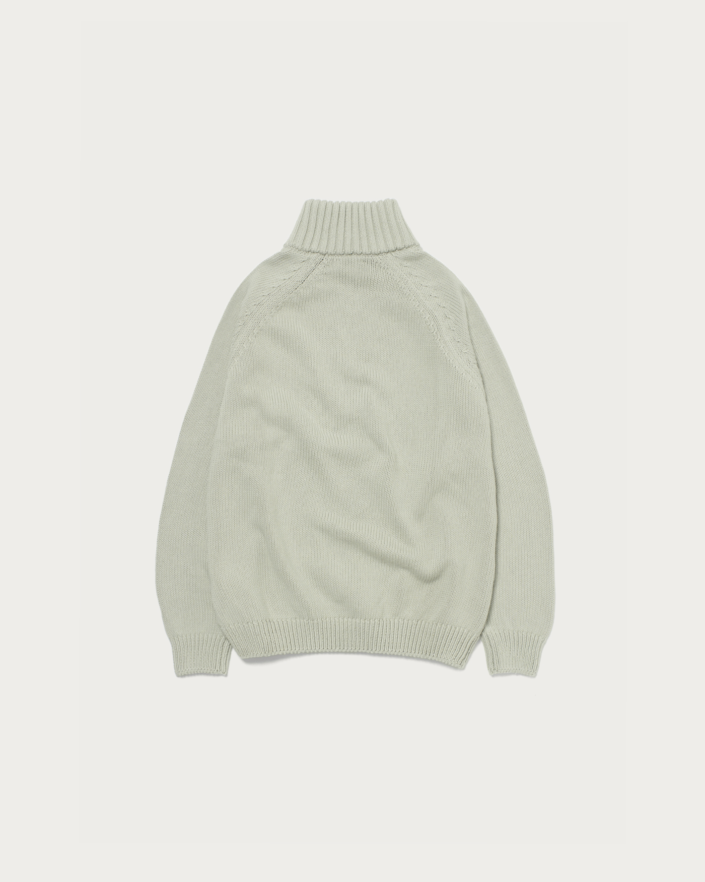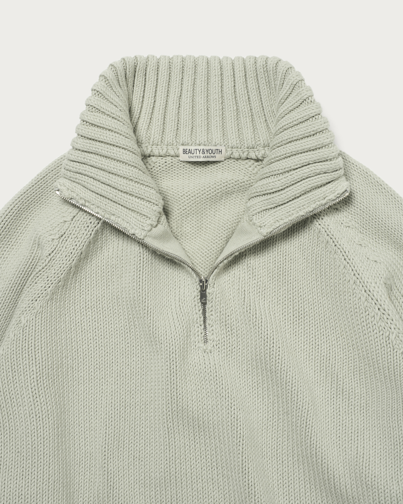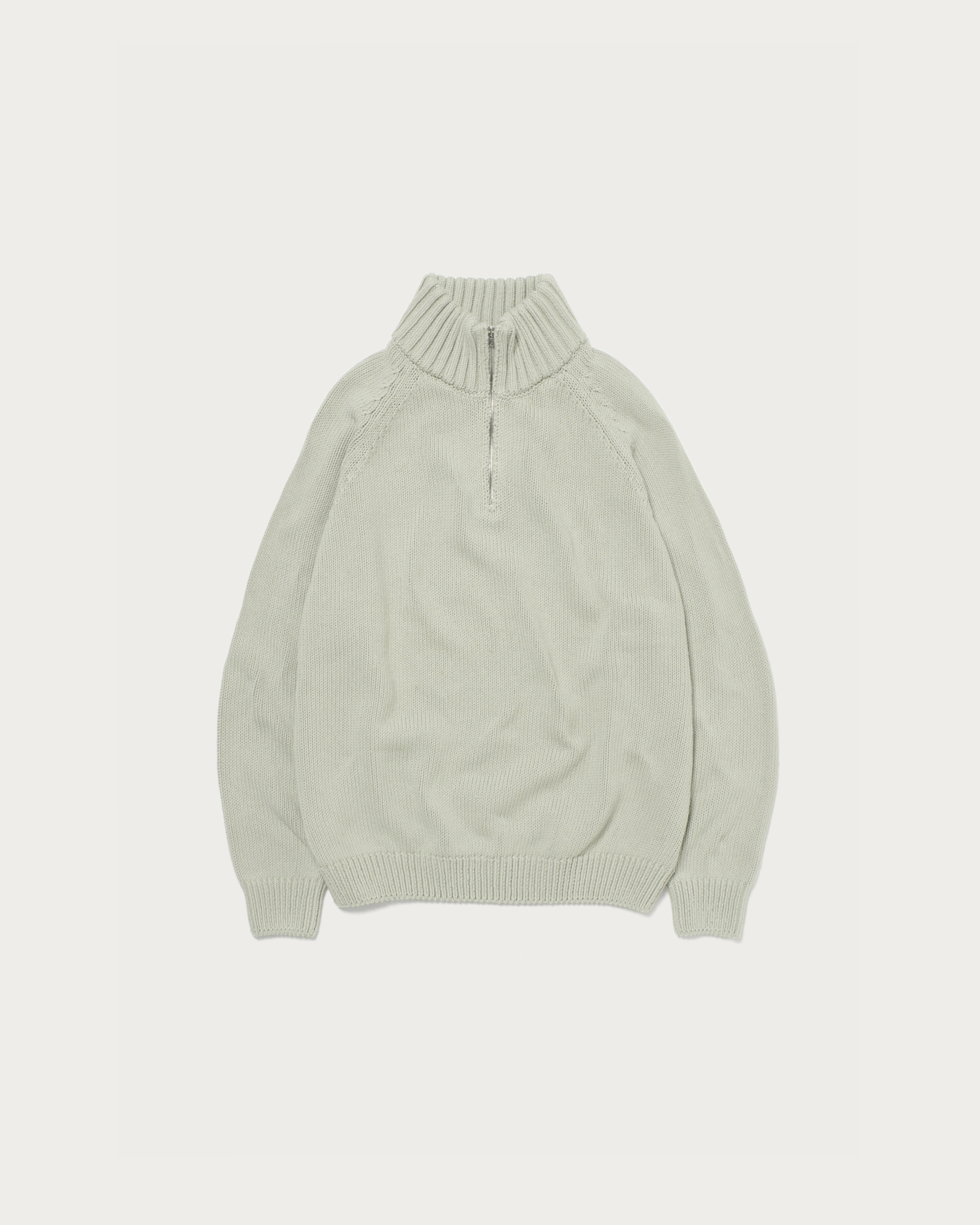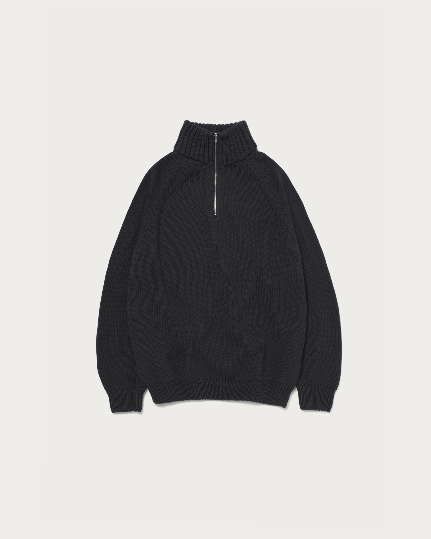 太番手のコード糸で編み上げたハーフジップニット。ゆったりしたサイズ感で袖と裾をリブで絞ったバルーンシルエットに仕上げています。さらっとした肌触り・表情感が特徴のコットン100%のコード糸を採用しました。
