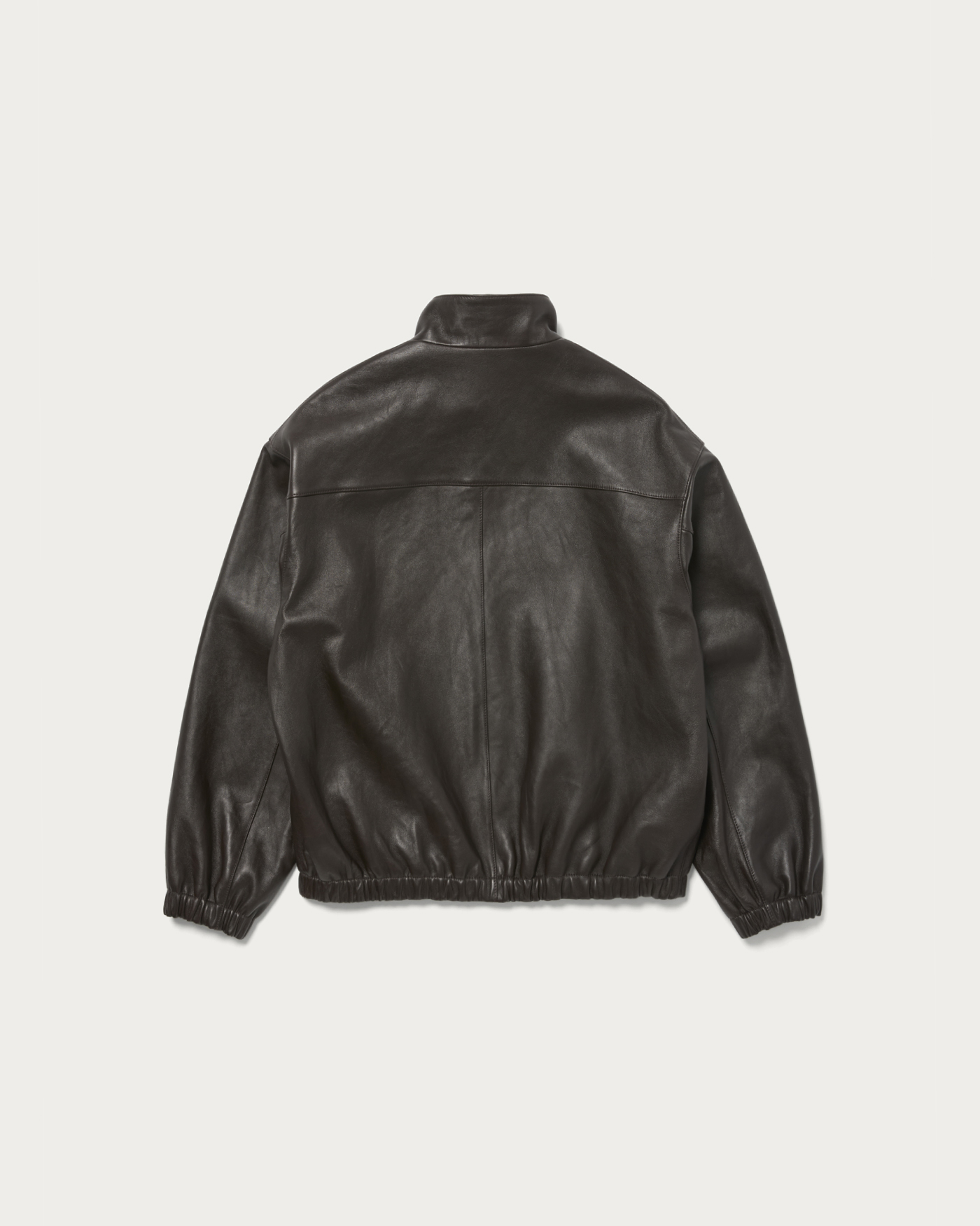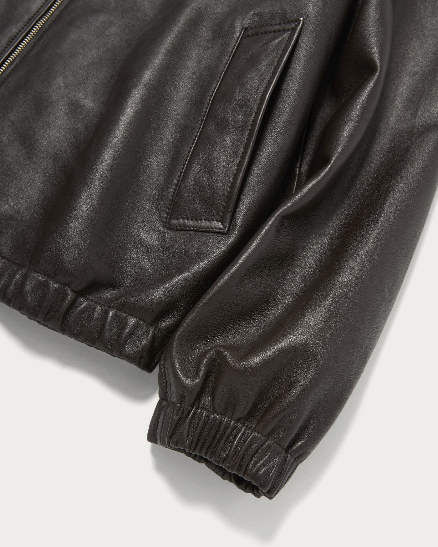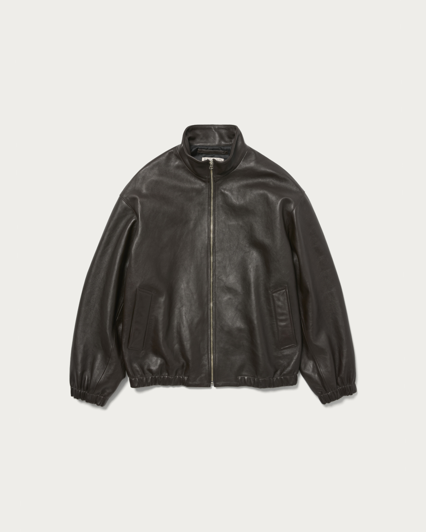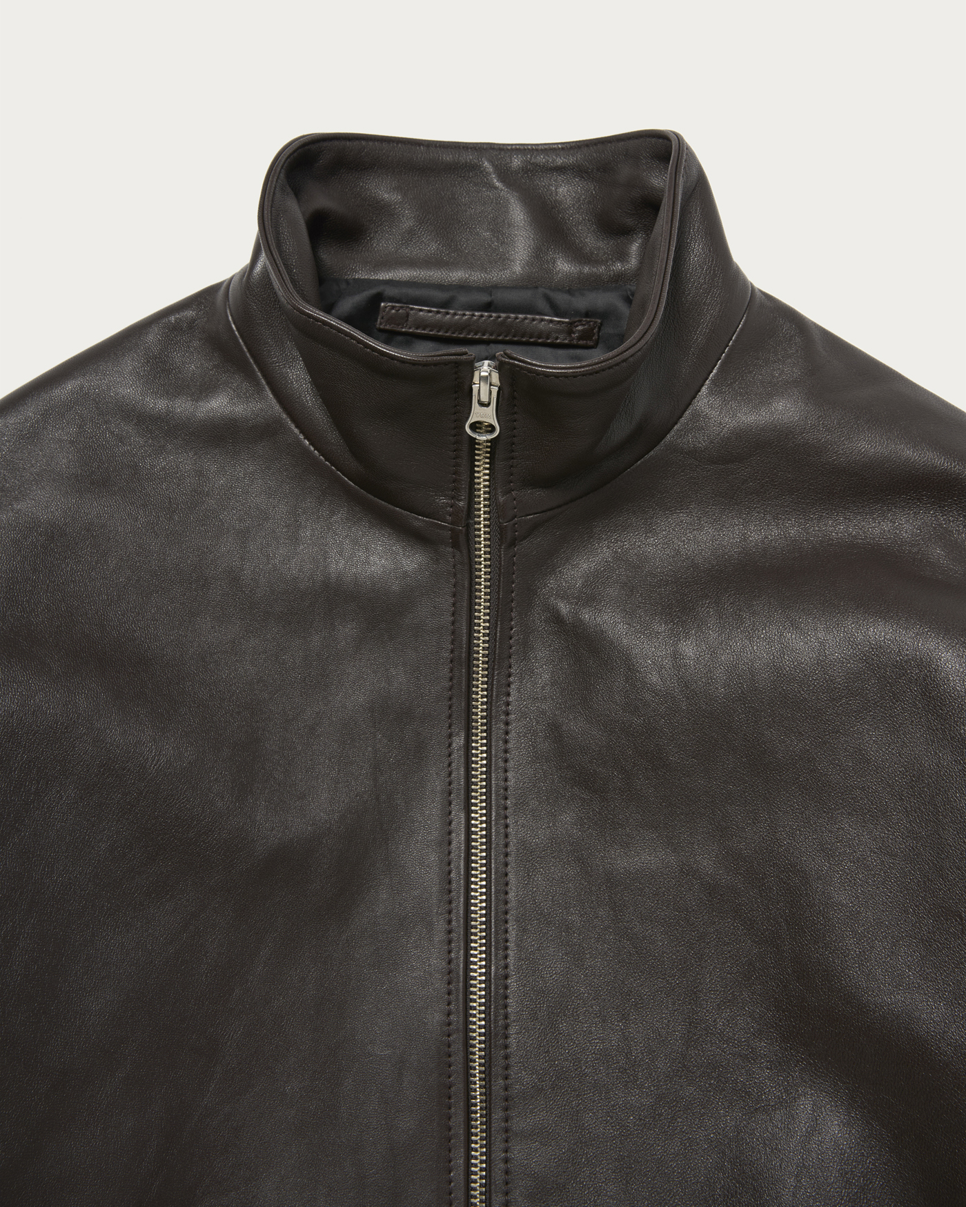 トラックジャケットをベースにミニマルにデザインされた一着。袖口と裾はゴムシャーリングで絞り、少し丸みのあるフォルムを形成し、フロントはIDEAL社の上品な光沢のあるファスナーを採用することで、ミニマルな中にも際立つディテールが生える一着です。セミベジタブル鞣しという、ほんのりとムラ感が残る工程で丁寧に仕上げたダークブラウンシープレザーを採用し、光沢を極力抑え、深みのある色合いが相まって上質なムードを醸します。