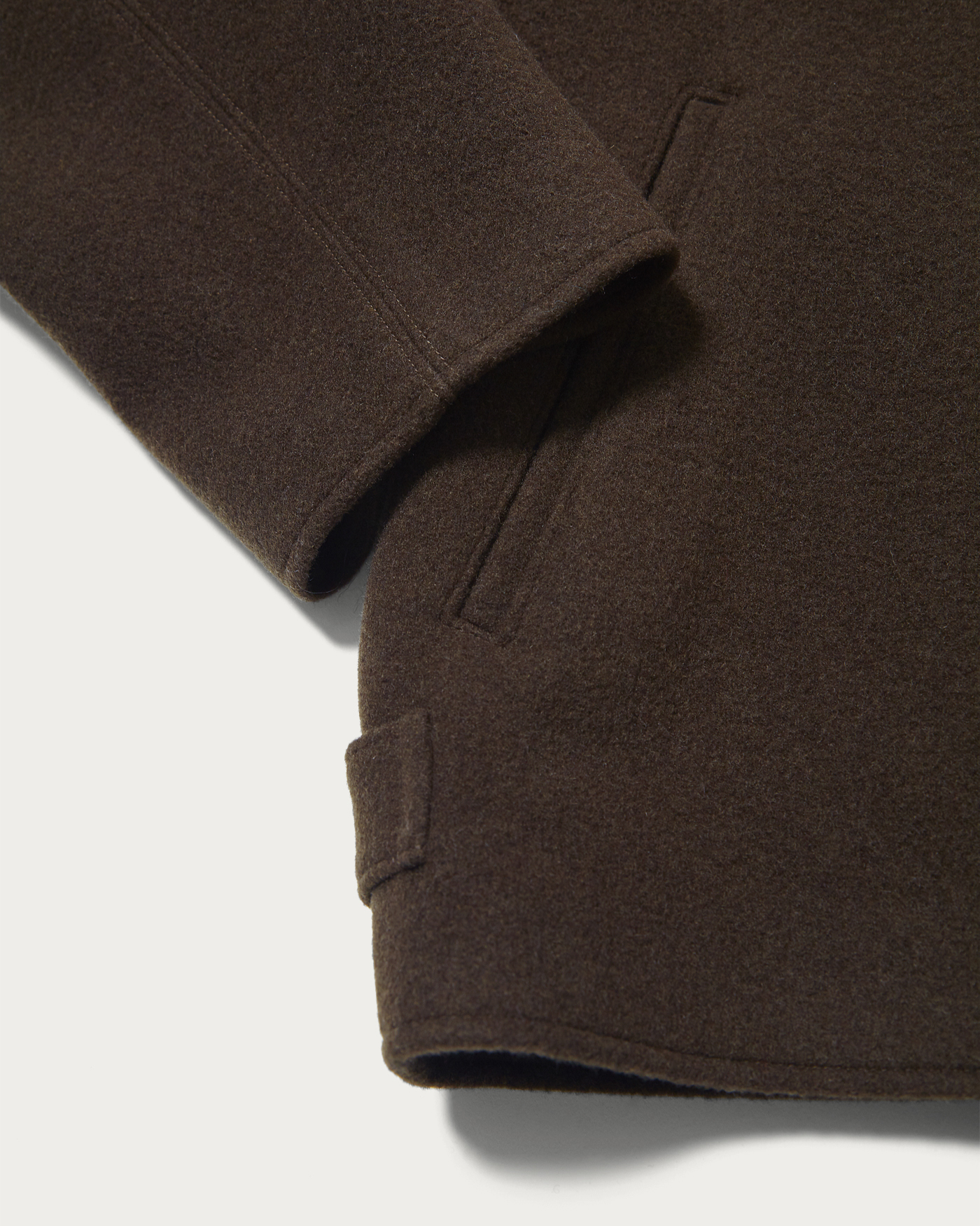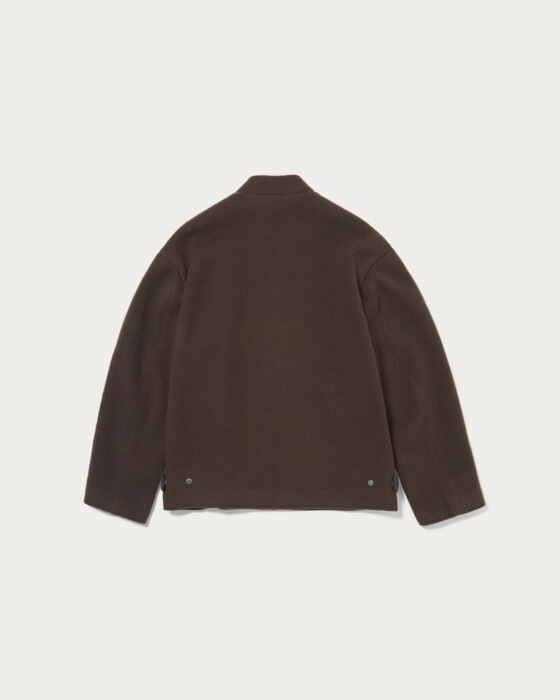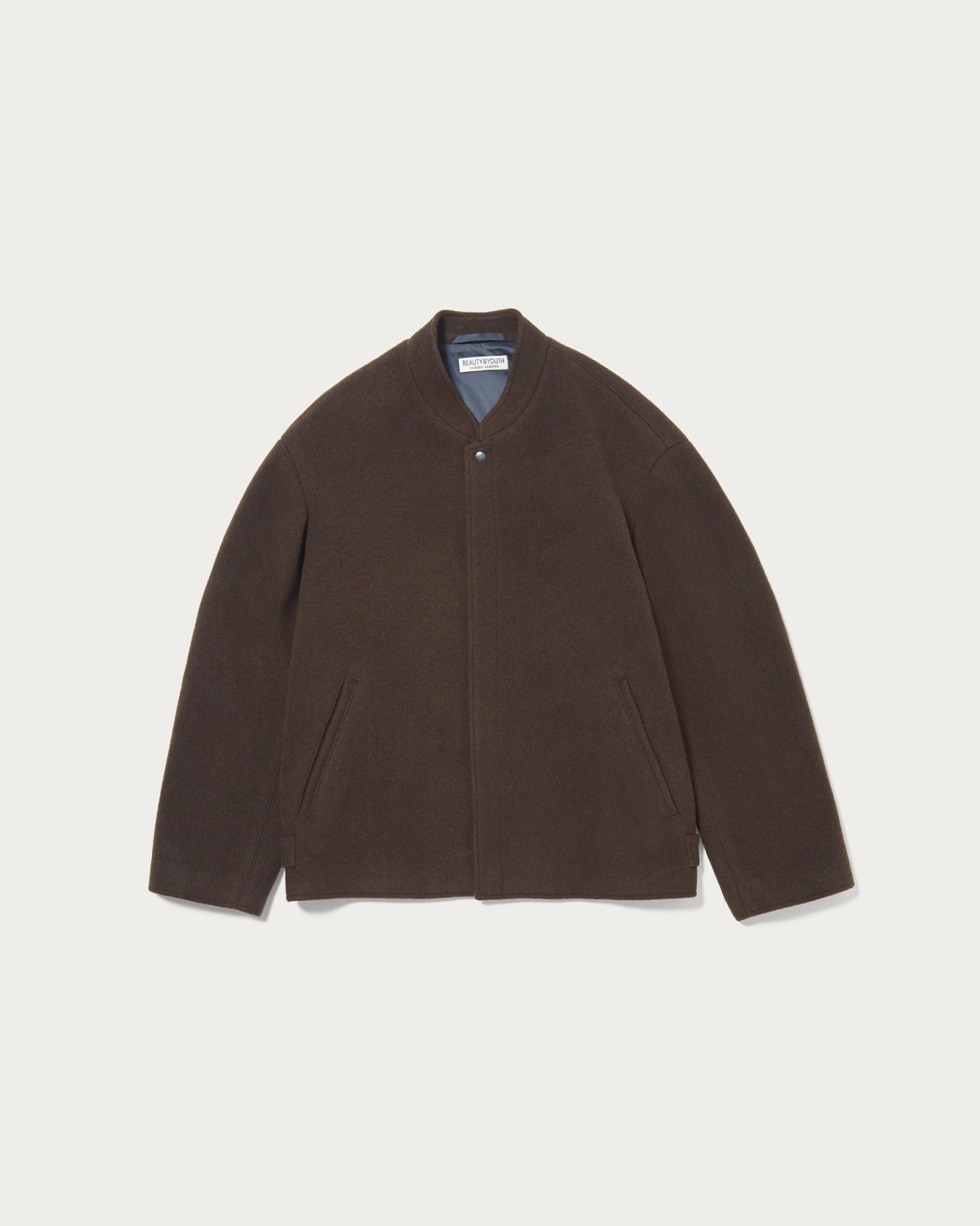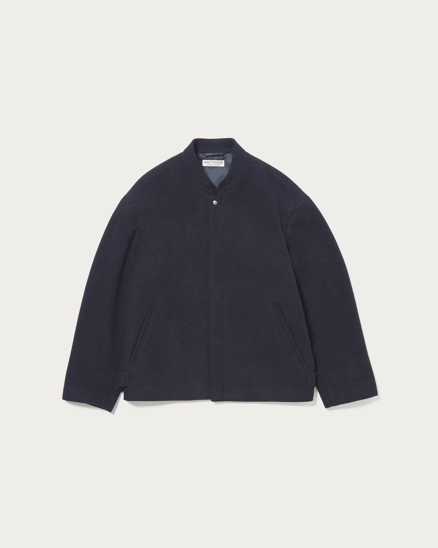 すっきりとした衿まわりノーカラーショートブルゾンに仕上げたノーカラーショートブルゾン。縮絨と起毛させた、モッサー仕上げ加工のメルトンを別注にて作製。ソフトで膨らみのある手触りが特徴で、ブルゾン丈でも暖かく冬を過ごせる厚みです。
