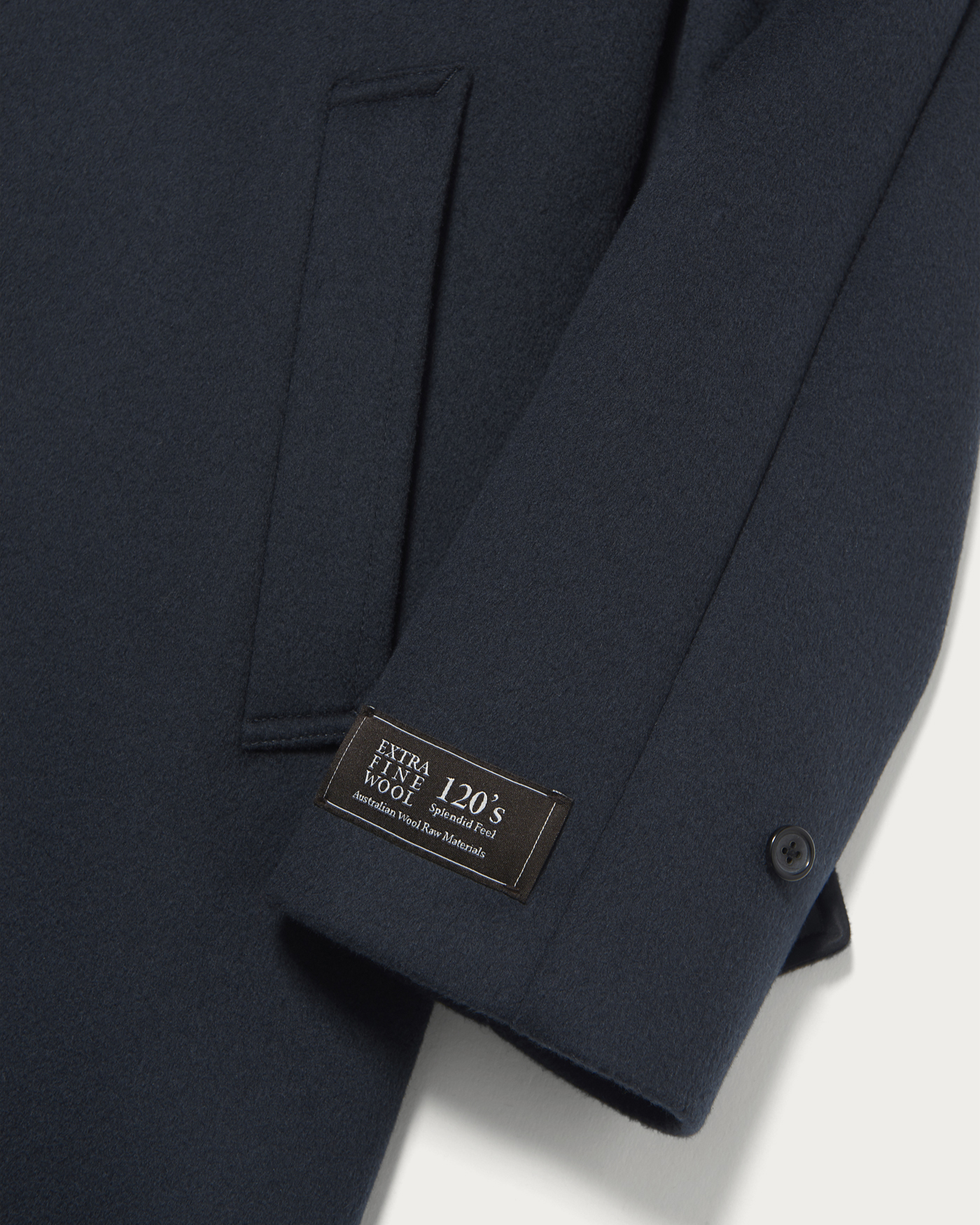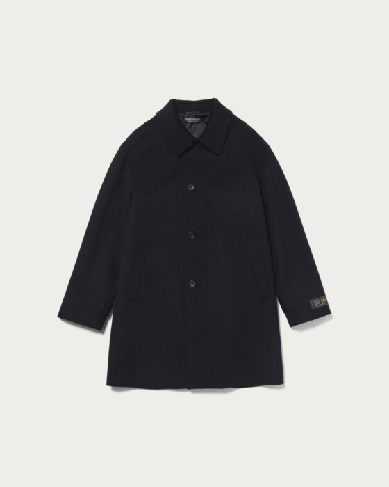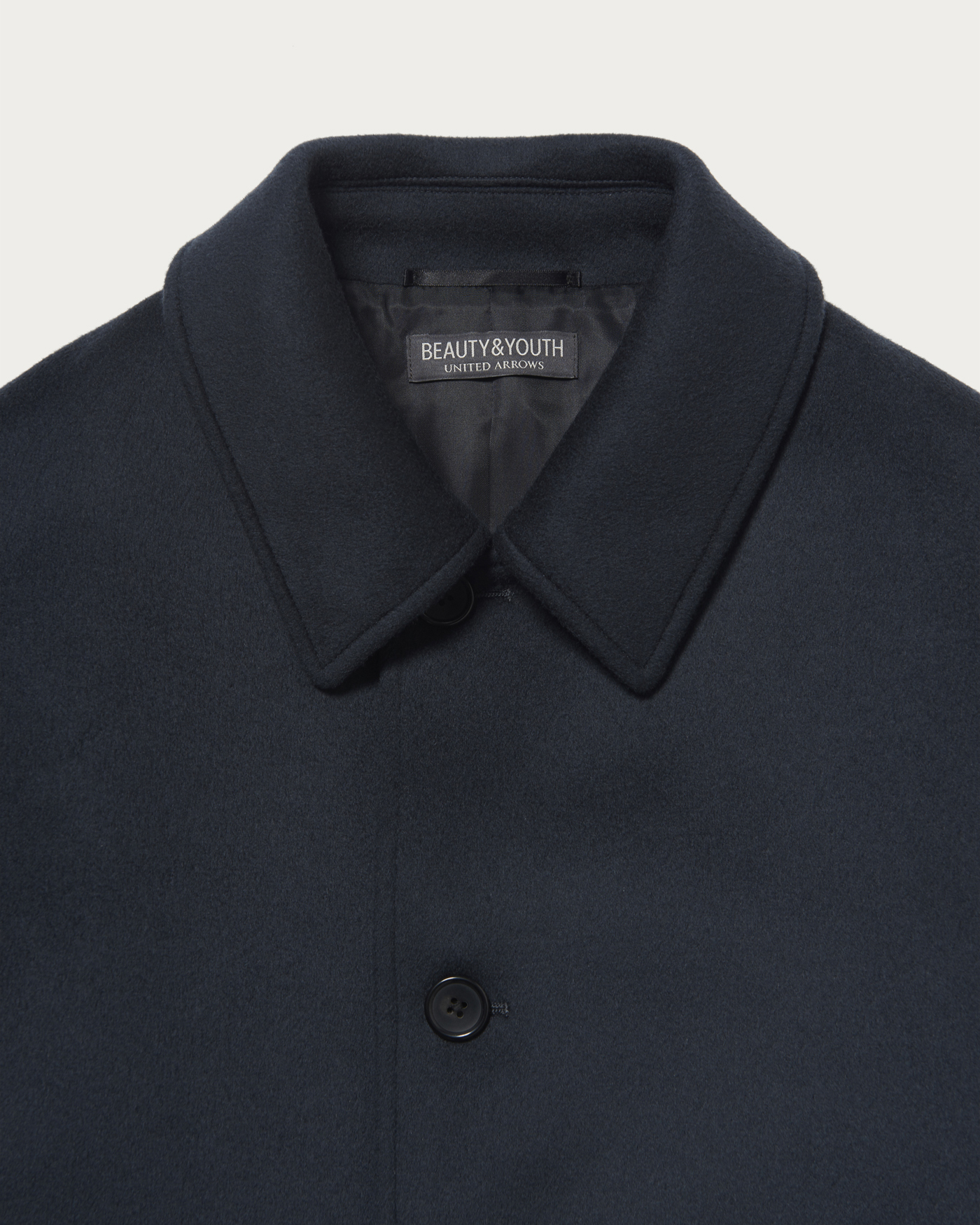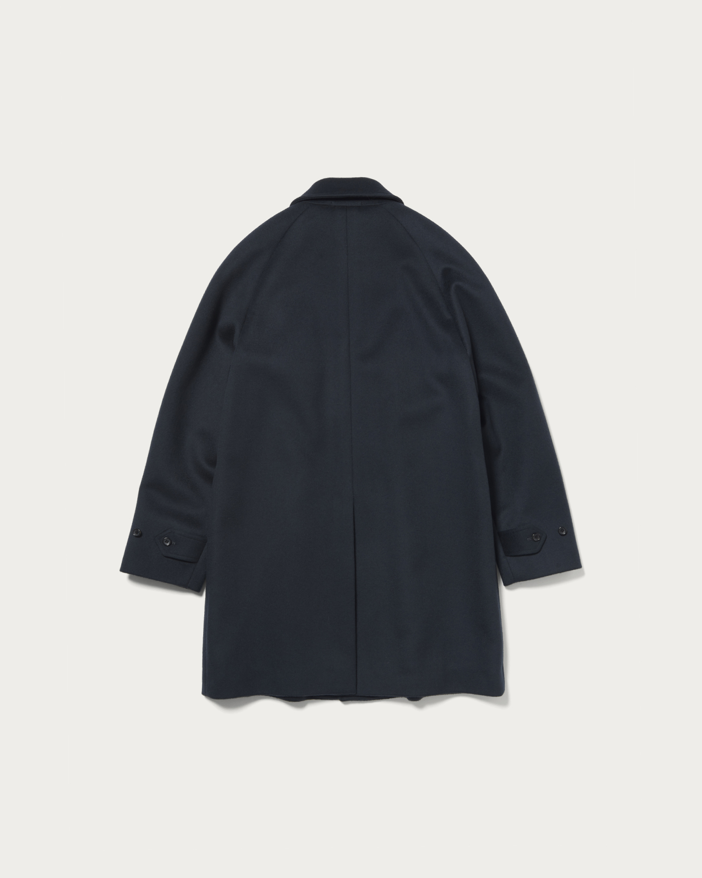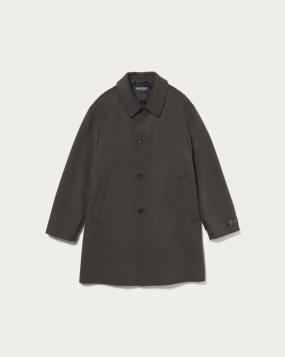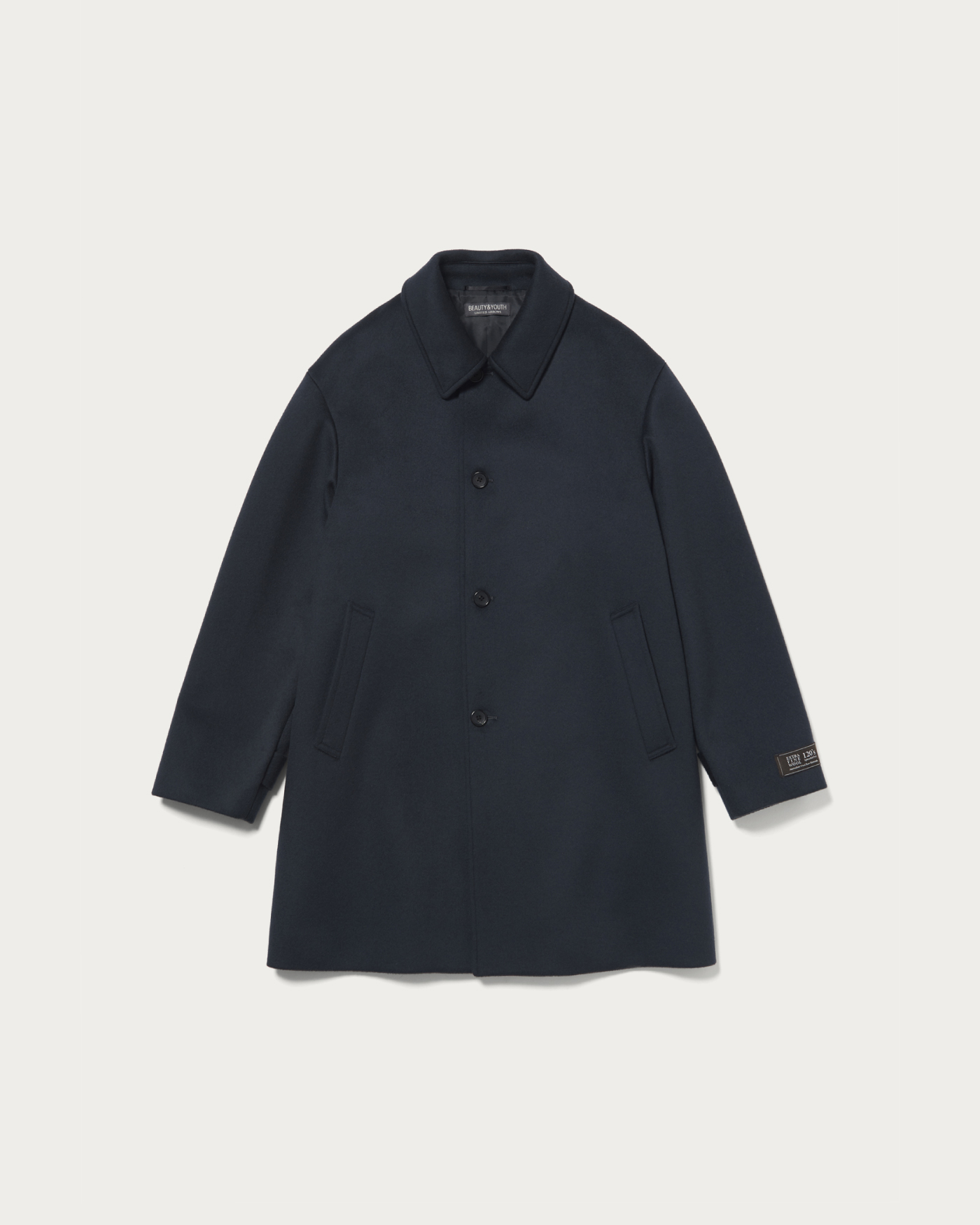 コンパクトに着用できるAラインシルエットで、着丈が長すぎないのも暖冬気候に合うデザインです。裾に配したチンタブを使用し、立ち衿として着用が可能です。さらに素材はスーパー120s別注メルトンを使用しウール75%全てに原毛自体が長いスーパー120sを使用し、滑らかさと上品なツヤを生地に与えました。また、二重織にすることで生地に厚みとしなやかさを付与し、より立体的に仕上がっています。