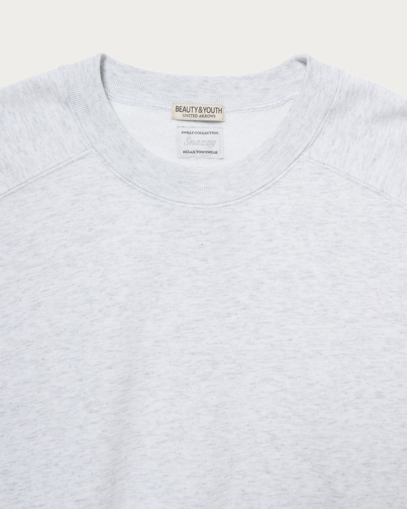 〈ビューティー&ユース〉のスウェットコレクション。クルーネックは身幅広め、着丈やや短めのシルエットがポイント。バイオシルケット加工を施し、表面の毛羽をなくした綺麗な表情がクリーンな雰囲気がポイントです。
