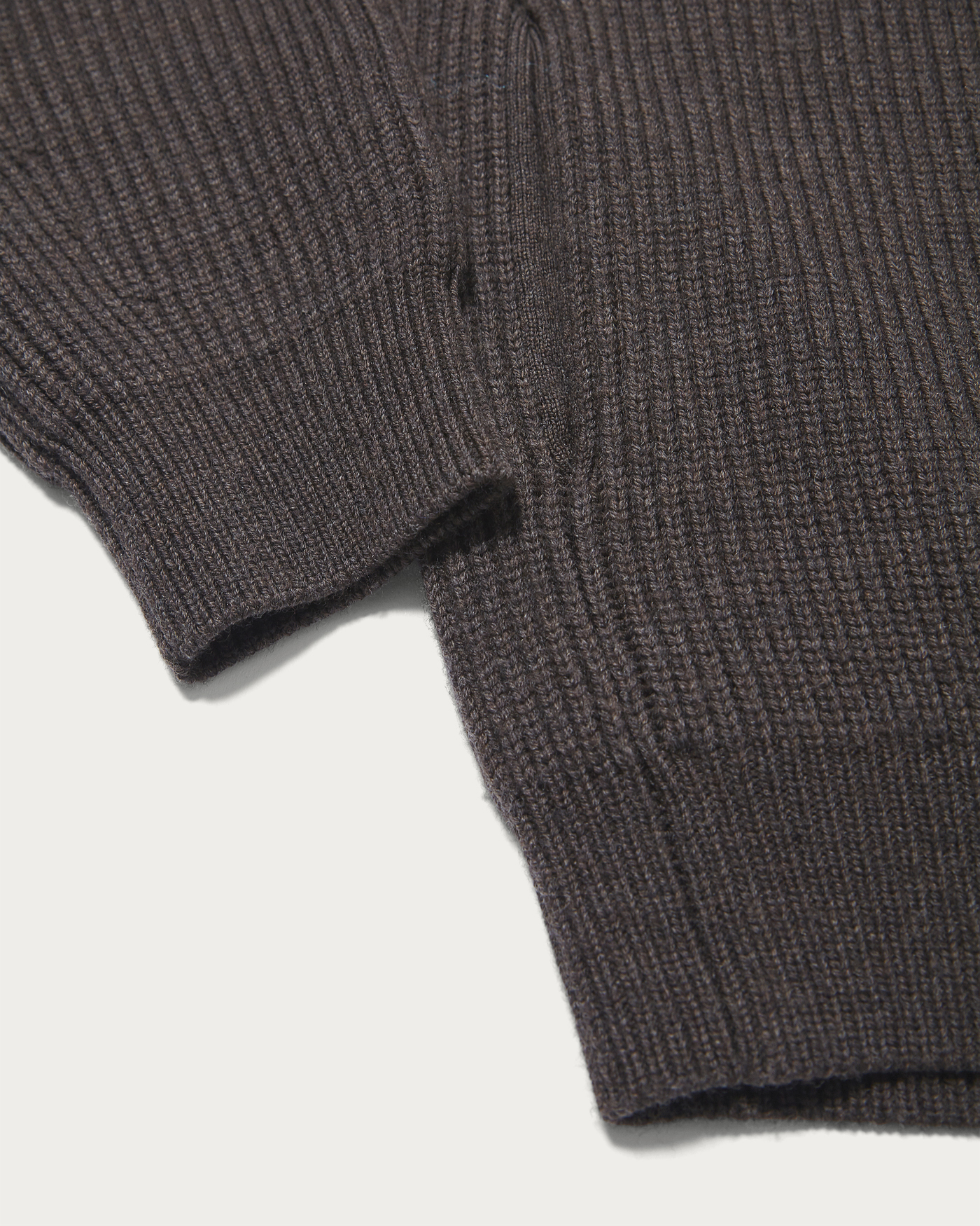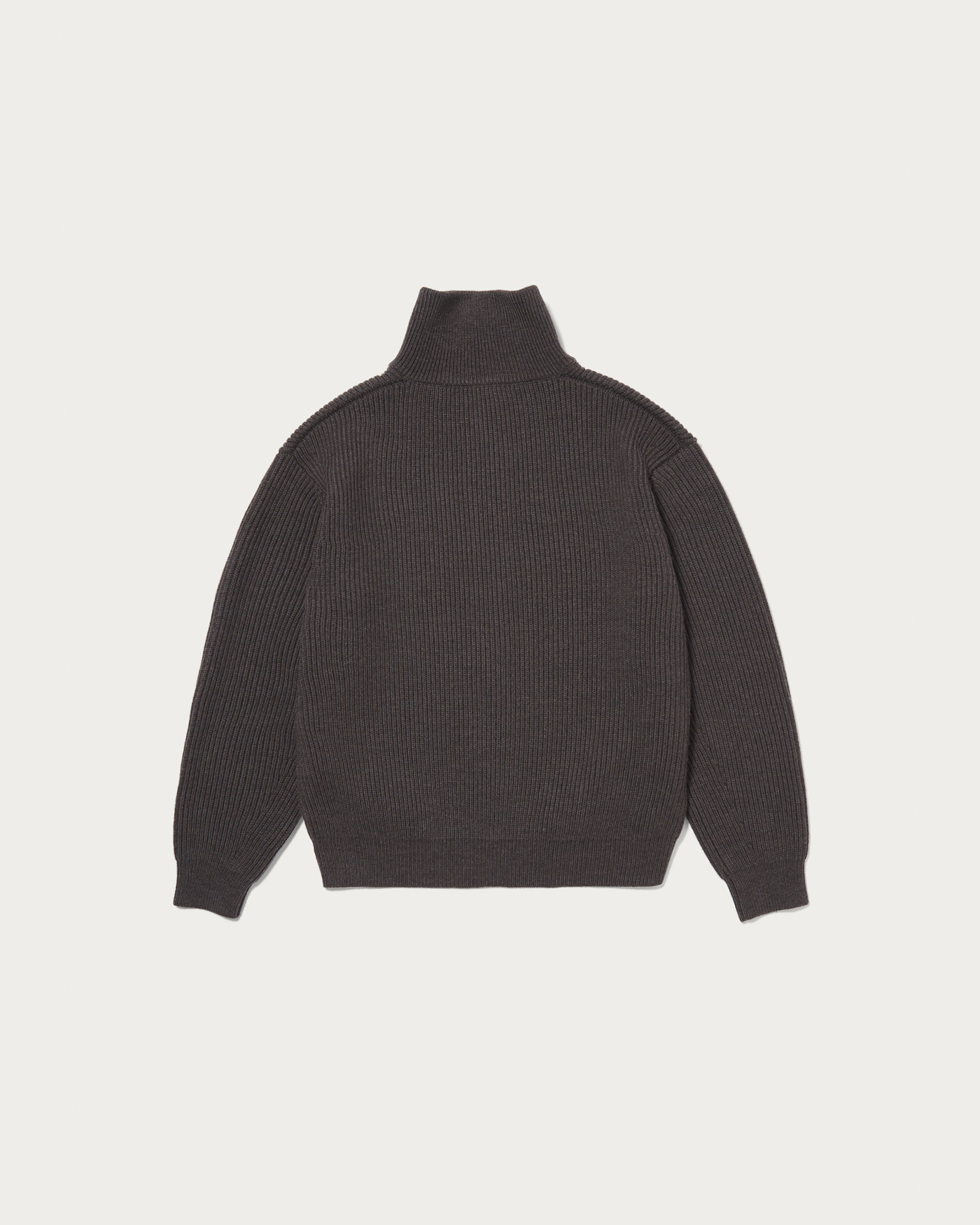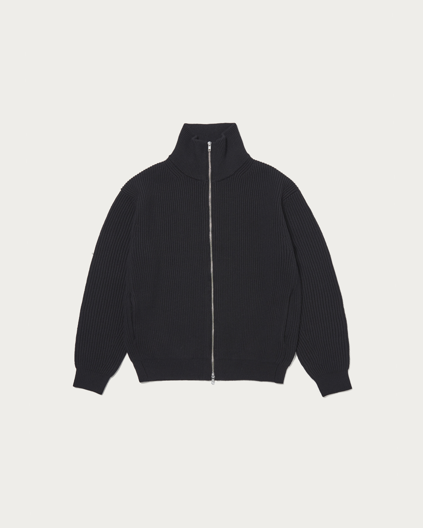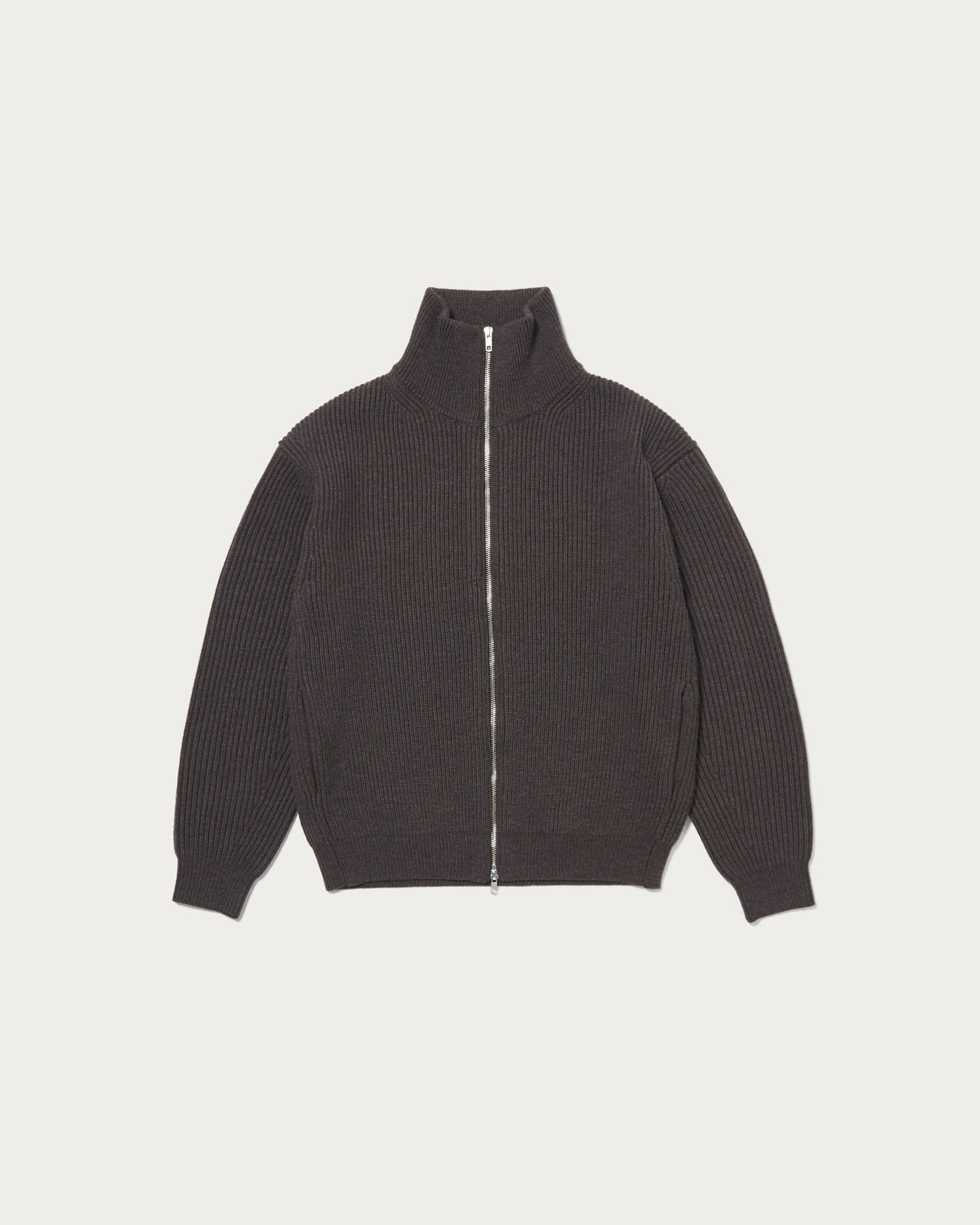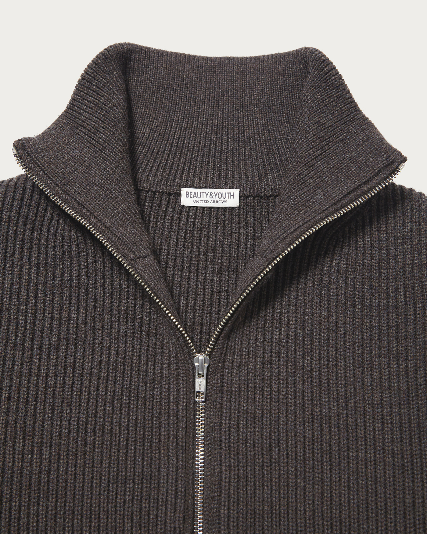程よくリラックス感のあるサイジングが特徴。ファスナーを上まで閉じた際も、衿を開けた状態でも美しく決まるように、バランスにこだわりました。さらに、光沢感を引き立てるメタルファスナーが、洗練された印象をプラスするポイントです。""質の良いウーステッドウールと安定感を担保するポリエステル糸をプレーティング編みして仕上げた立体的な畦編みボディ。アウターとしても十分な安定感と存在感を備えたボディに仕上がっています。"